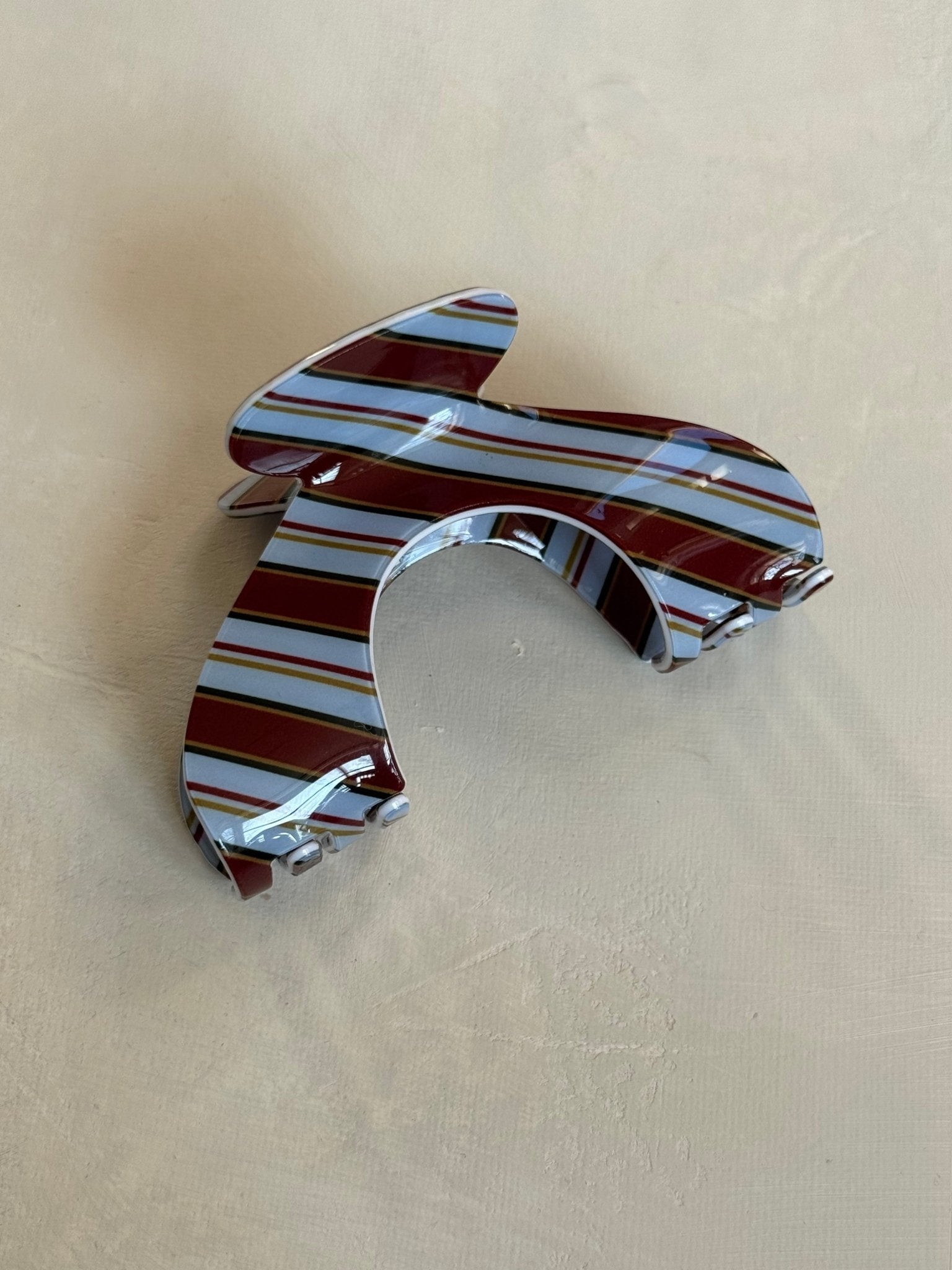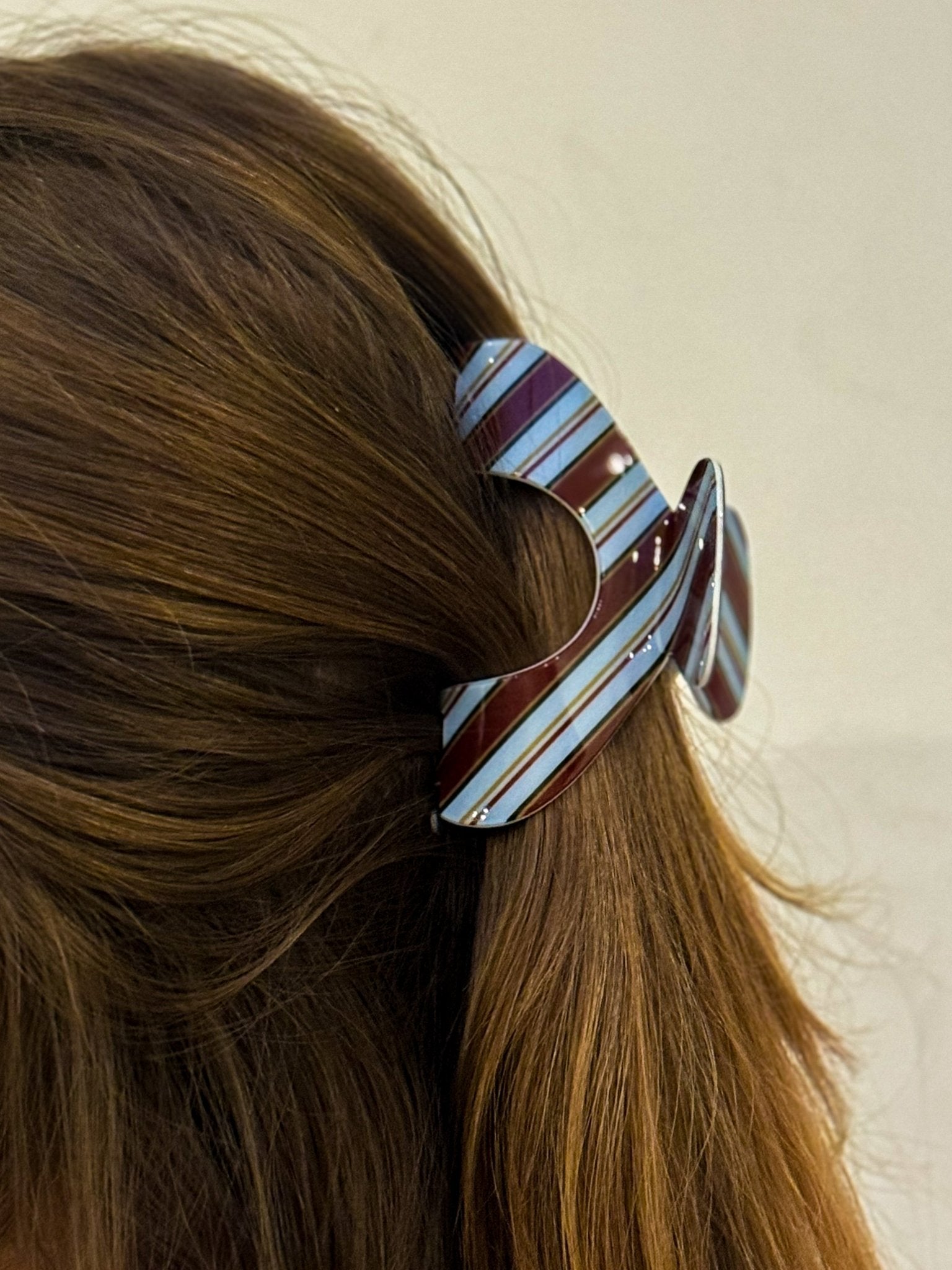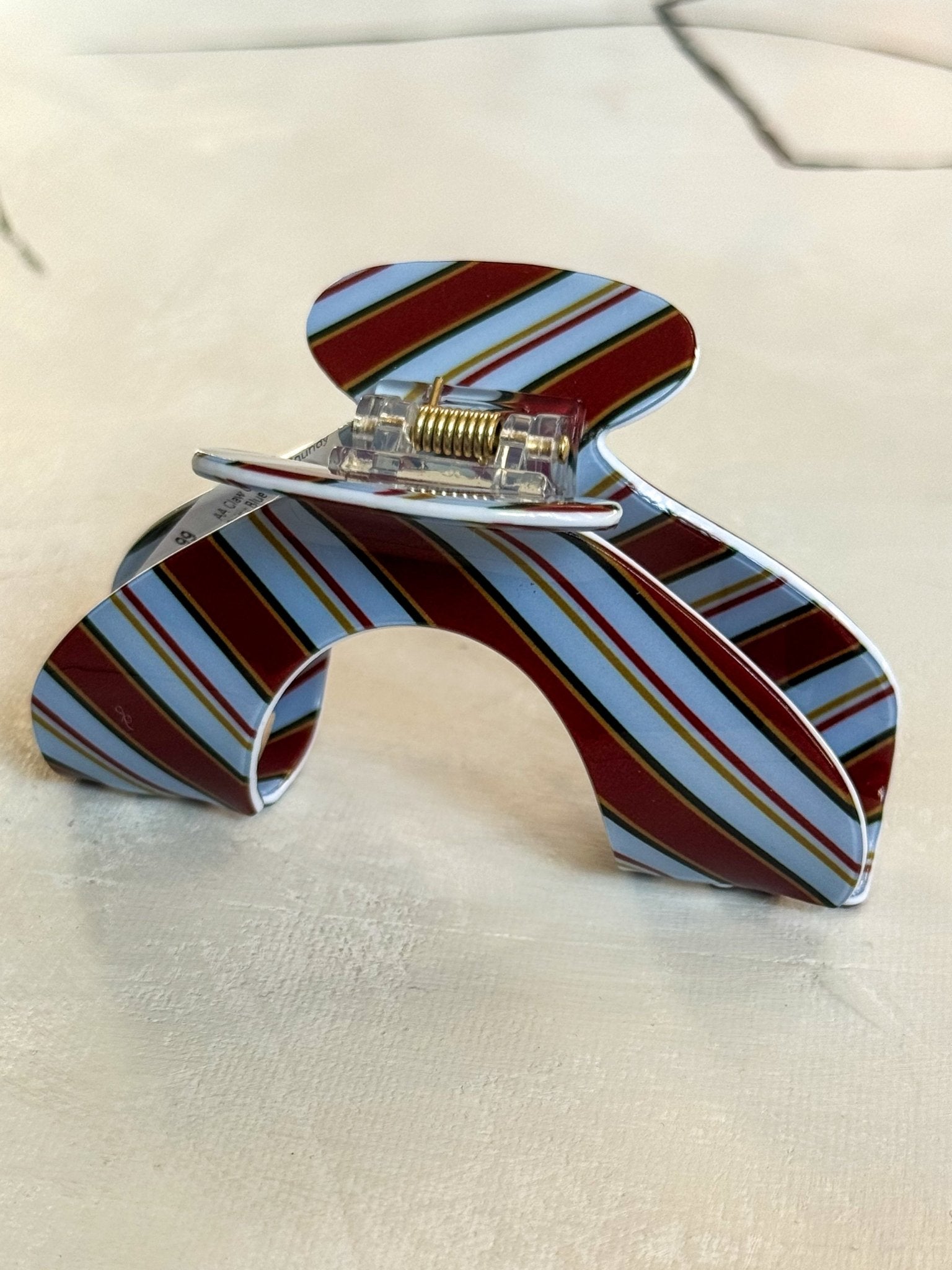 Deze haarklip is een brede, boogvormige clip met een opvallend patroon van diagonale rood-blauwe strepen.
