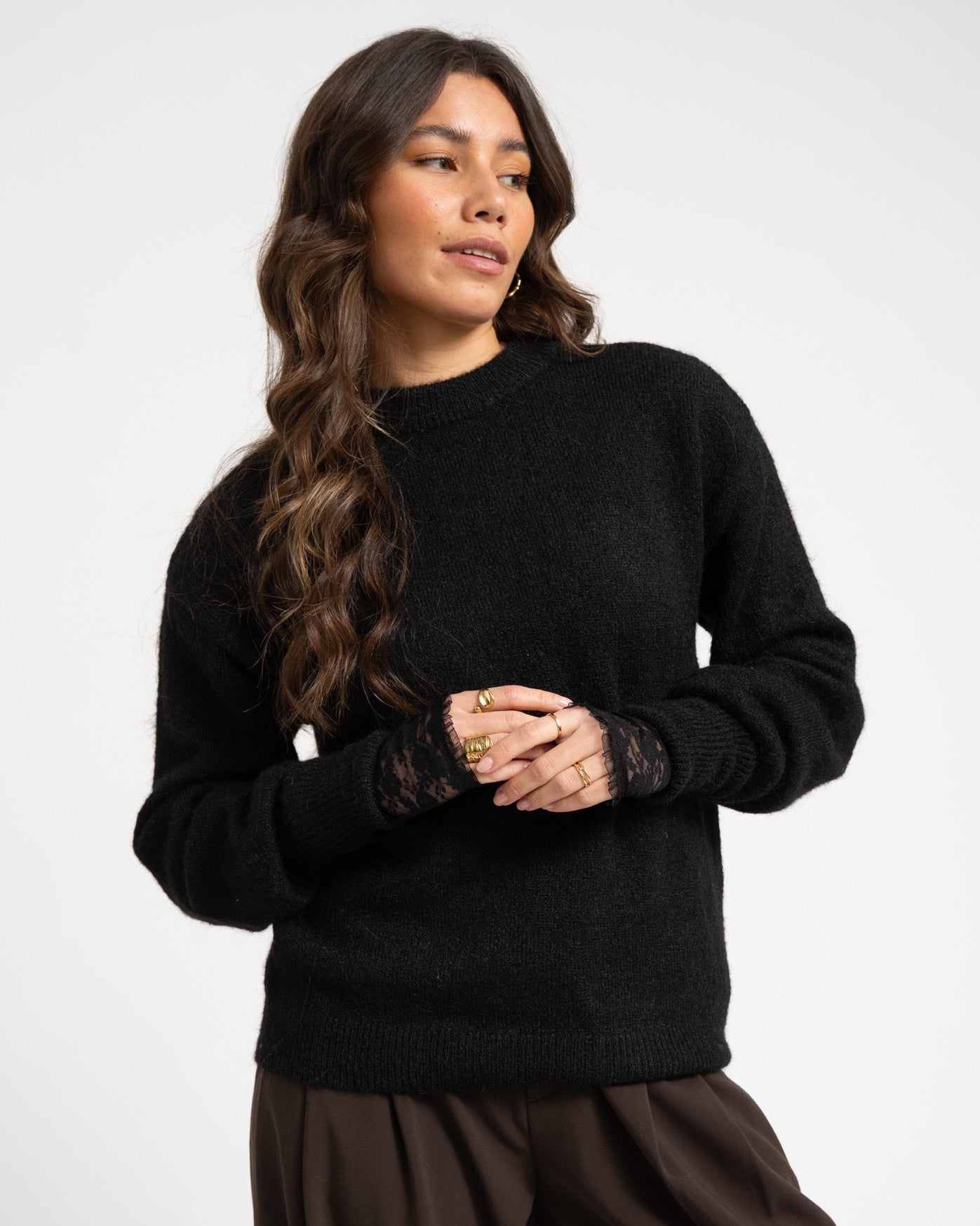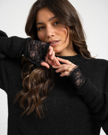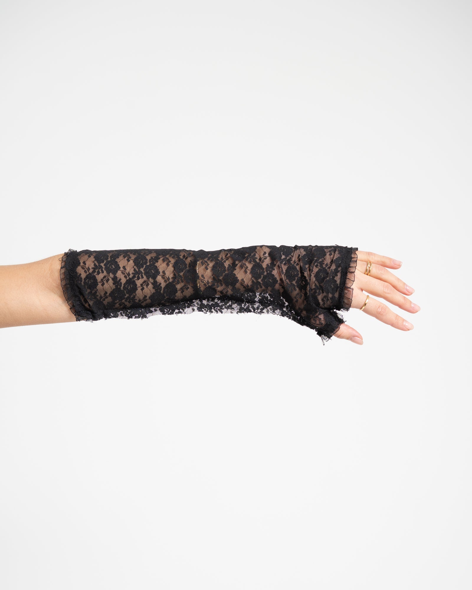 Diese schwarzen Spitzenhandschuhe verleihen jedem Outfit eine unerwartete, stilvolle Note. Tragen Sie sie unter einem Pullover für einen dezenten, einzigartigen Akzent. Perfekt, um Ihrem Look das gewisse Extra zu verleihen.