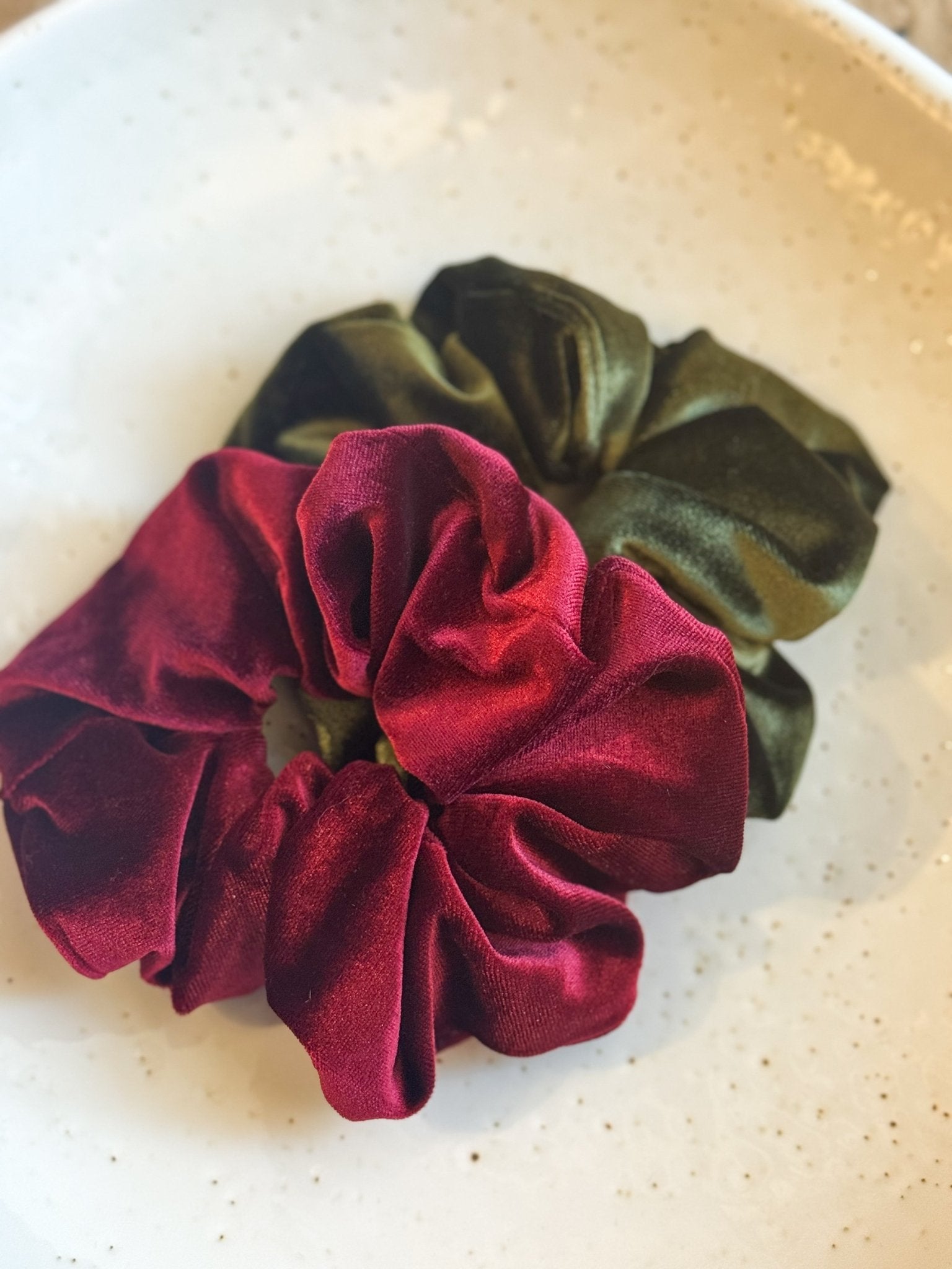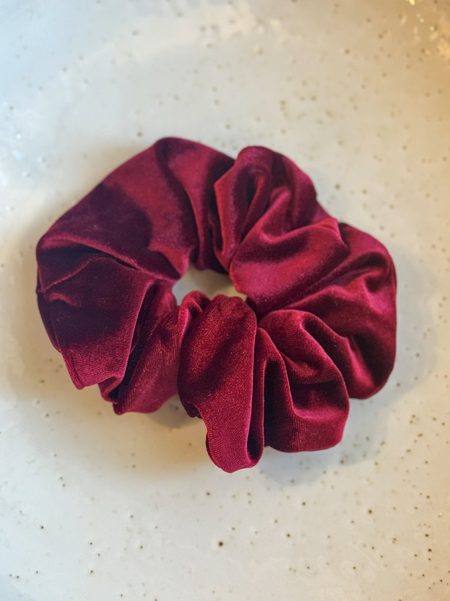 Ein dunkelrotes Haargummi aus Veloursstoff.
