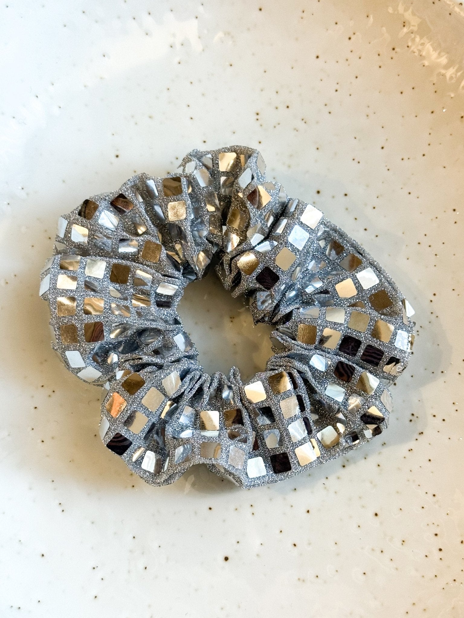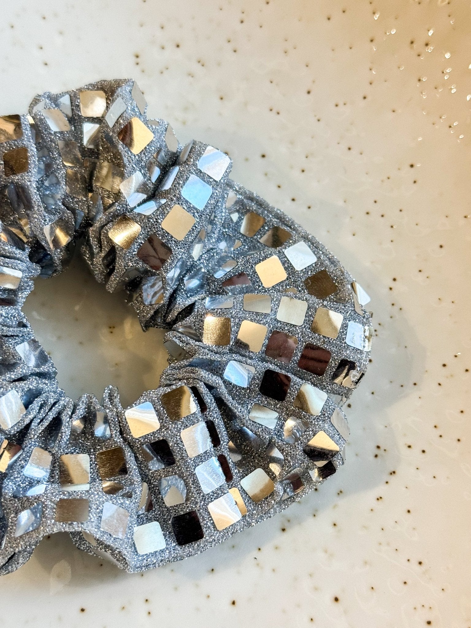 Ein funkelndes silbernes Haargummi mit Mini-Spiegeln, das jedem Look eine festliche, luxuriöse Note verleiht.