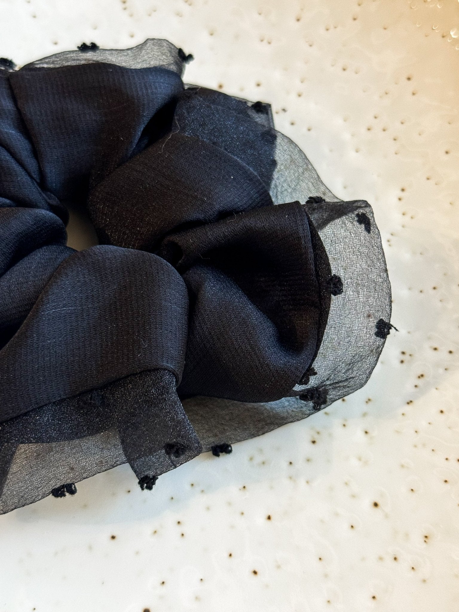 Een scrunchie met een mesh randje met polkadots.