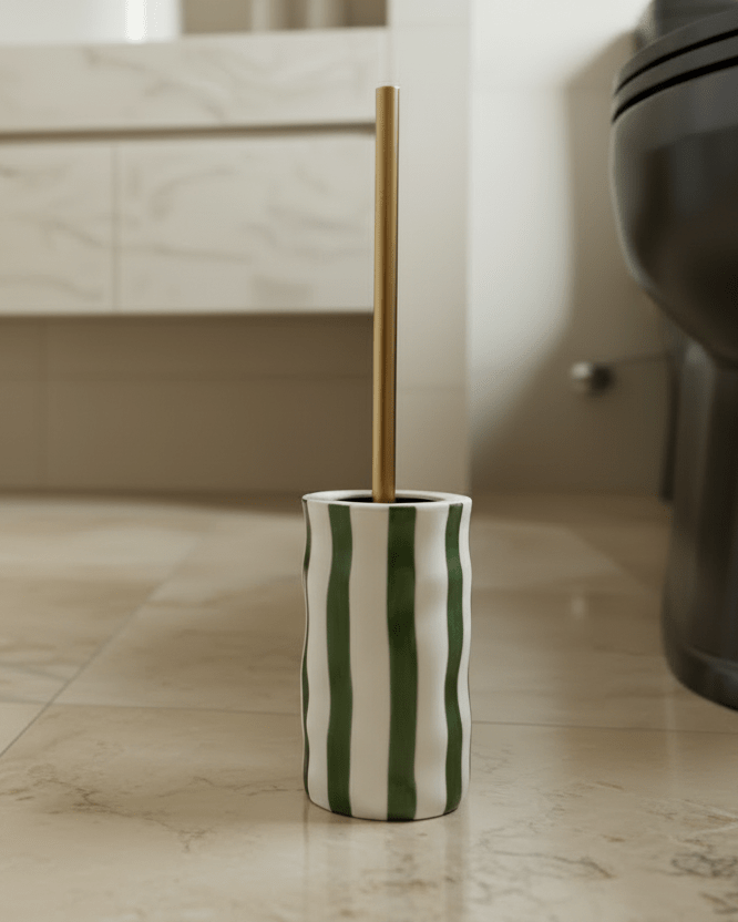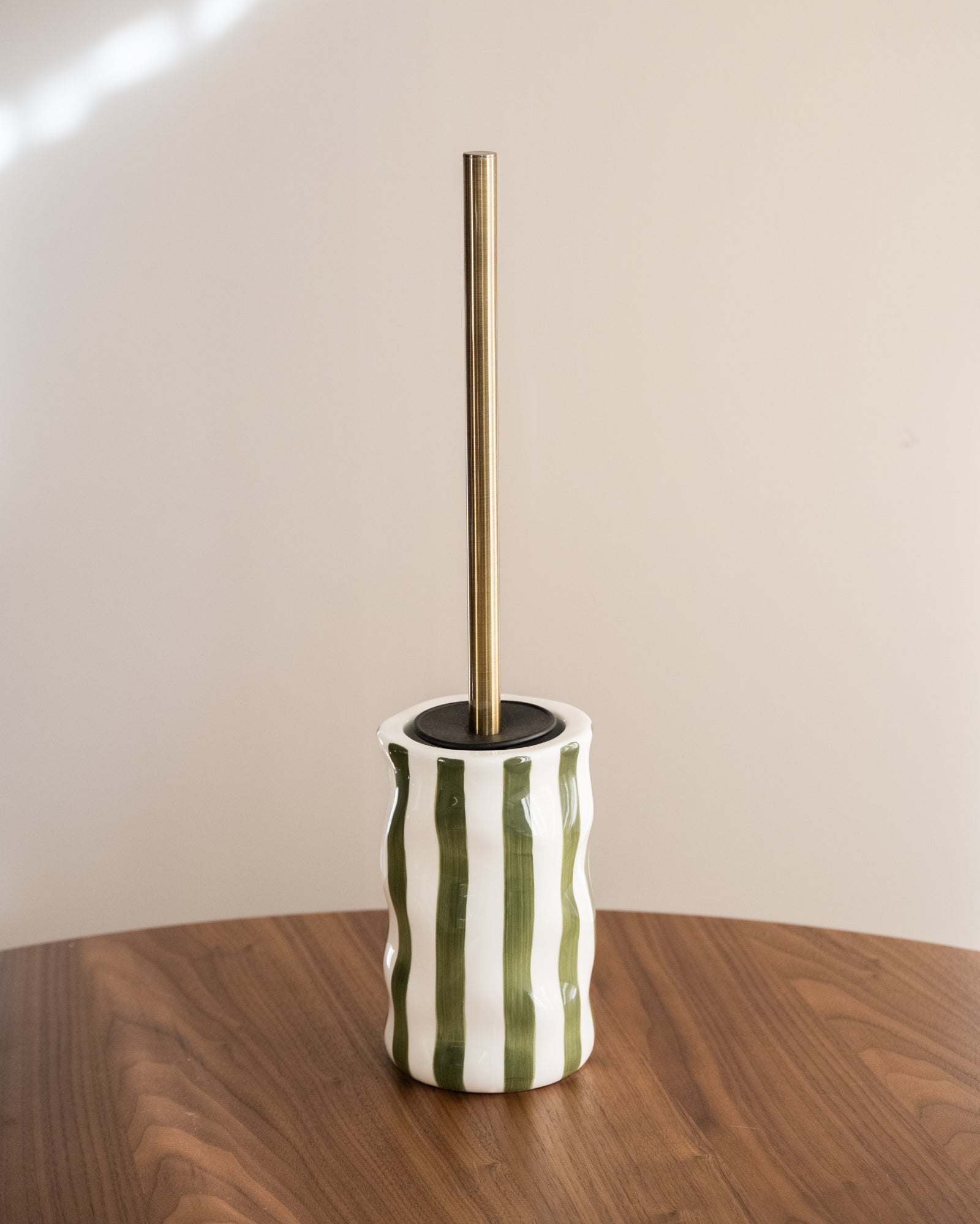 Die grüne Toilettenbürste von Corfu verleiht Ihrem WC oder Badezimmer dank ihres verspielten grünen Streifenmusters und des eleganten Designs ein frisches und stilvolles Upgrade. Sie harmoniert perfekt mit anderen Corfu-Artikeln und sorgt so für ein ruhiges und stimmiges Gesamtbild.