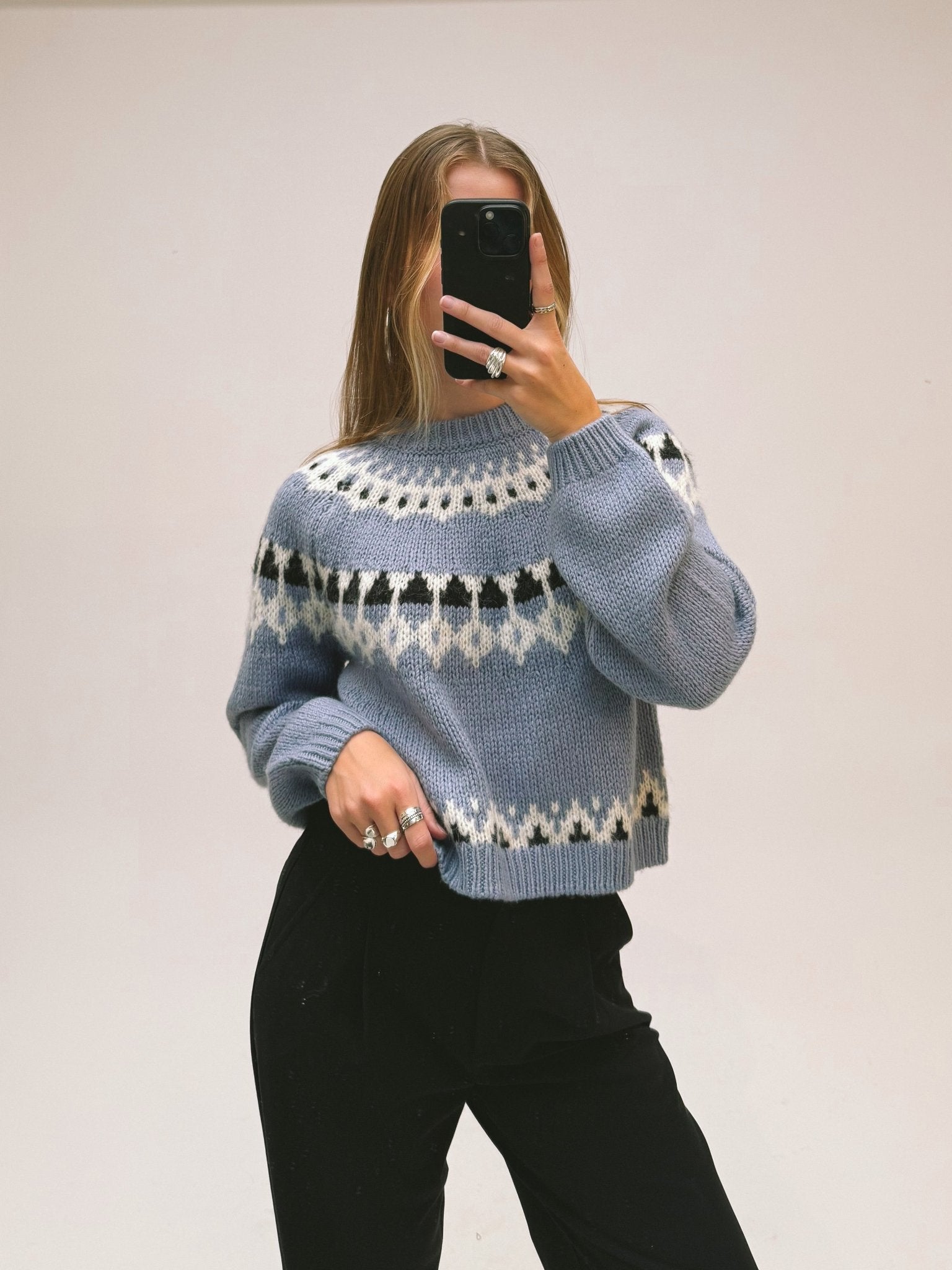 Ein kuscheliger, kurzer Strickpullover mit grober Struktur und auffälligem Muster.