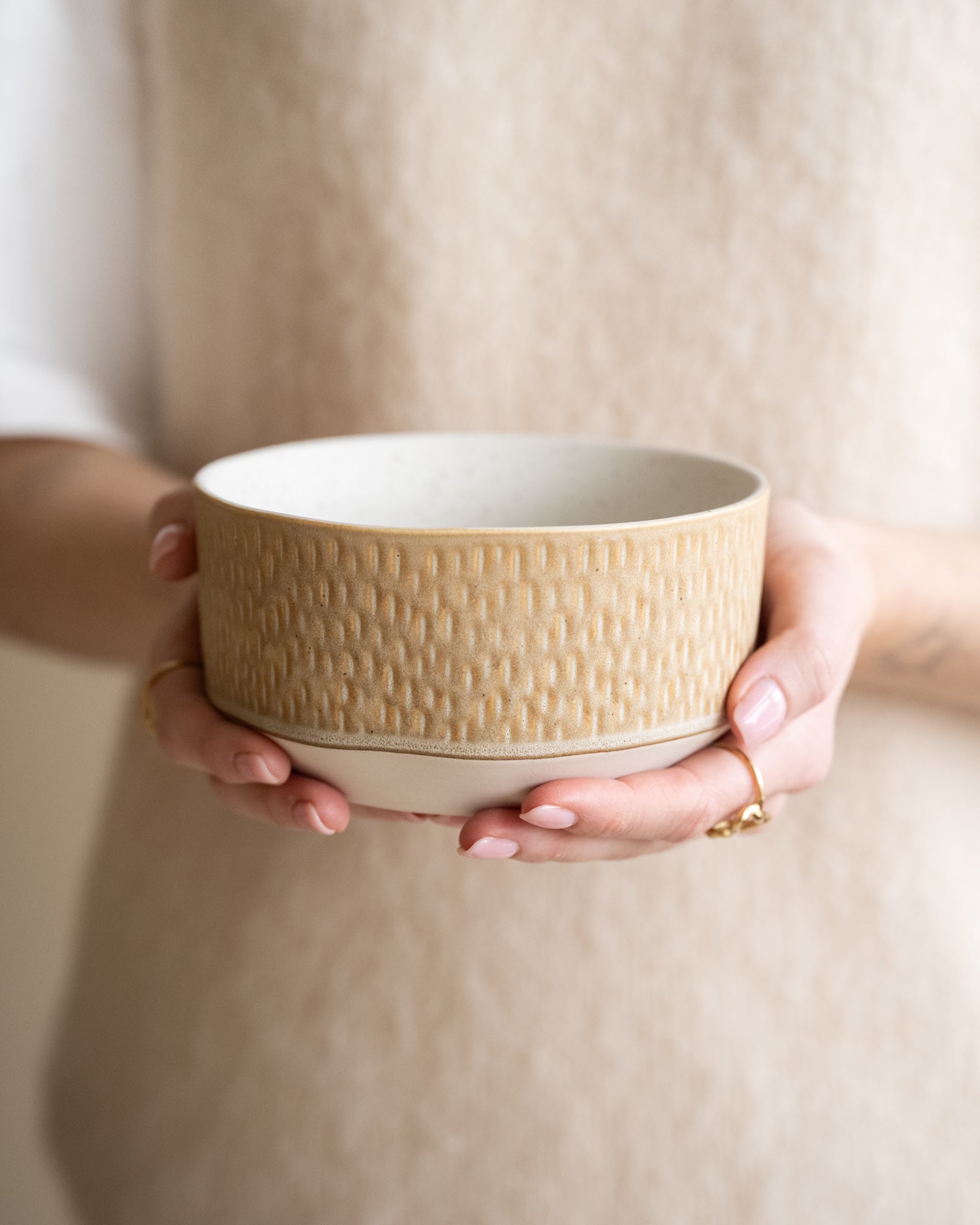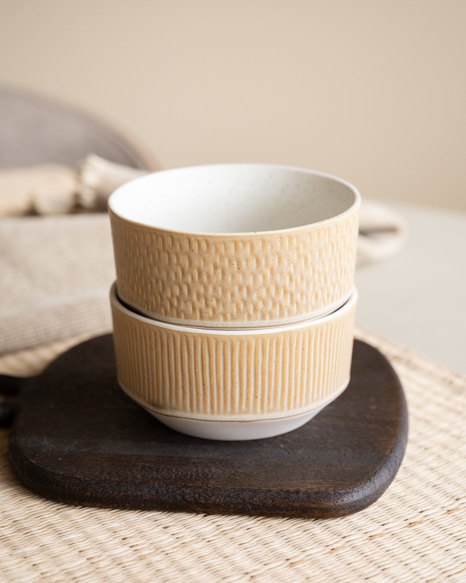 Der perfekte Mix aus Minimalismus und verspielten Details! Die Miyaki-Schalen in Beige haben ein dezentes Relief mit Streifen und Punkten, das einen einzigartigen, handgefertigten Look erzeugt. Perfekt zum Frühstück, für den Snack oder für eine stilvoll gedeckte Tafel – ein Must-have für Liebhaber moderner Tischkultur mit Charakter!