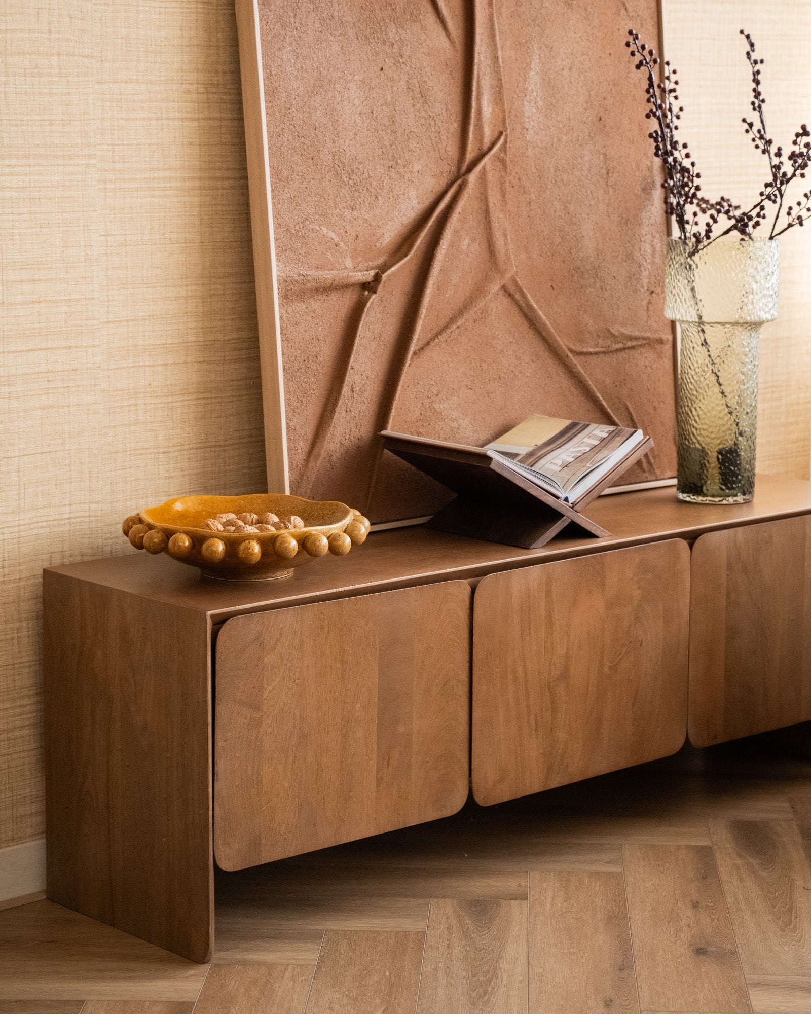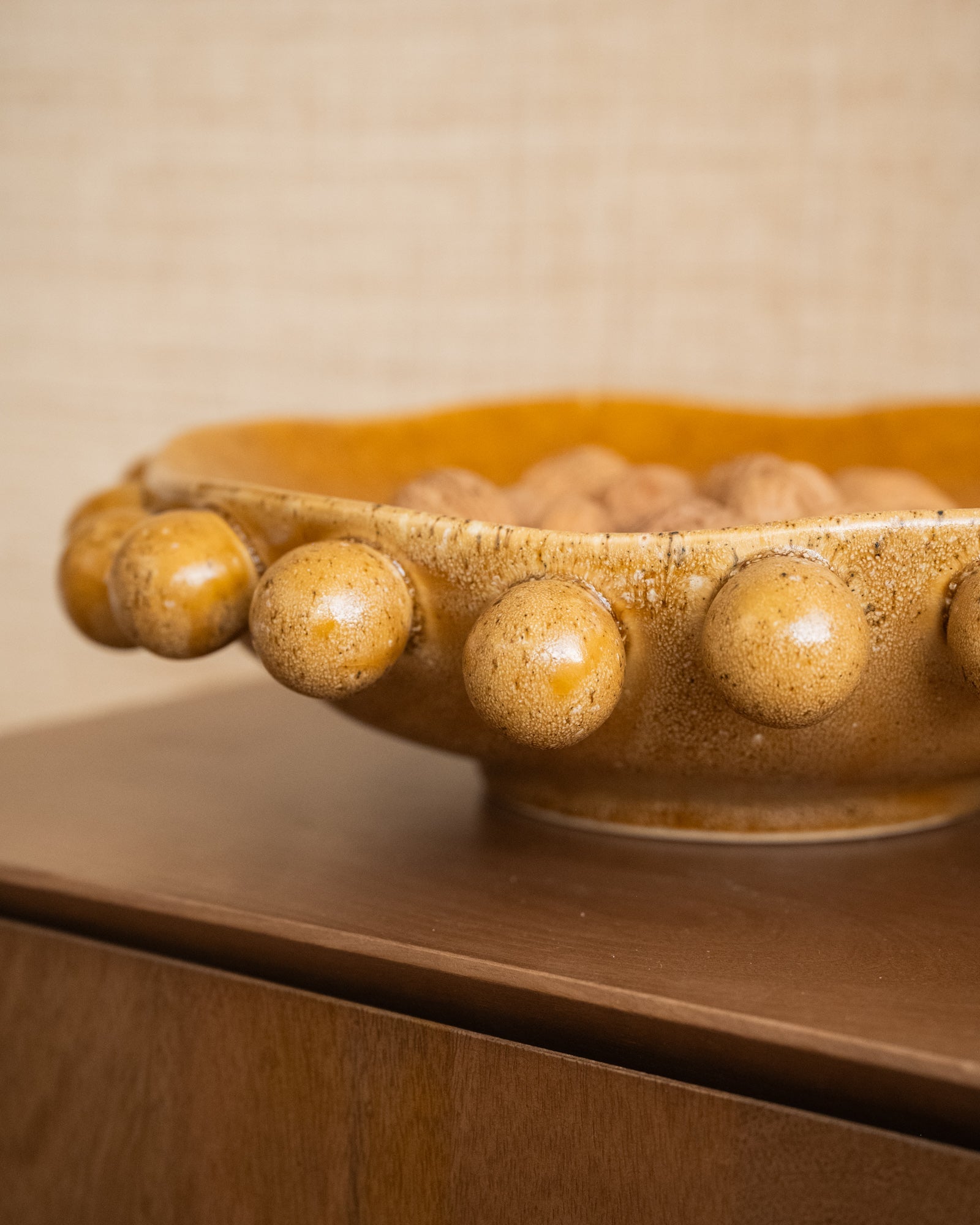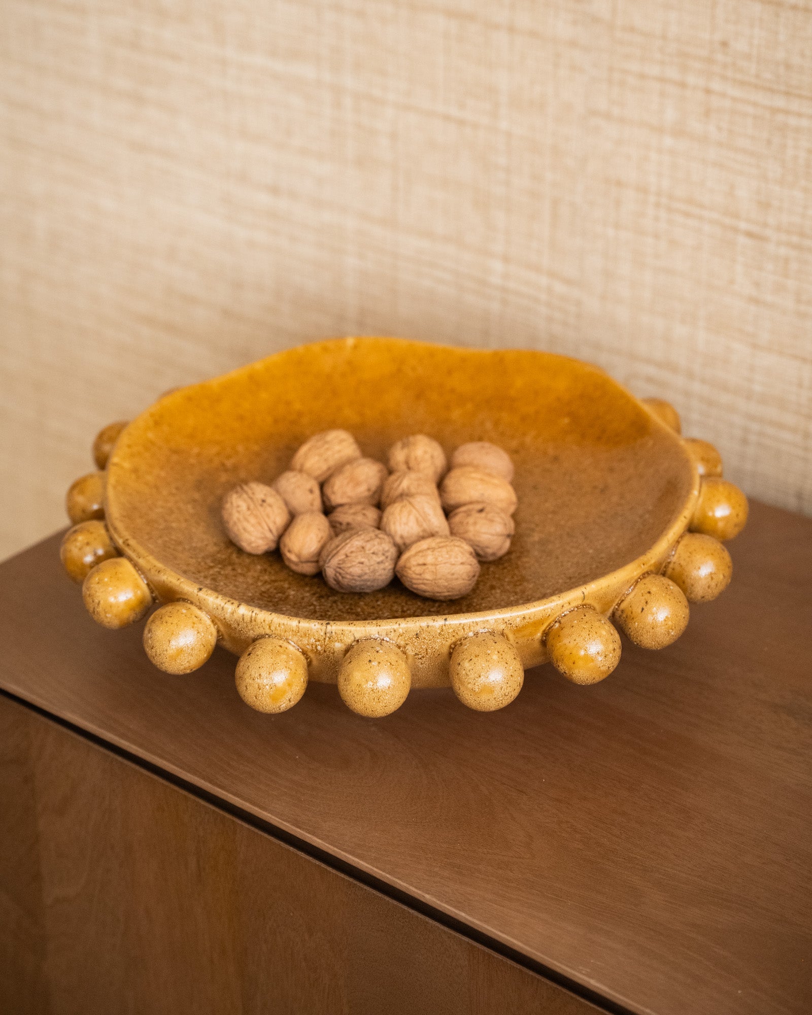 Die perfekte dekorative Schale zur Aufbewahrung Ihrer täglichen Utensilien! Mit verspielten Kugeln an der Seite und einem warmen Senfton verleiht diese Schale Ihrem Interieur einen stilvollen Touch. Nutzen Sie sie als Obst- oder Gemüseschale oder zum ordentlichen Ordnen Ihrer Schlüssel, Schmuckstücke und anderer Gegenstände.