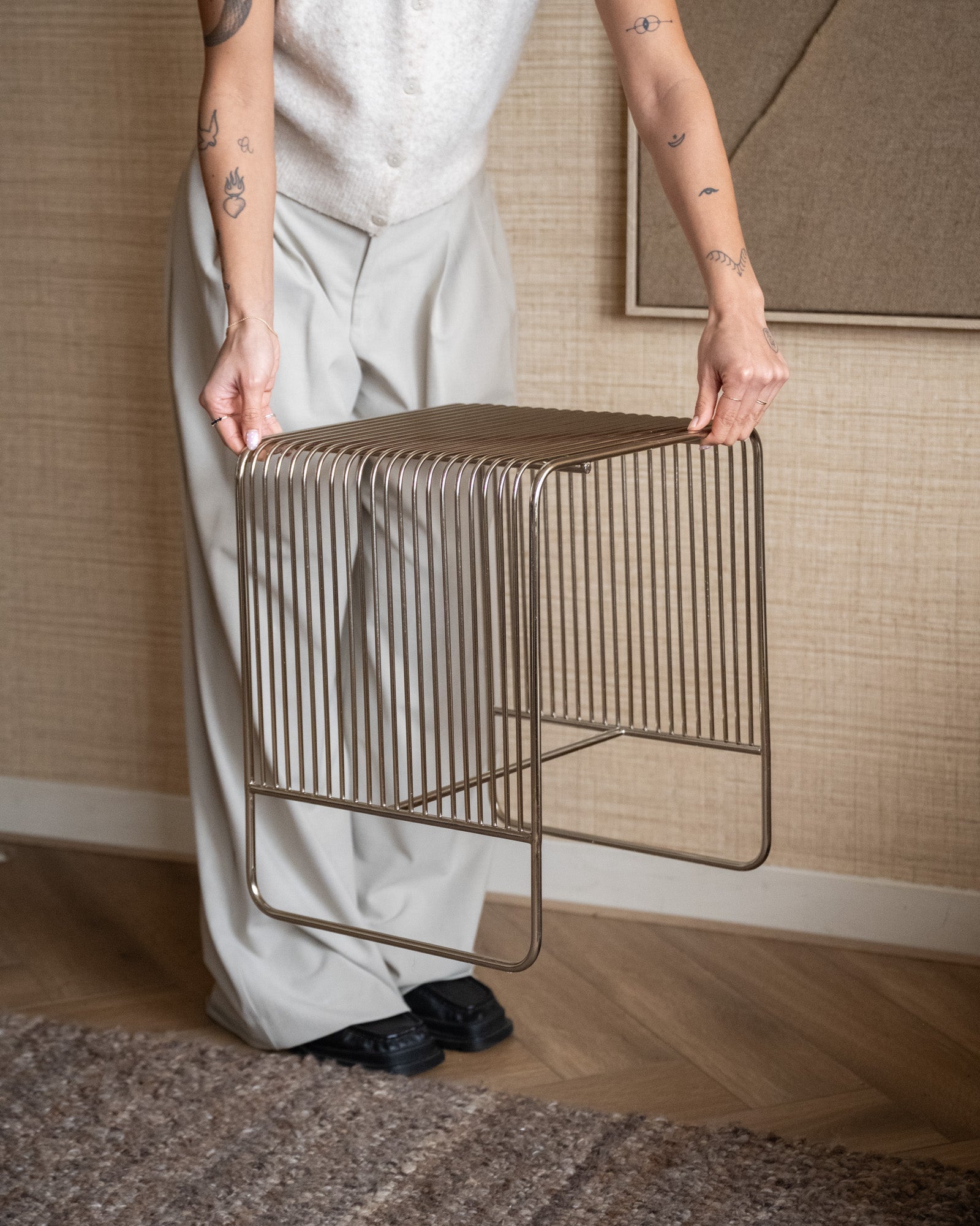 Der Beistelltisch Wireworks Chrome ist ein stilvoller Tisch mit einem eleganten Drahtgestell und einer glänzenden Chromoberfläche, der sich perfekt in ein modernes Interieur einfügt. Dank seines luftigen Designs eignet er sich ideal als Beistelltisch neben Sofa oder Bett, ohne dabei schwer zu wirken.