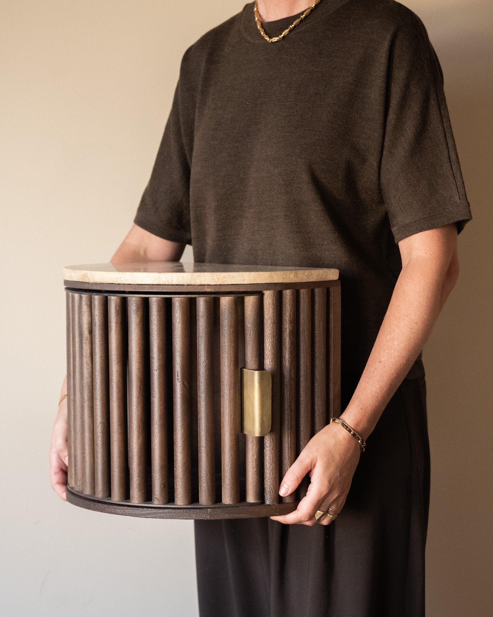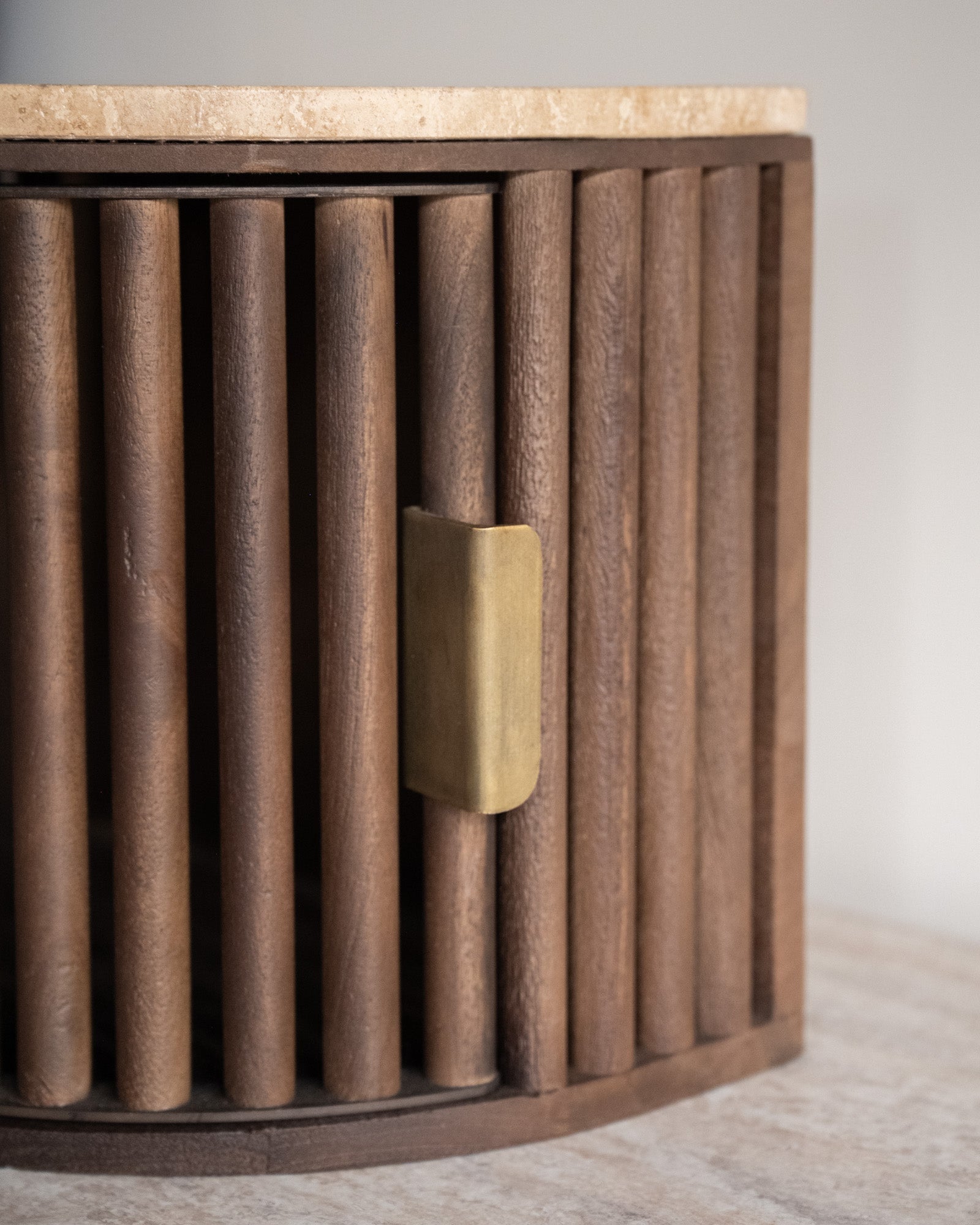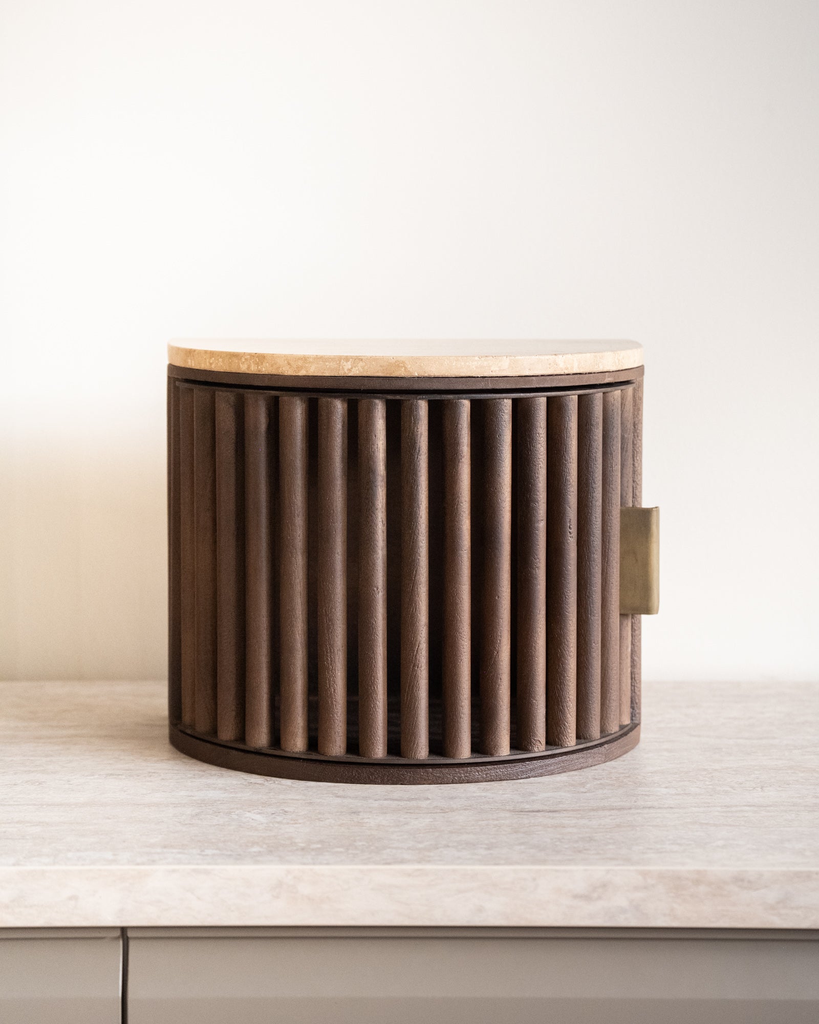 Der TILTIL Wandschrank/Nachttisch Mori ist ein stilvoller Holzschrank mit einer luxuriösen Travertinplatte. Die geriffelte Front und der Griff in Messingoptik verleihen ihm ein zeitlos elegantes Design. Er eignet sich perfekt als Nachttisch oder als schwebender Schrank im Flur oder Wohnzimmer. Exklusiv für TILTIL in Zusammenarbeit mit unserem Lieferanten entworfen!