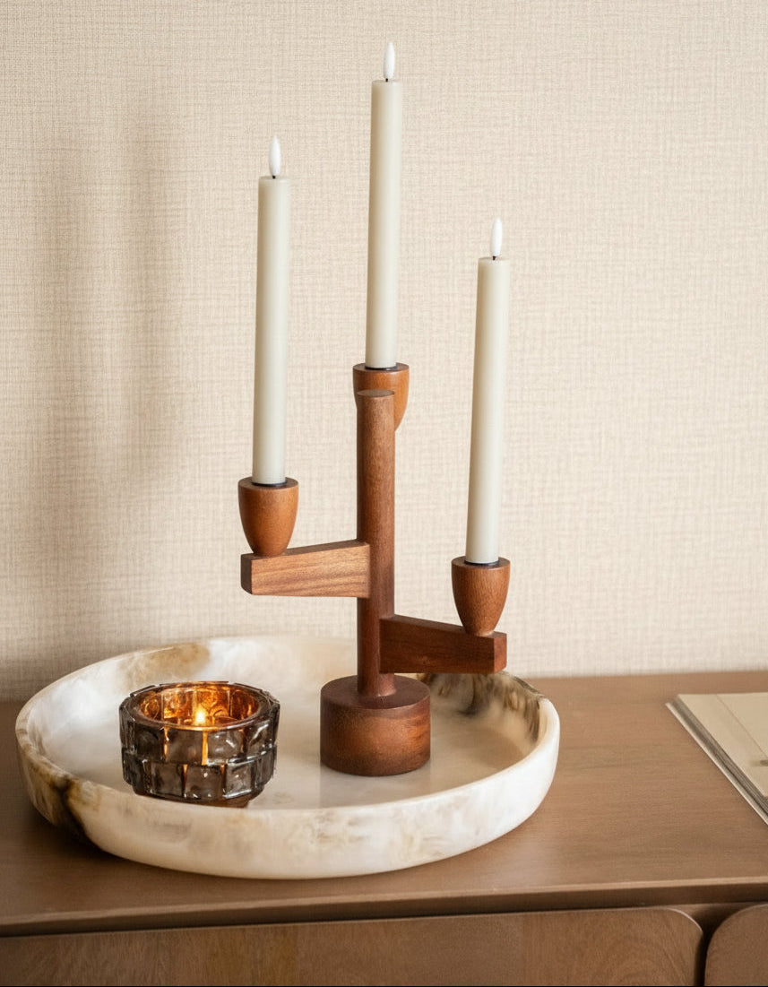 Schöner Kerzenständer aus Holz, der drei Kerzen halten kann. Perfekt für den Esstisch oder auf einer Anrichte.