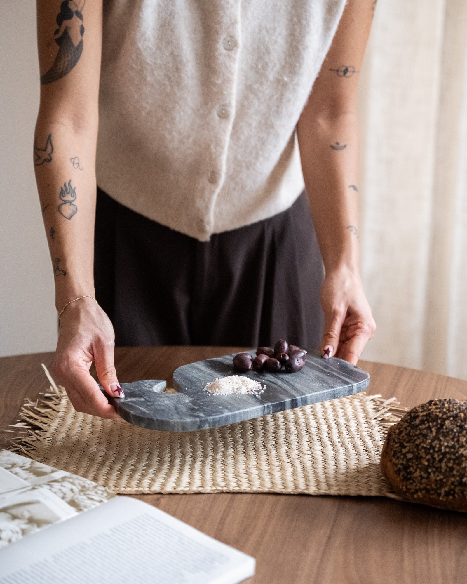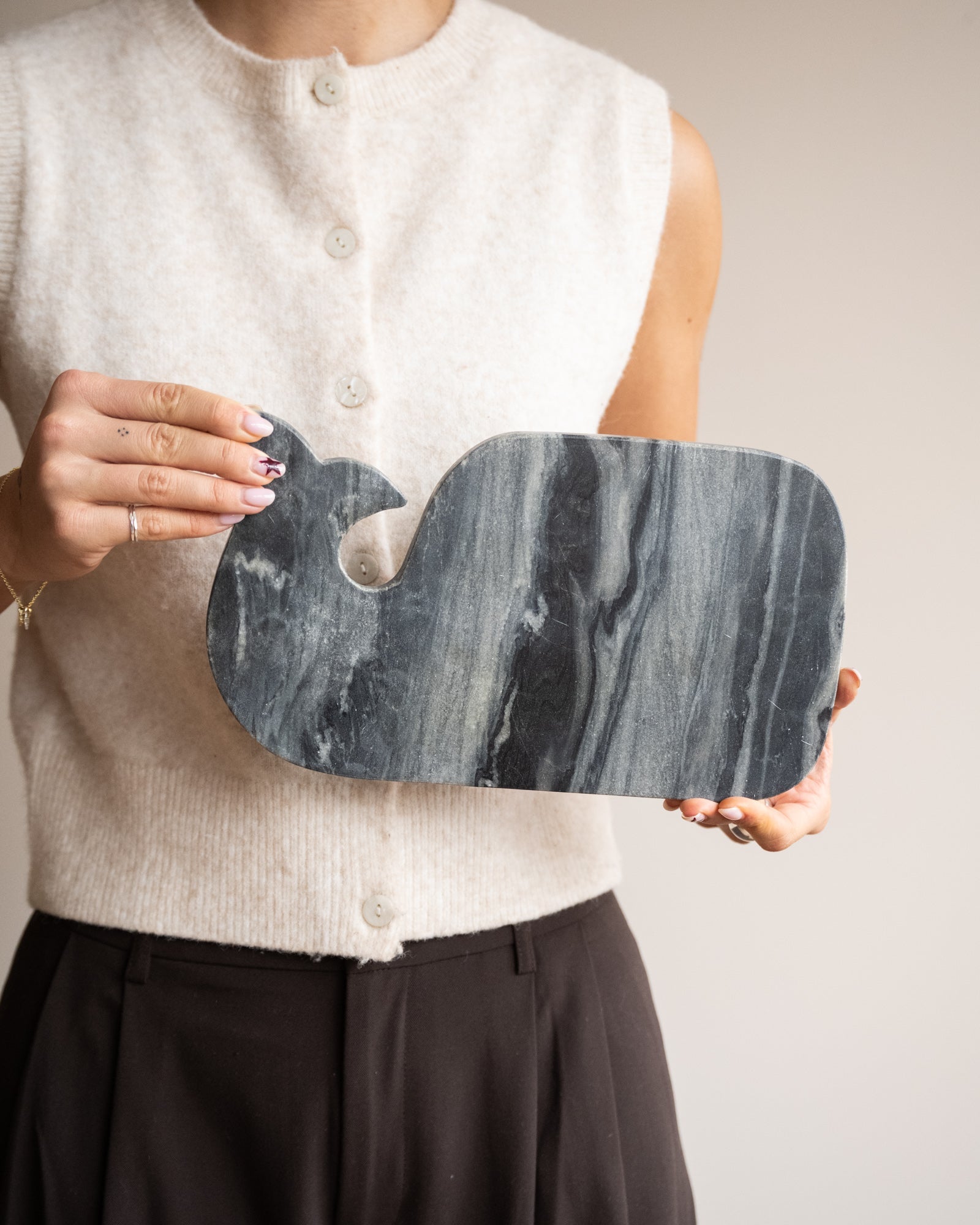 Dieses walförmige Marmorschneidebrett ist nicht nur praktisch, sondern auch ein echter Hingucker in der Küche. Perfekt zum Servieren von Käse, Tapas oder anderen Köstlichkeiten oder einfach als Dekorationselement.
