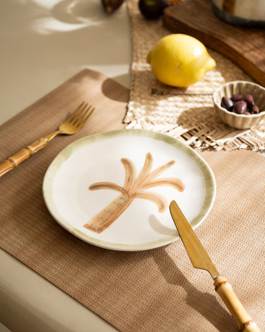 Beginnen Sie Ihren Tag mit einem tropischen Touch! Der Frühstücksteller Palm Tree Brown bringt sonnige Stimmung auf Ihren Frühstückstisch mit einem verspielten Palmenmotiv in warmen Erdtönen, eingerahmt von einem zartgrünen Rand. Hergestellt aus Steinzeug und mit dezentem Glanz versehen, eignet er sich perfekt für Croissants, frisches Obst oder ein kreatives Arrangement von Vorspeisen. Jeder Teller ist dank seiner handwerklichen Verarbeitung ein Unikat!