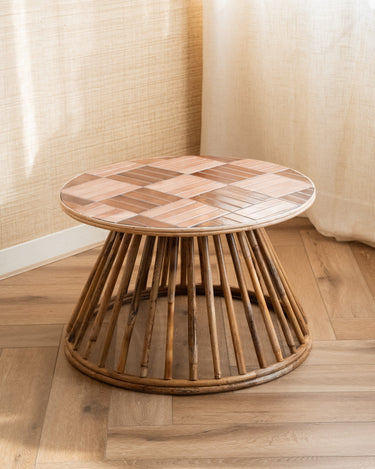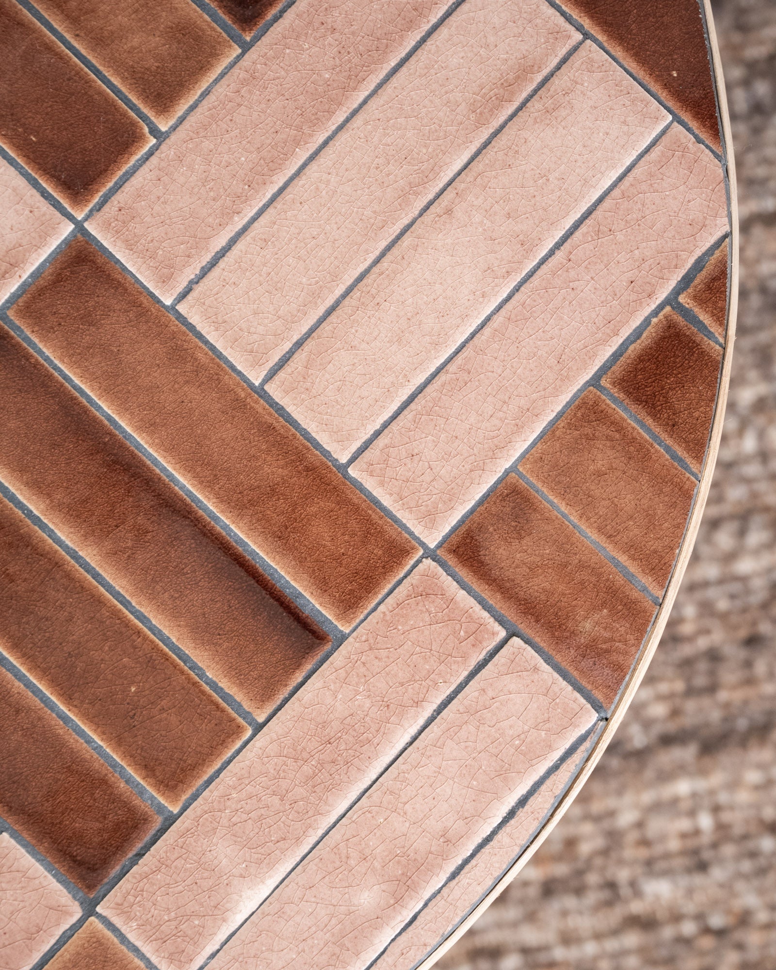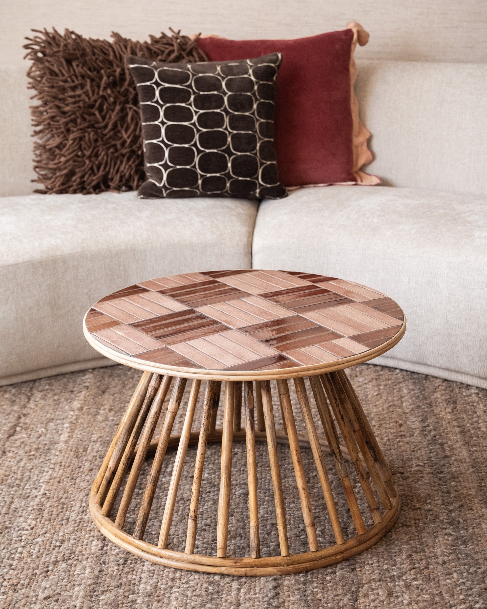 Der Beistelltisch „Mosaic Tiles Rattan Pink“ ist ein einzigartiges Möbelstück mit einer warmen Mosaikfliesen-Tischplatte und einem luftigen Rattangestell. Die natürlichen Materialien und die warmen Terrakottatöne verleihen ihm einen verspielten Vintage-Look. Er eignet sich perfekt als Beistelltisch neben dem Sofa oder als stilvolles Accessoire in einem warmen und natürlichen Interieur.