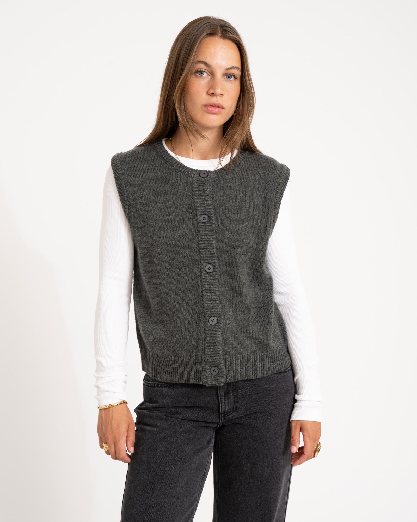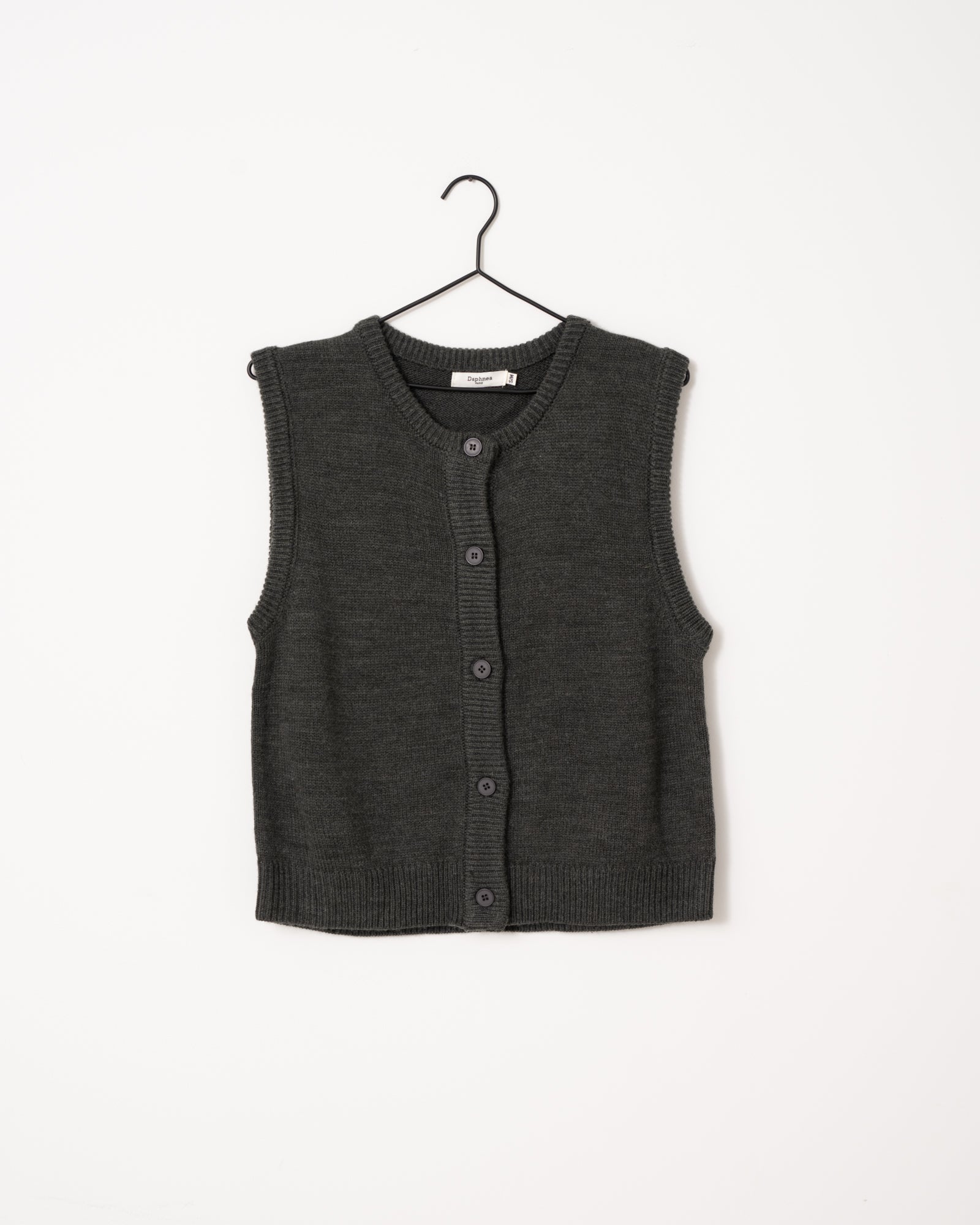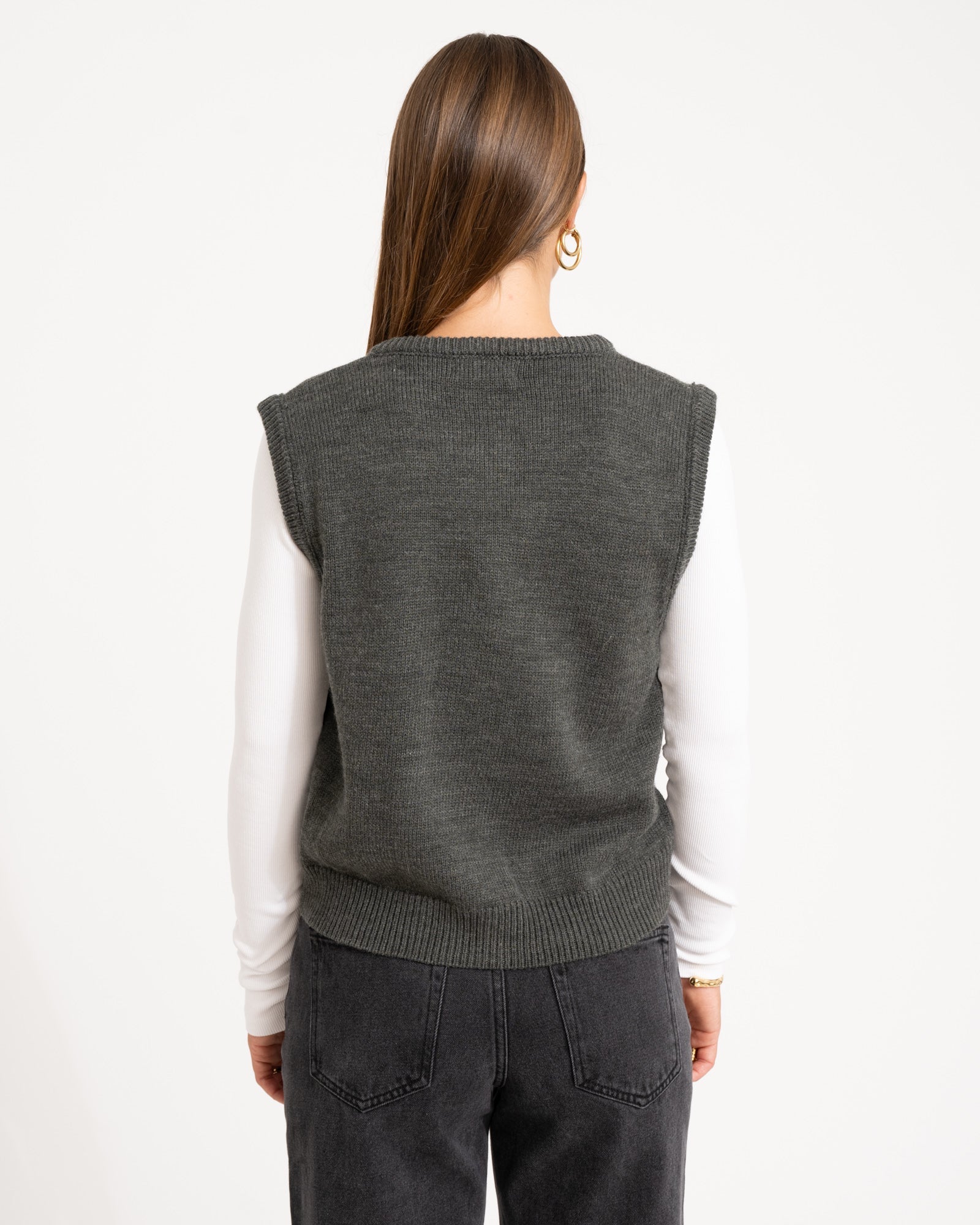 Diese dunkelgraue Strickweste ist ein echtes Layering-Essential. Kombinieren Sie sie mit einem langärmligen Oberteil oder einem Oversize-Shirt darunter.