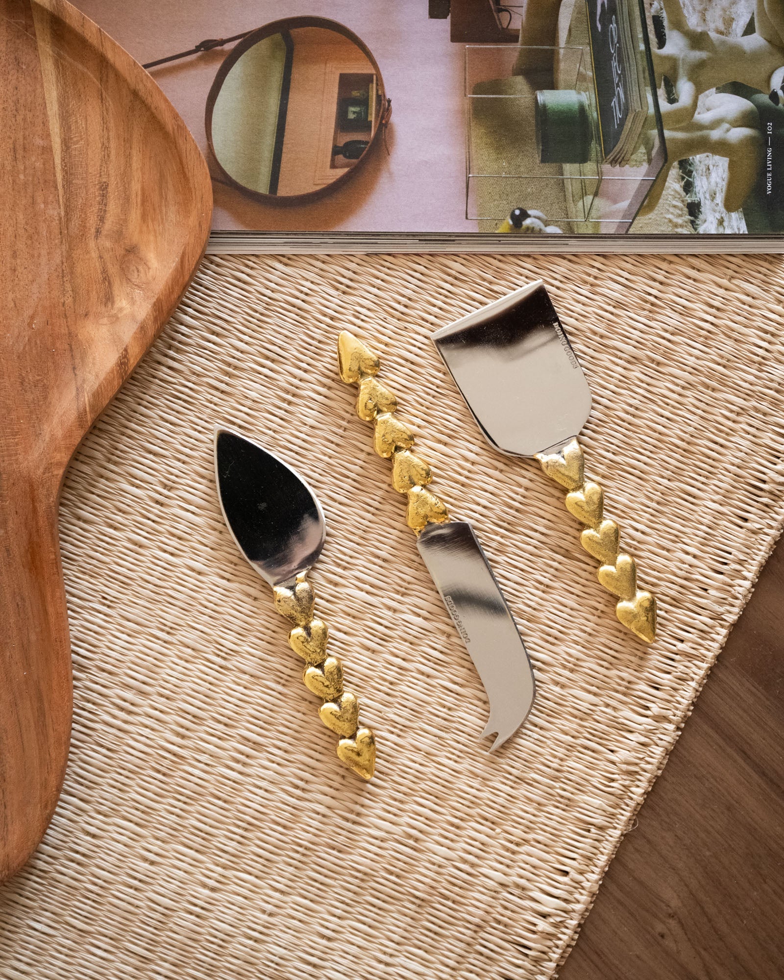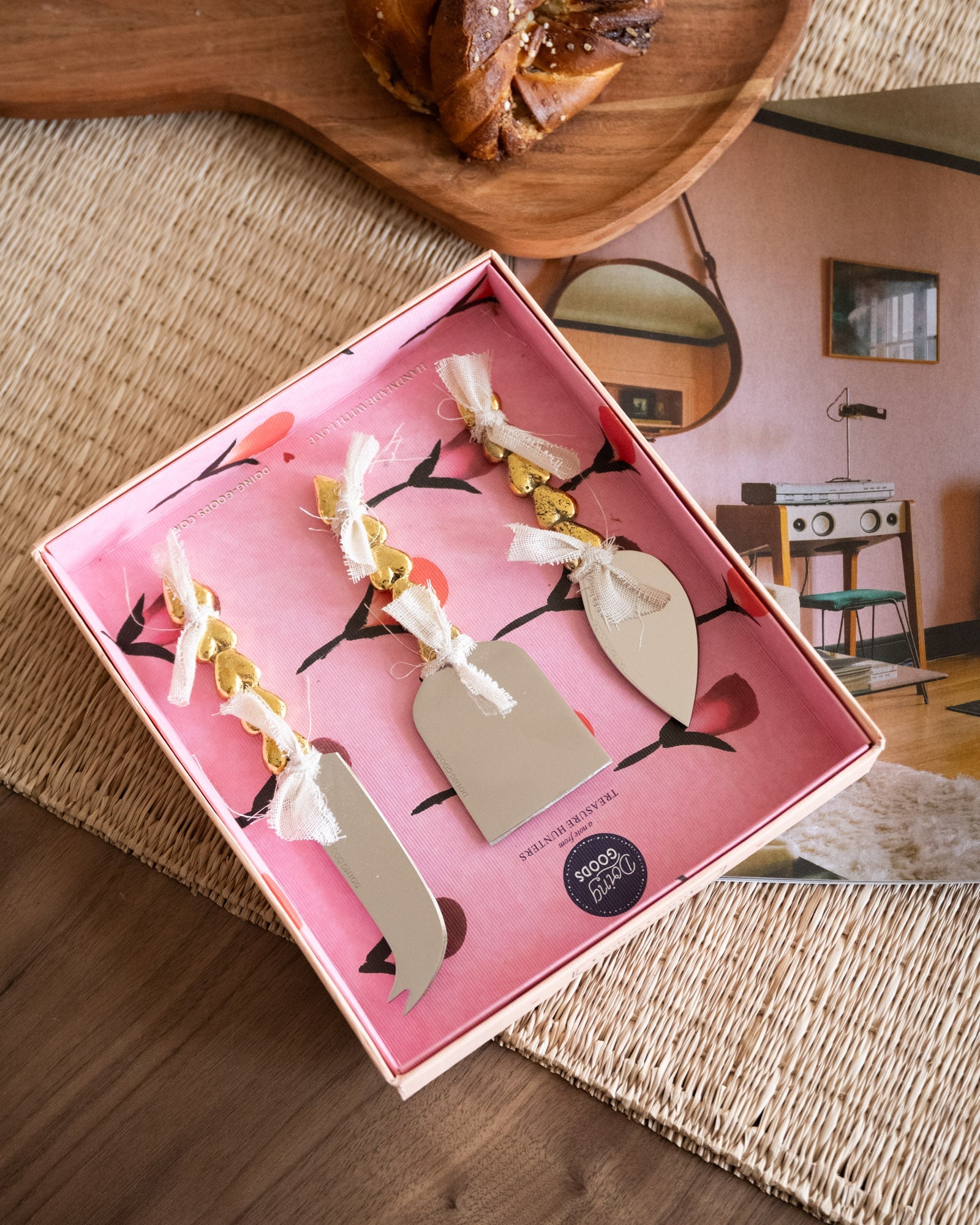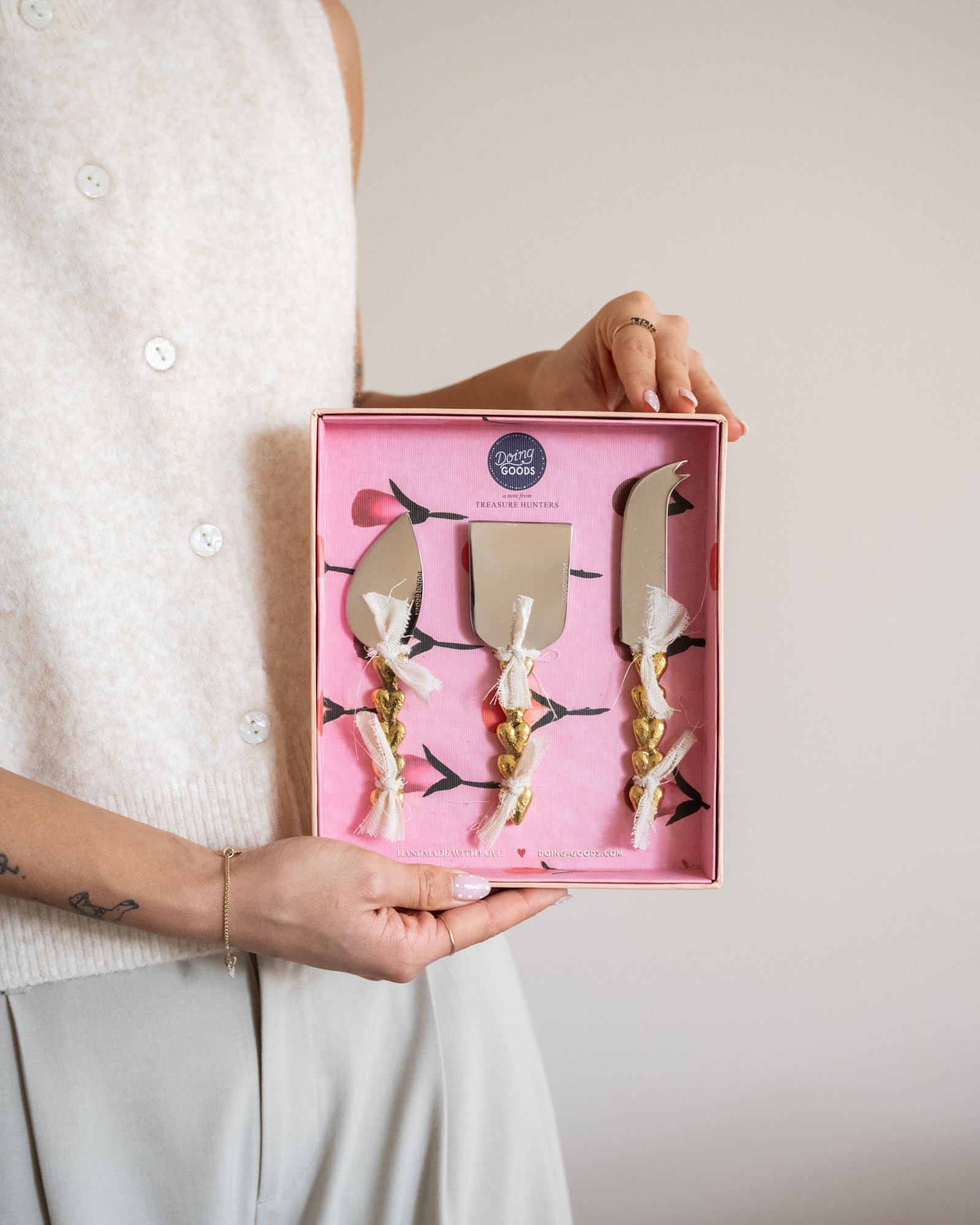 Dieses Set aus drei handgefertigten Käsemessern macht jede Käseplatte zu etwas ganz Besonderem. Die Messer sind aus Edelstahl gefertigt und haben goldfarbene Griffe aus recyceltem Messing mit herzförmigen Verzierungen. Präsentiert in einer wunderschönen Geschenkbox, sind sie das perfekte Geschenk.