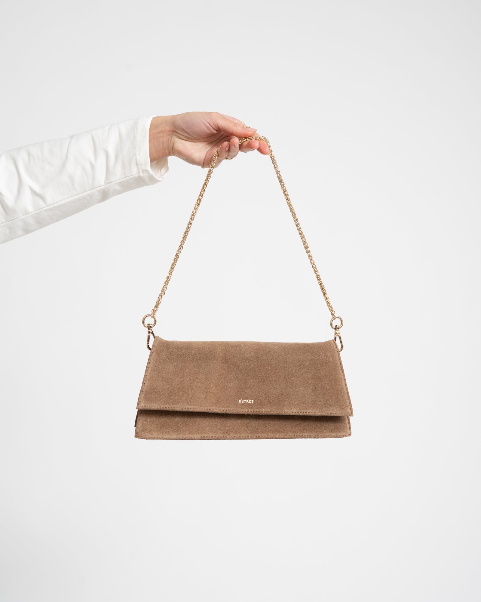 Die klassische Clutch Bag Brown ist Ihr schicker und dennoch unkomplizierter Begleiter: weiches Wildleder, ein eleganter Kettenriemen und viel Platz für all Ihre Abendutensilien.