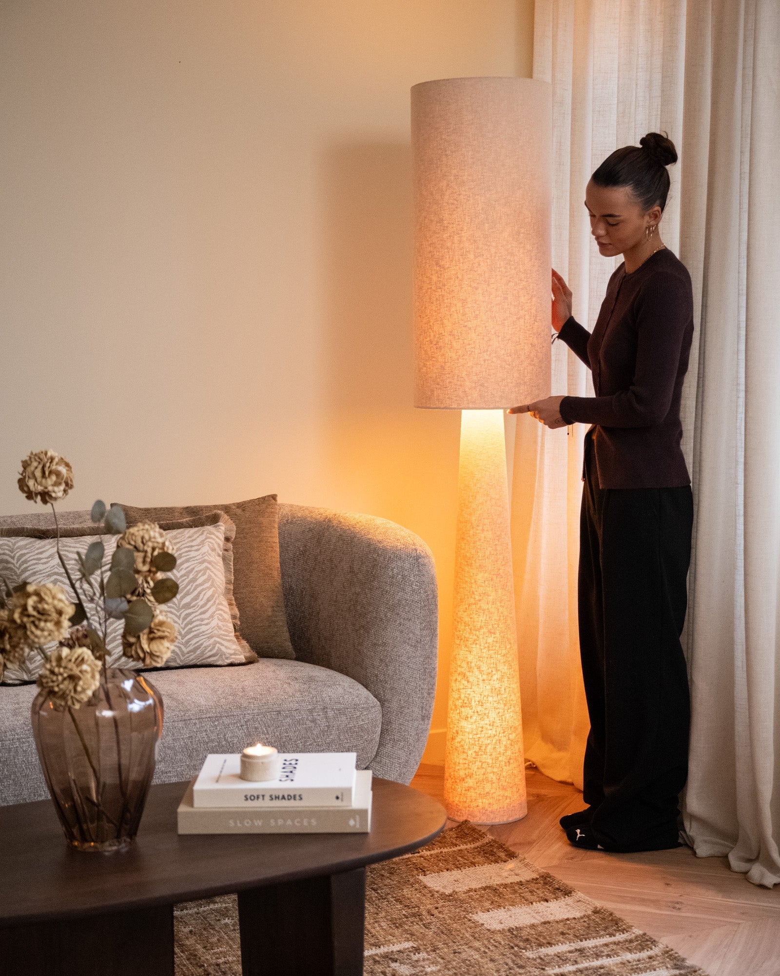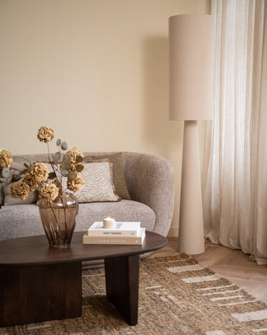 Die Stehleuchte Loft Bouclé Beige bringt mit ihrem weichen Bouclé-Bezug und dem minimalistischen Design Ruhe und Wärme in Ihr Zuhause. Dank zweier Lichtquellen (oben und unten) erzeugt sie ein stimmungsvolles, diffuses Licht. Sie passt perfekt zu einem Japandi-Interieur, harmoniert aber auch hervorragend mit modernen und skandinavischen Einrichtungen.