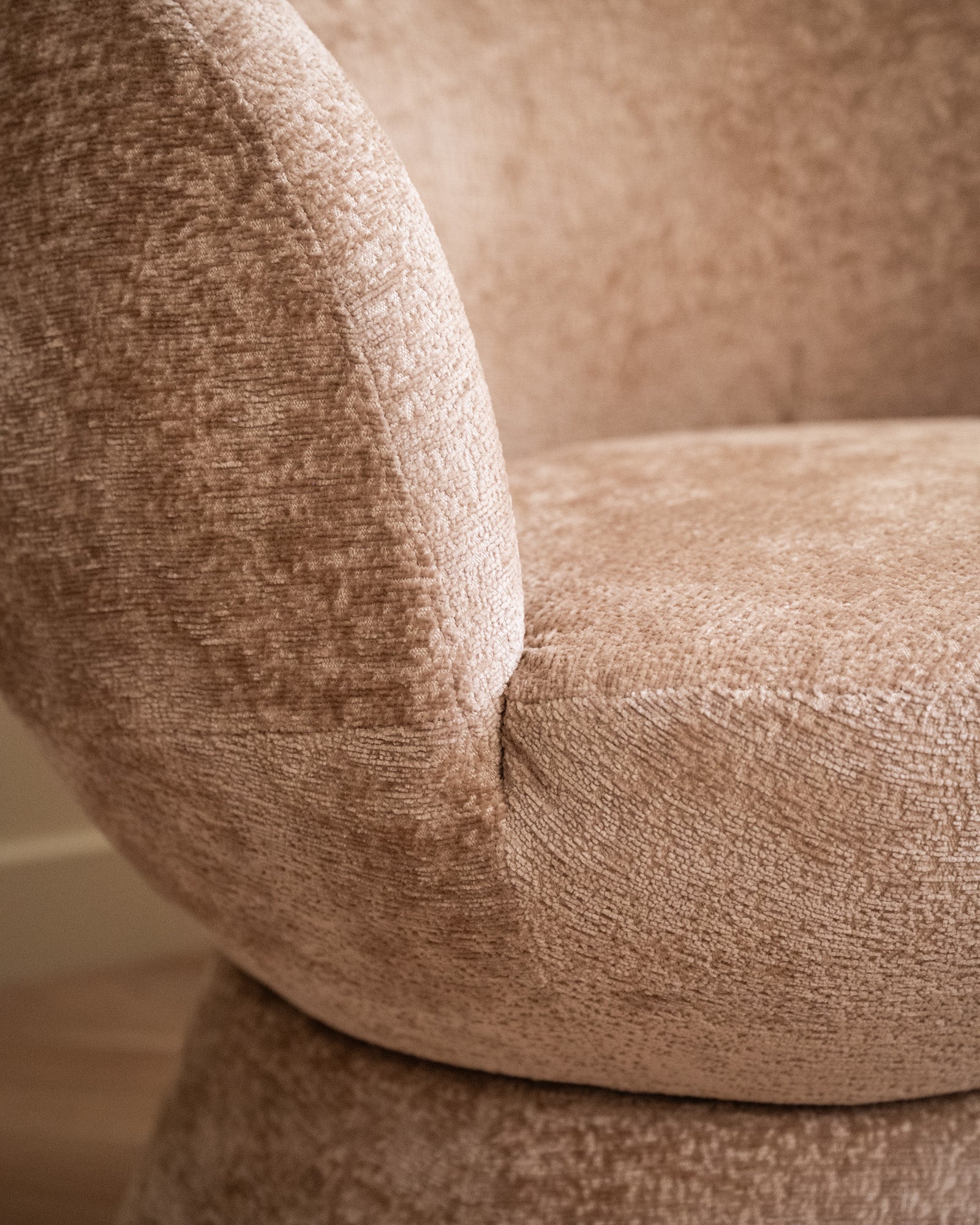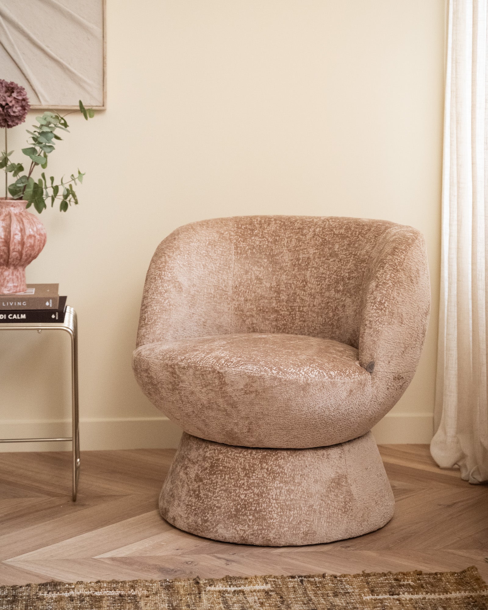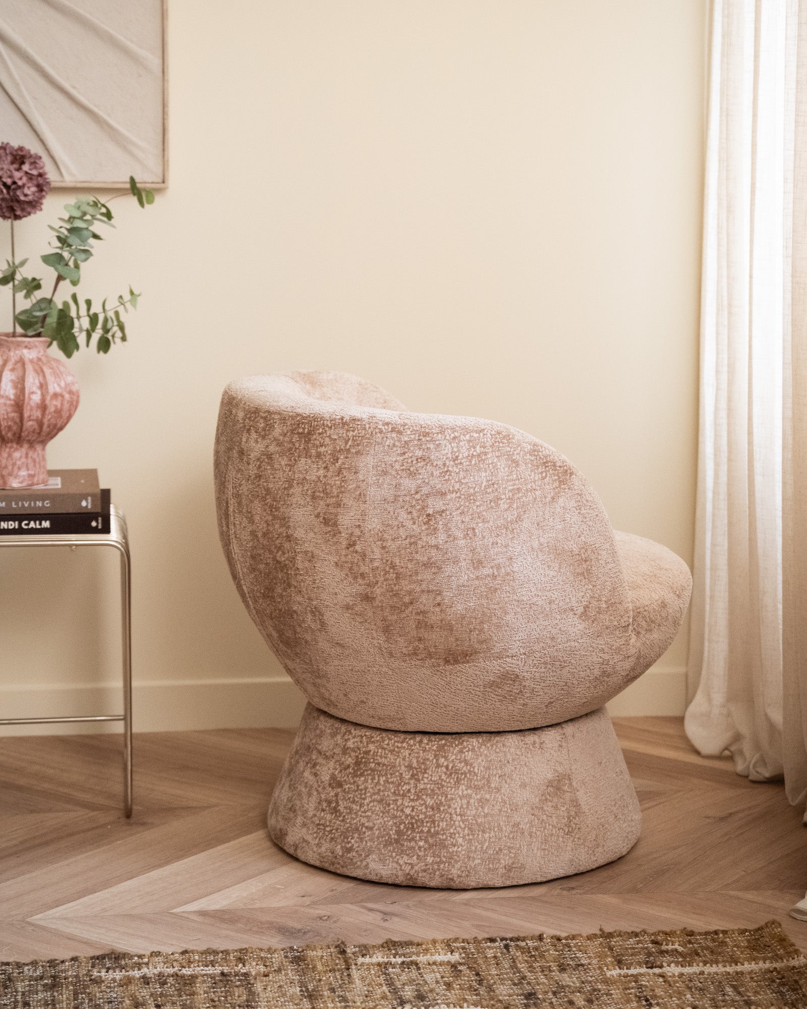 Der Drehsessel Indi Natural besticht durch seine bequeme, weiche Form und sein beruhigendes Erscheinungsbild. Der grob gewebte Chenille-Stoff in Naturfarbe verleiht dem Sessel einen luxuriösen Look und fühlt sich wunderbar weich an. Dank seiner Drehfunktion eignet er sich perfekt für das Wohnzimmer, die Leseecke oder als stilvoller zusätzlicher Sitzplatz.