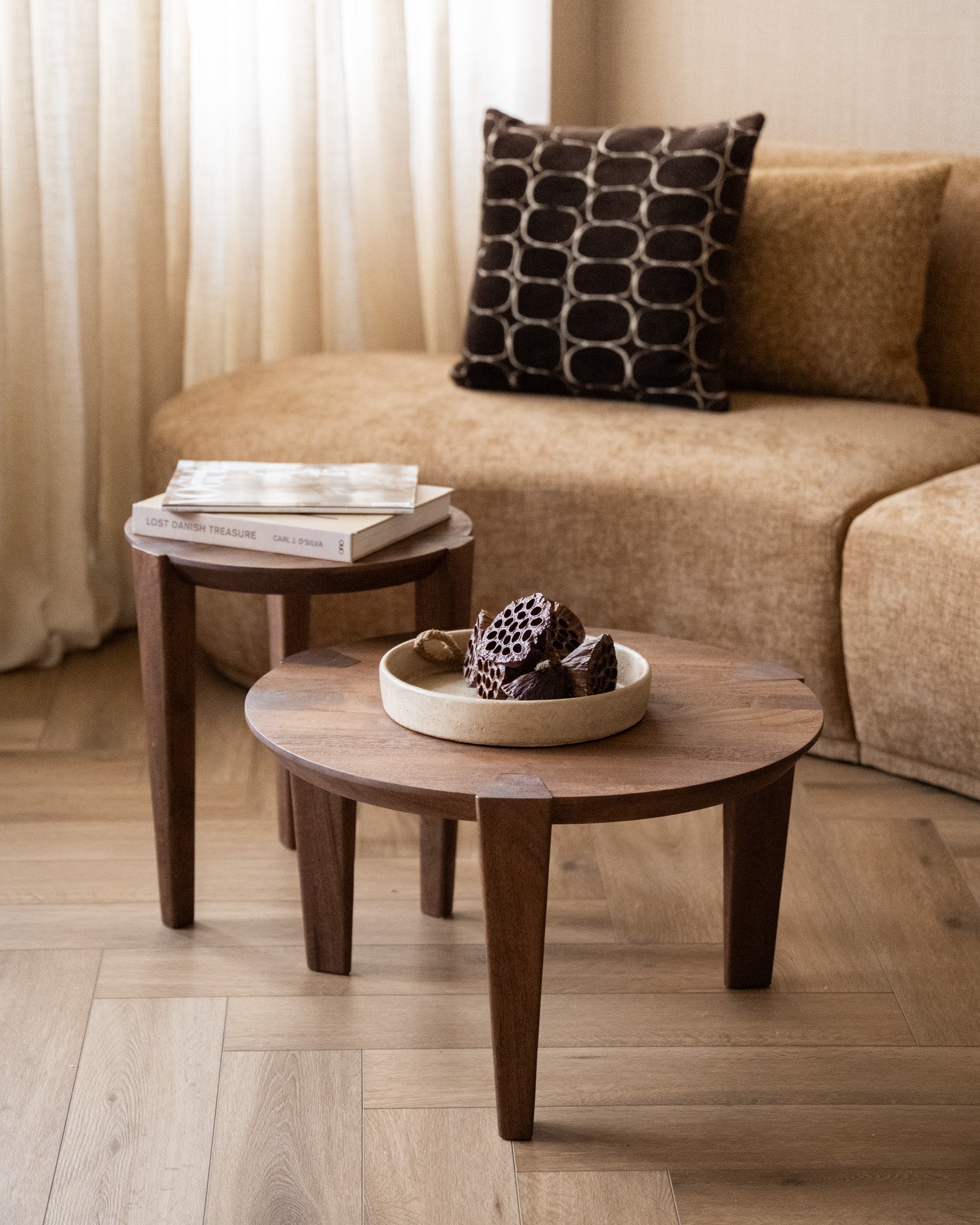 Verleihen Sie Ihrem Japandi-Interieur mit dem Beistelltisch Ina aus Mangoholz natürliche Eleganz. Dieser Beistelltisch ist aus massivem Mangoholz gefertigt und dezent gebürstet, wodurch die einzigartige Maserung und die warme Ausstrahlung des Holzes erhalten bleiben. Dank seines zeitlosen, abgerundeten Designs fügt sich der Ina perfekt in jeden Einrichtungsstil ein. Nutzen Sie ihn einzeln oder kombinieren Sie die kleine und die mittlere Größe für einen verspielten Look.