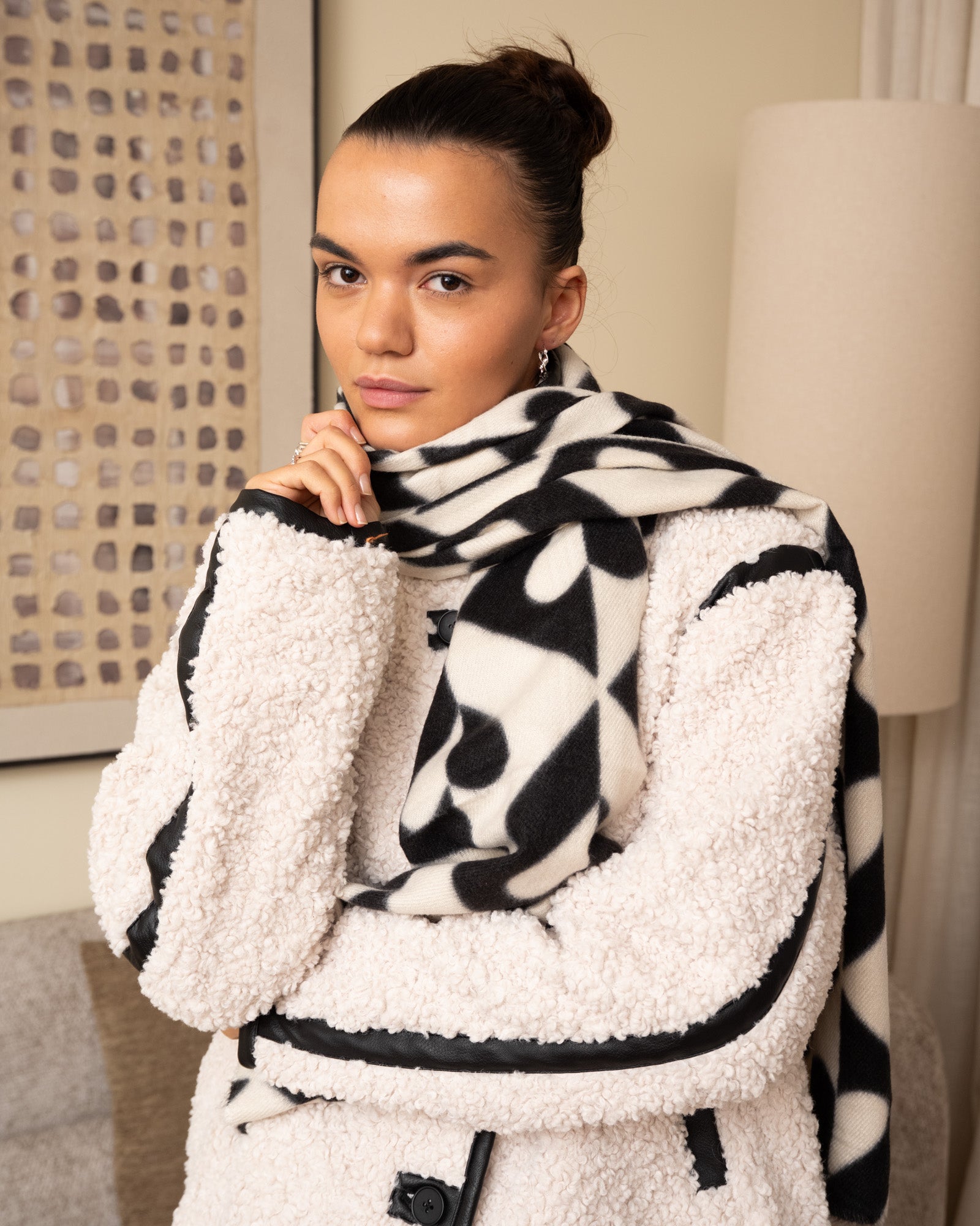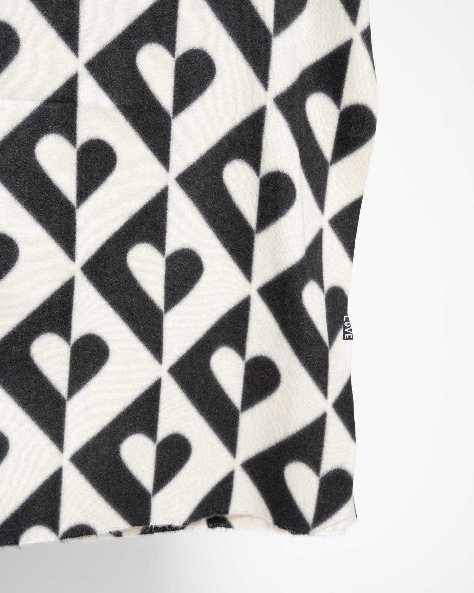 Dieser weiche Schal besticht durch ein auffälliges Harlekin-Karomuster mit dezenten Herzdetails und eignet sich perfekt, um jedem Outfit eine verspielte und stilvolle Note zu verleihen.