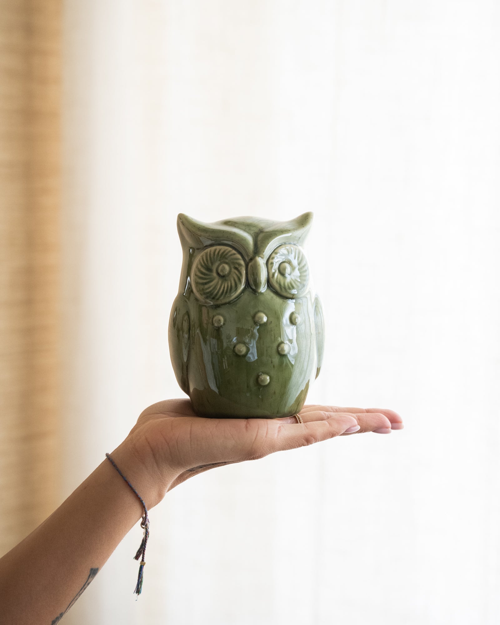 Die grüne Porzellan-Eule ist eine bezaubernde, dekorative Porzellanfigur. Die glänzende grüne Glasur und die feinen Details verleihen diesem kleinen Objekt einen verspielten und stilvollen Charakter. Sie eignet sich perfekt als Dekoration auf einem Regal, einer Kommode oder einem Beistelltisch und lässt sich wunderbar mit anderen Wohnaccessoires kombinieren.
