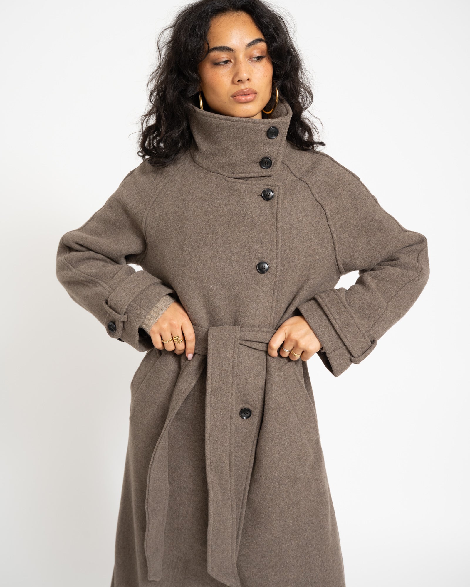 Der Bindegürtel betont dezent Ihre Taille, während der hohe Kragen und die langen Ärmel einen eleganten, zeitlosen Look kreieren. Ein Schlitz im Rücken sorgt für zusätzliche Bewegungsfreiheit und einen lässigen Fall.