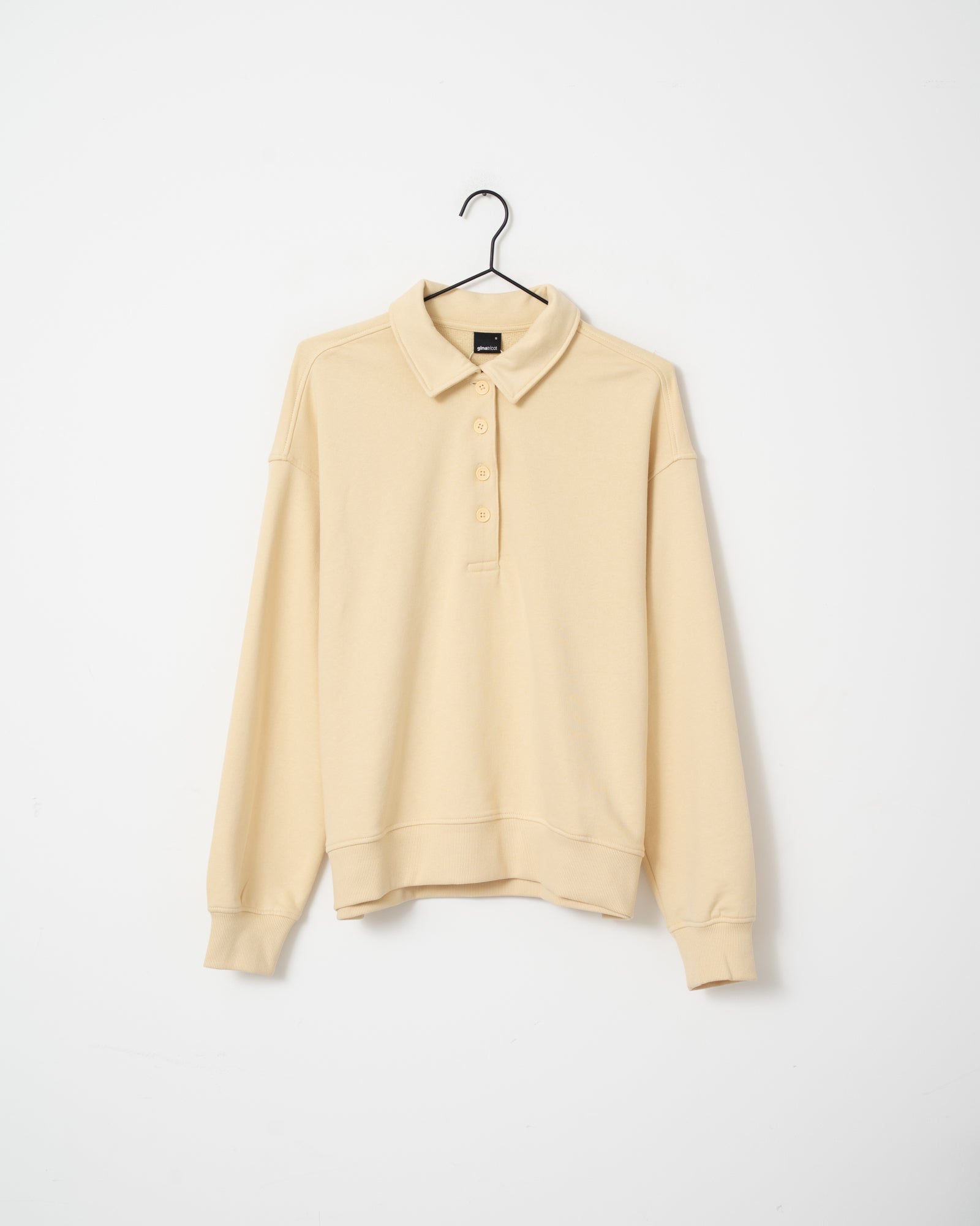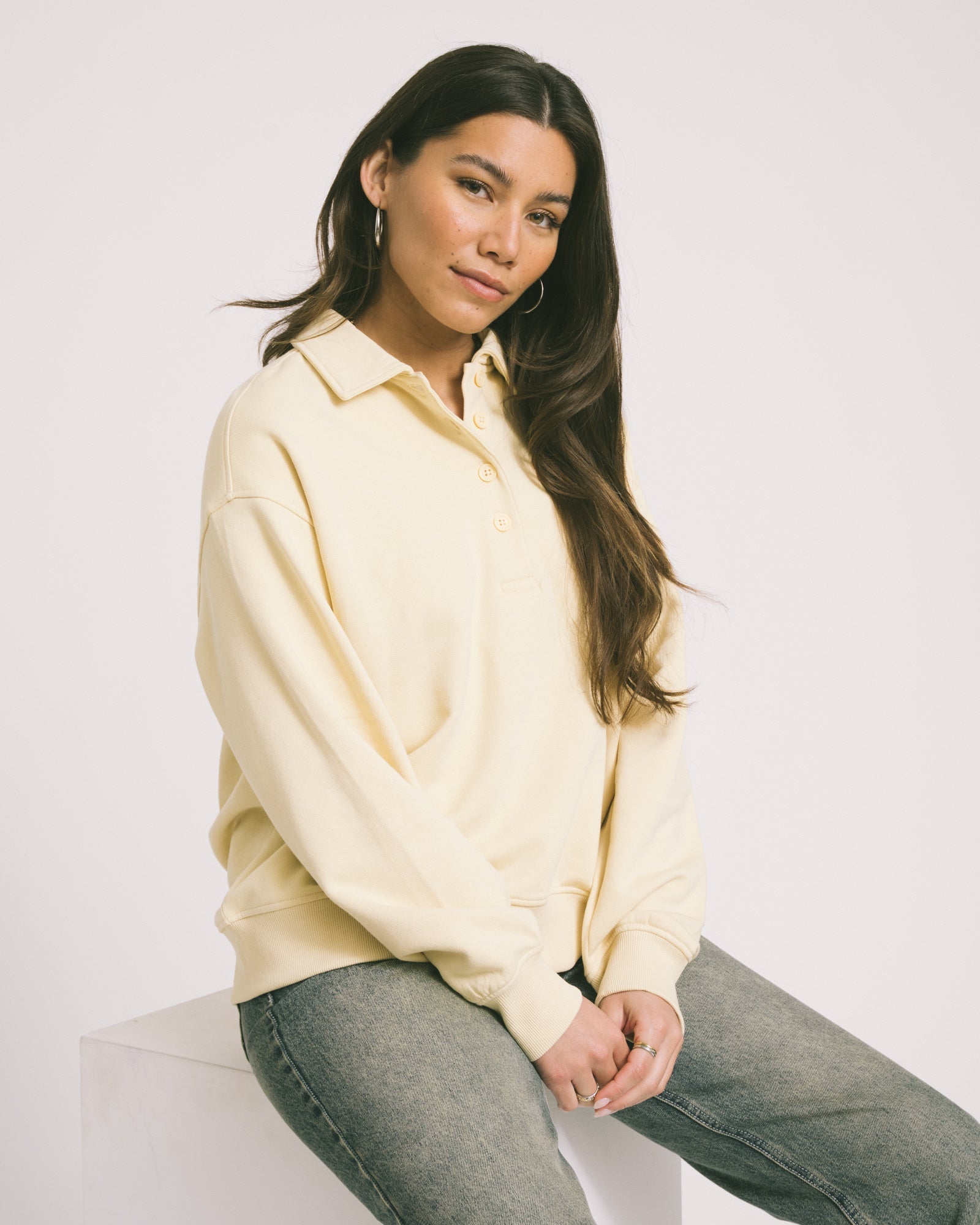 Dieser gelbe Polopullover hat eine Oversize-Passform, lange Ärmel und einen lässigen Look. Der V-Ausschnitt mit Kragen und Knopfleiste verleiht ihm eine elegante Note.