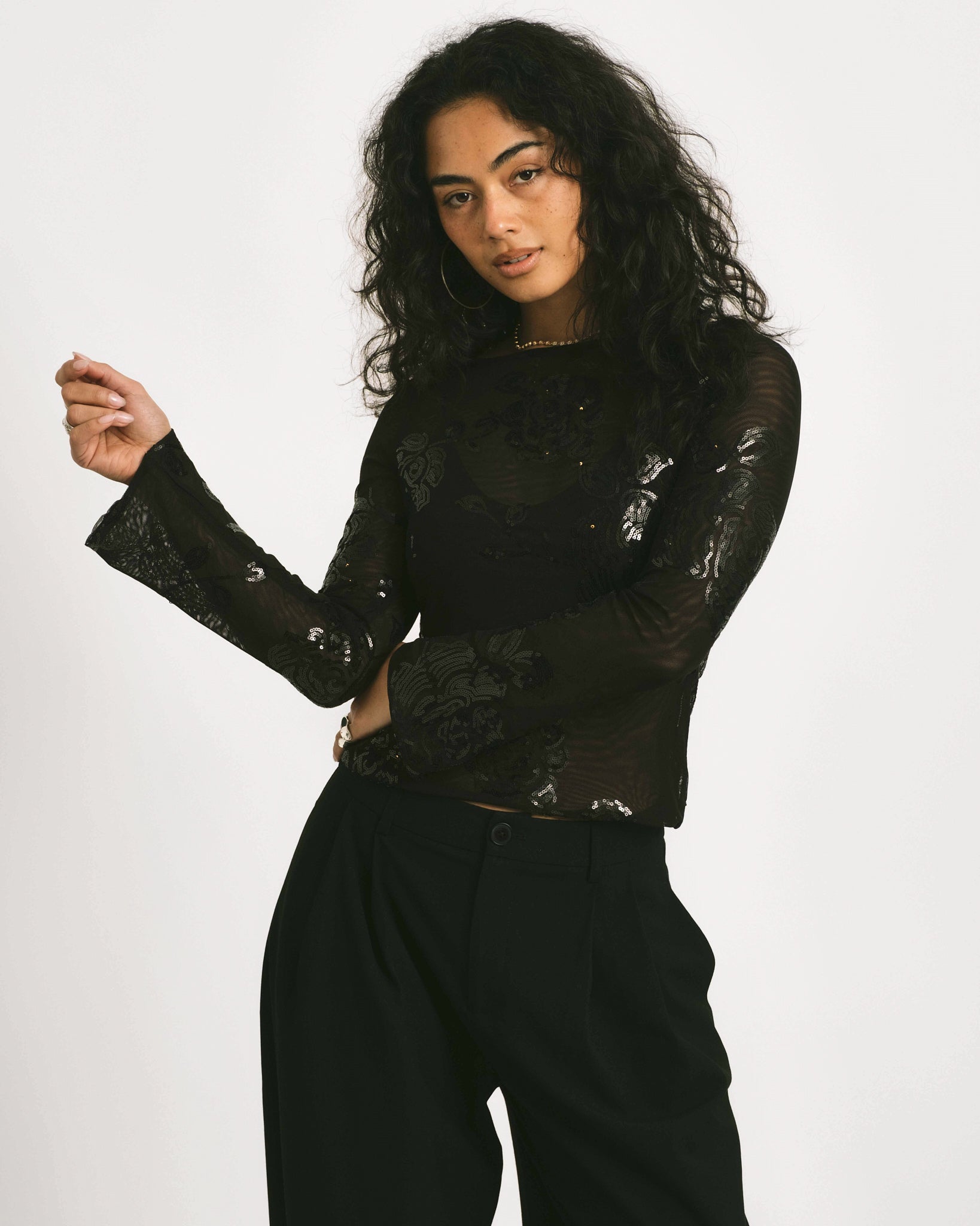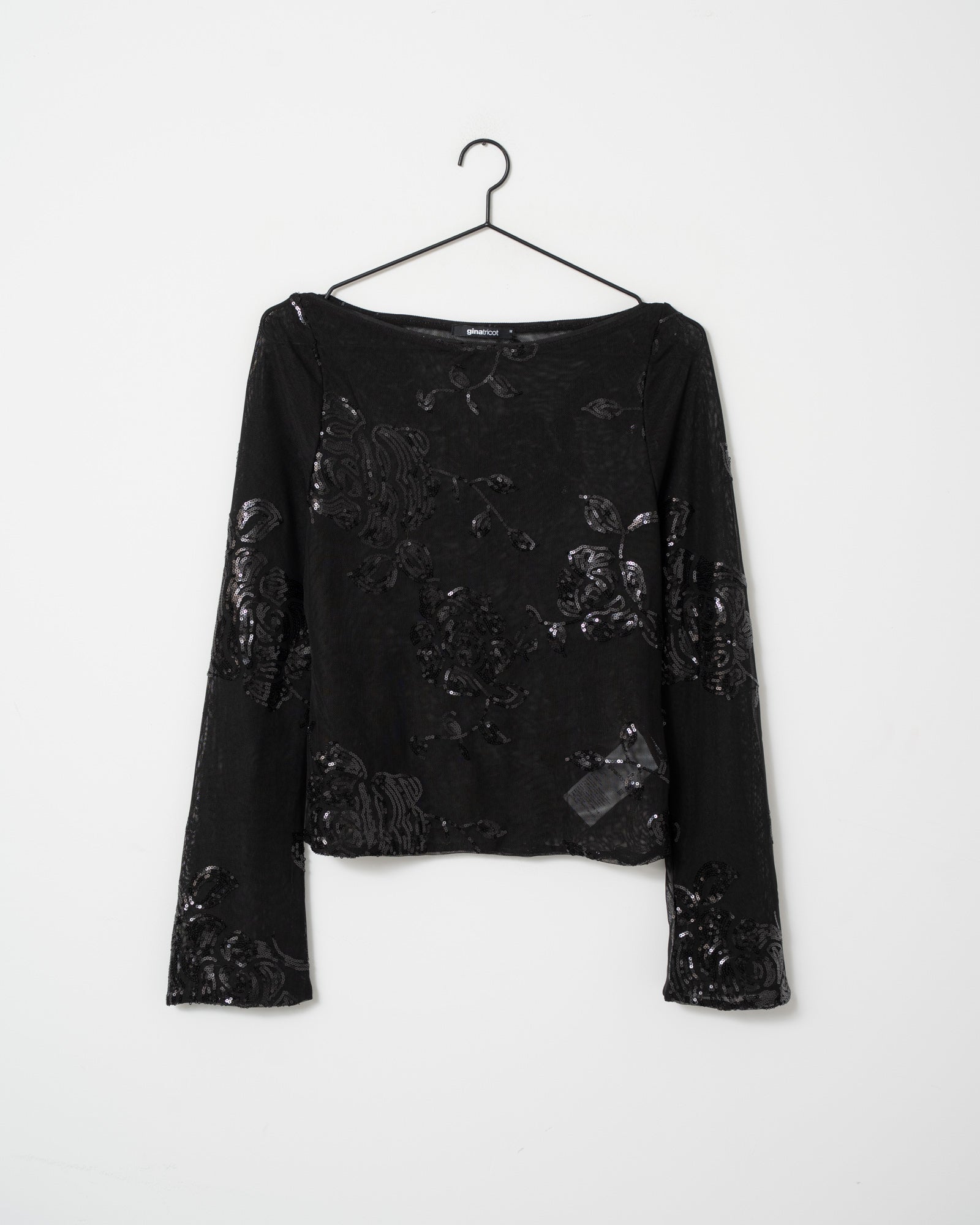 Strahl, Baby! ✨ Dieses schwarze Netztop mit floralen Pailletten ist perfekt für einen Abend in der Stadt. Trage es mit einem Bralette und deiner Lieblingshose.