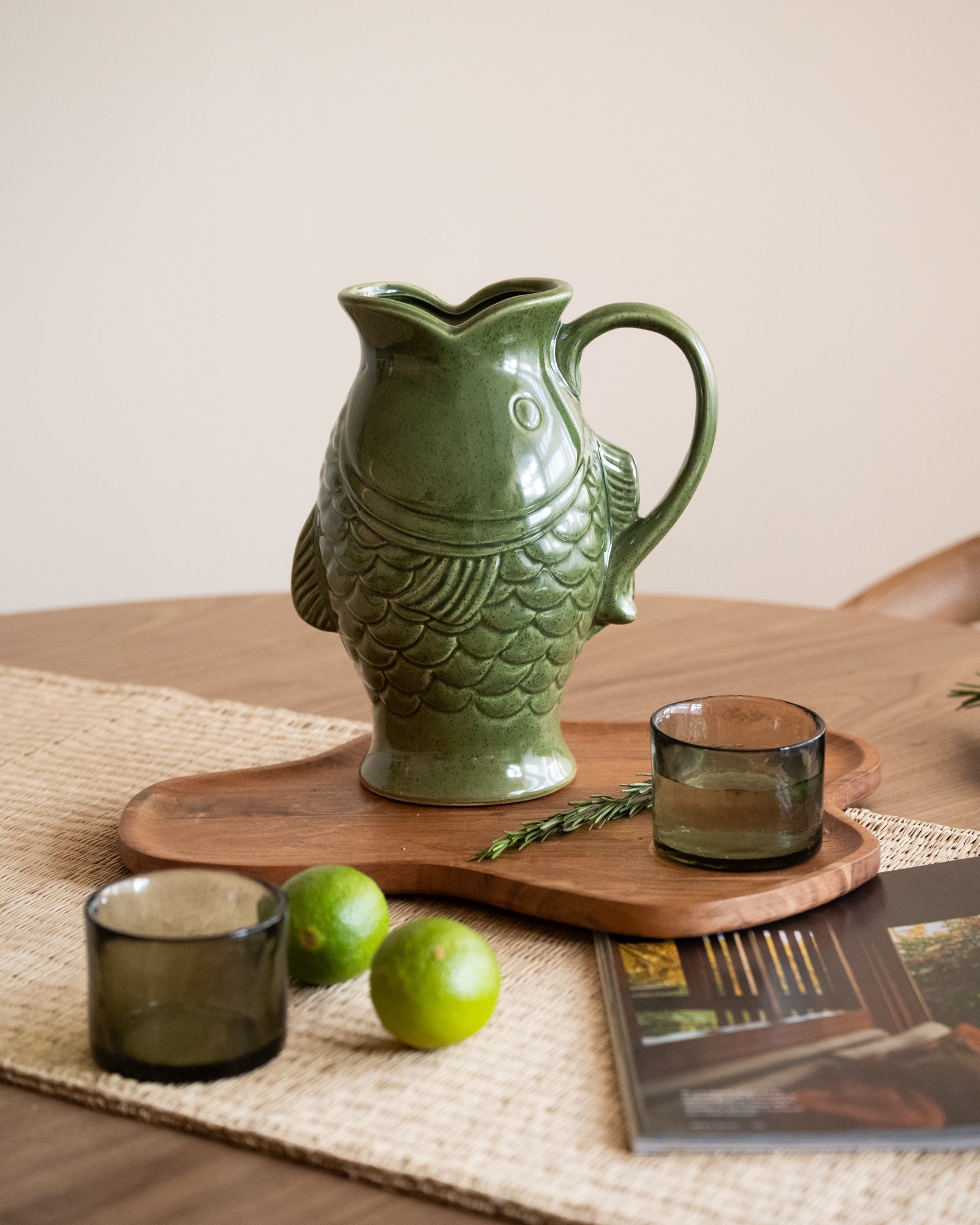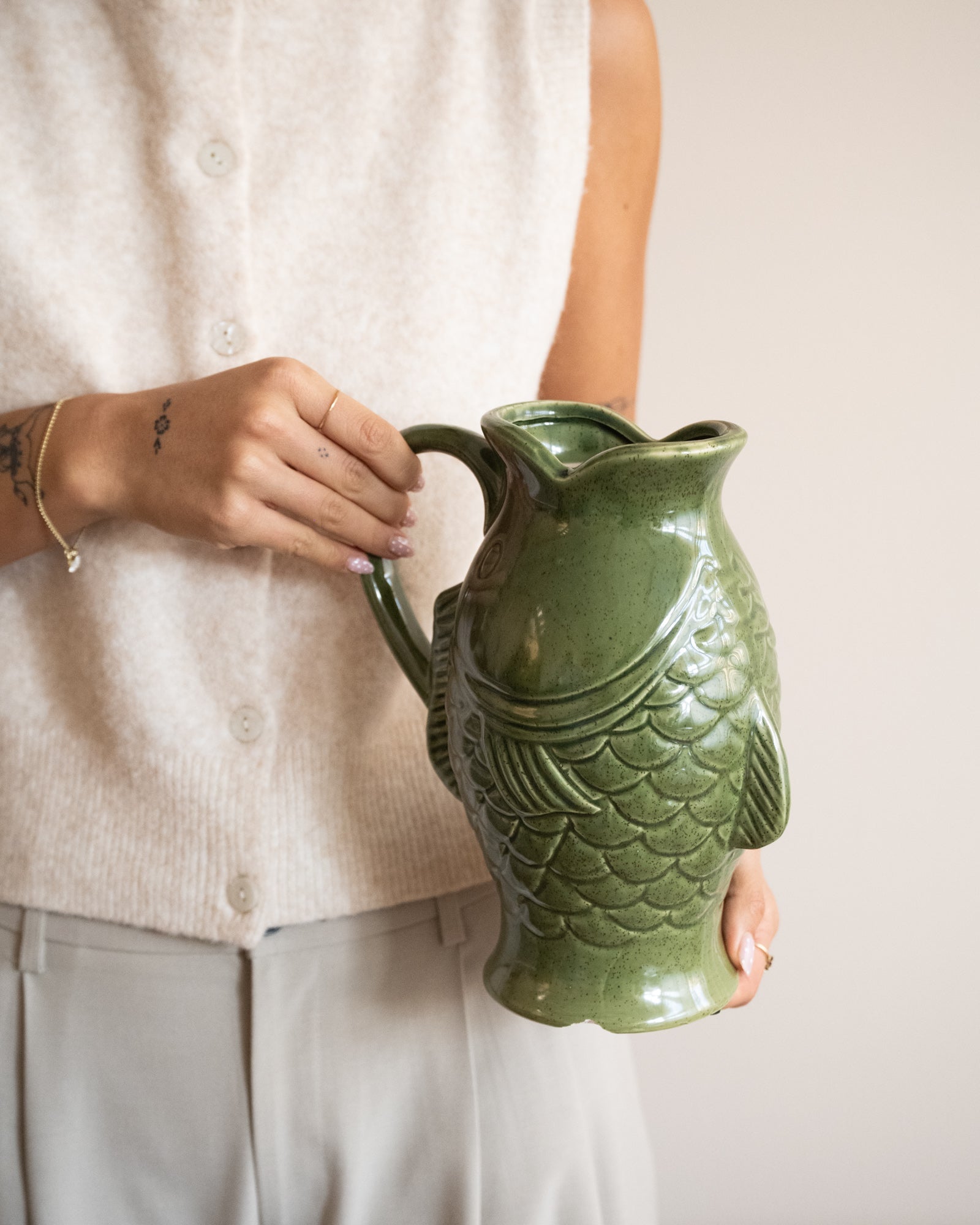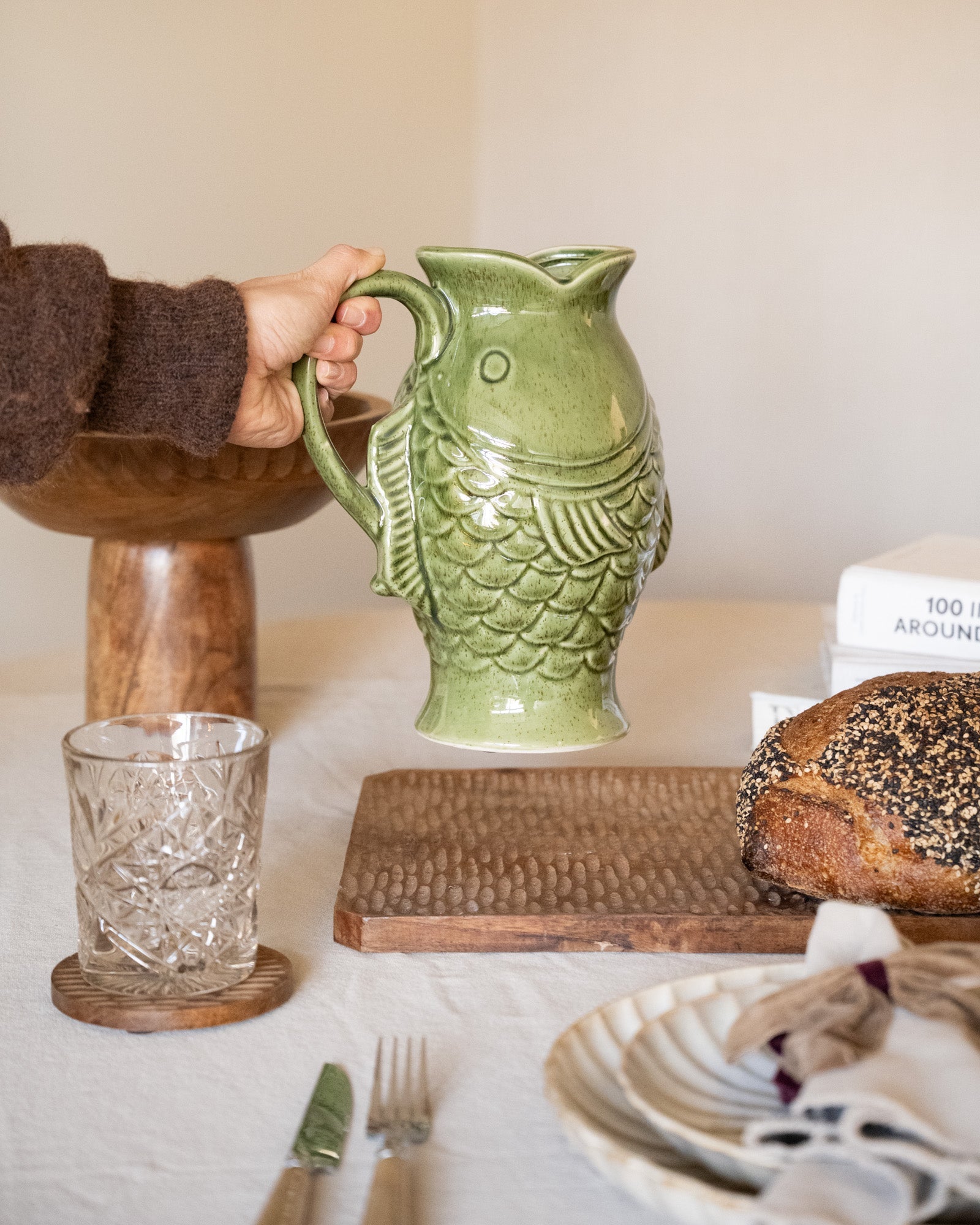 Diese einzigartige grüne Fischvase aus Steingut ist ein echter Blickfang auf jedem Tisch oder in jeder Vitrine. Ihr verspieltes Design vereint auf elegante Weise einen Hauch von Fröhlichkeit. Ob als Vase oder Dekorationsobjekt – sie verleiht Ihrem Interieur garantiert Charakter. Die glänzende grüne Glasur und die detailreiche Verarbeitung machen sie zu einem Must-have für jeden Interior-Design-Liebhaber.