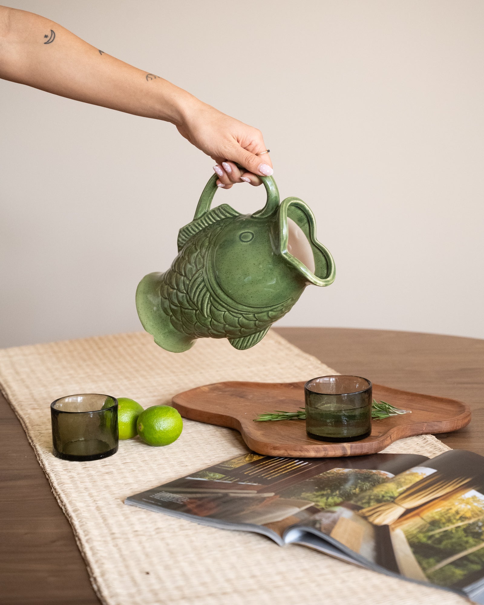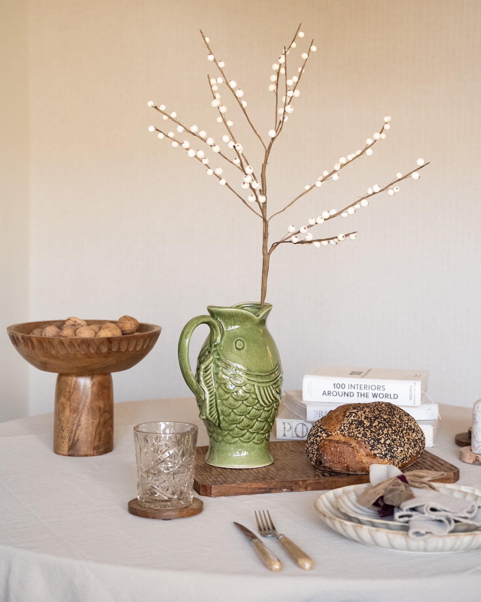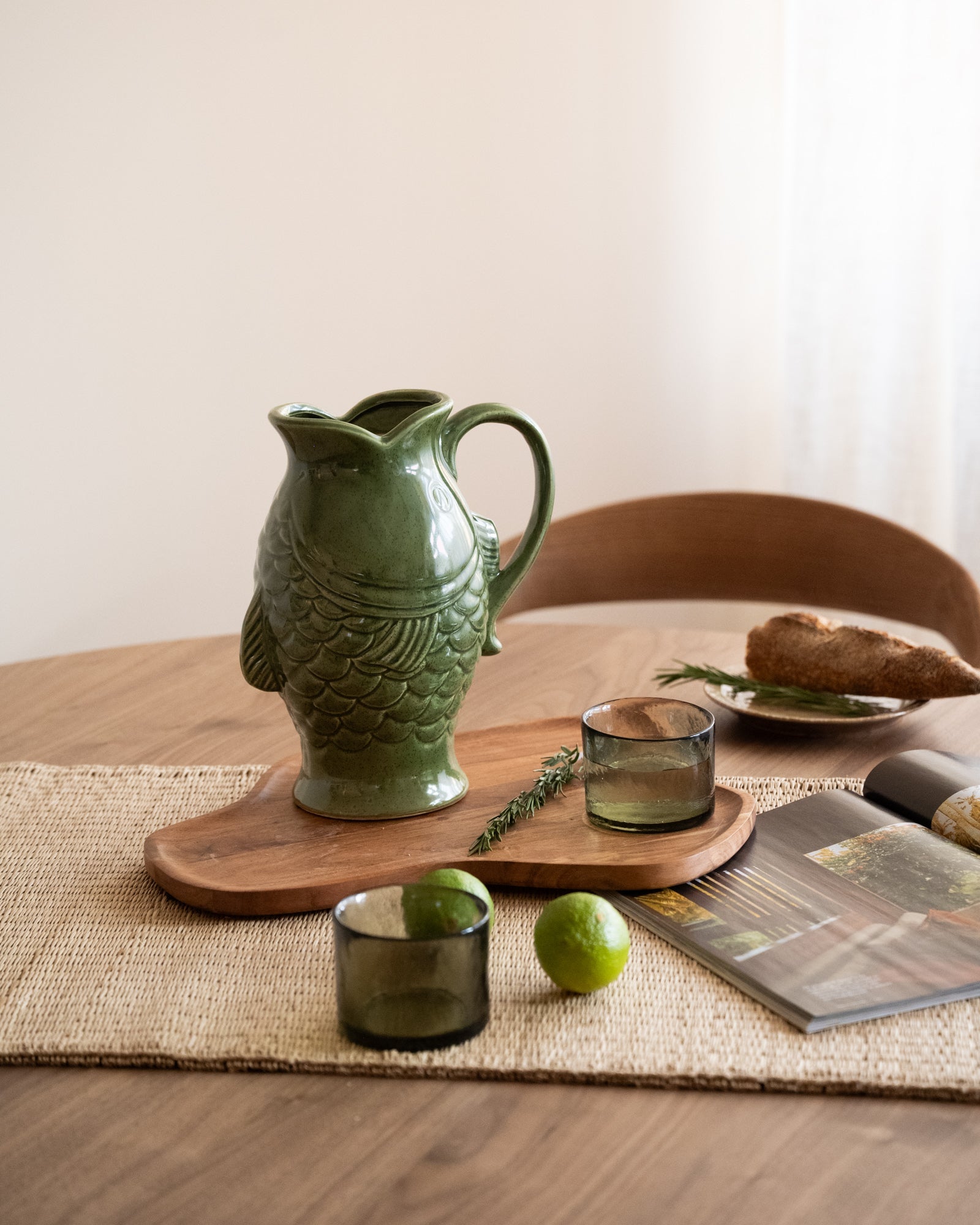 Diese einzigartige grüne Fischvase aus Steingut ist ein echter Blickfang auf jedem Tisch oder in jeder Vitrine. Ihr verspieltes Design vereint auf elegante Weise einen Hauch von Fröhlichkeit. Ob als Vase oder Dekorationsobjekt – sie verleiht Ihrem Interieur garantiert Charakter. Die glänzende grüne Glasur und die detailreiche Verarbeitung machen sie zu einem Must-have für jeden Interior-Design-Liebhaber.