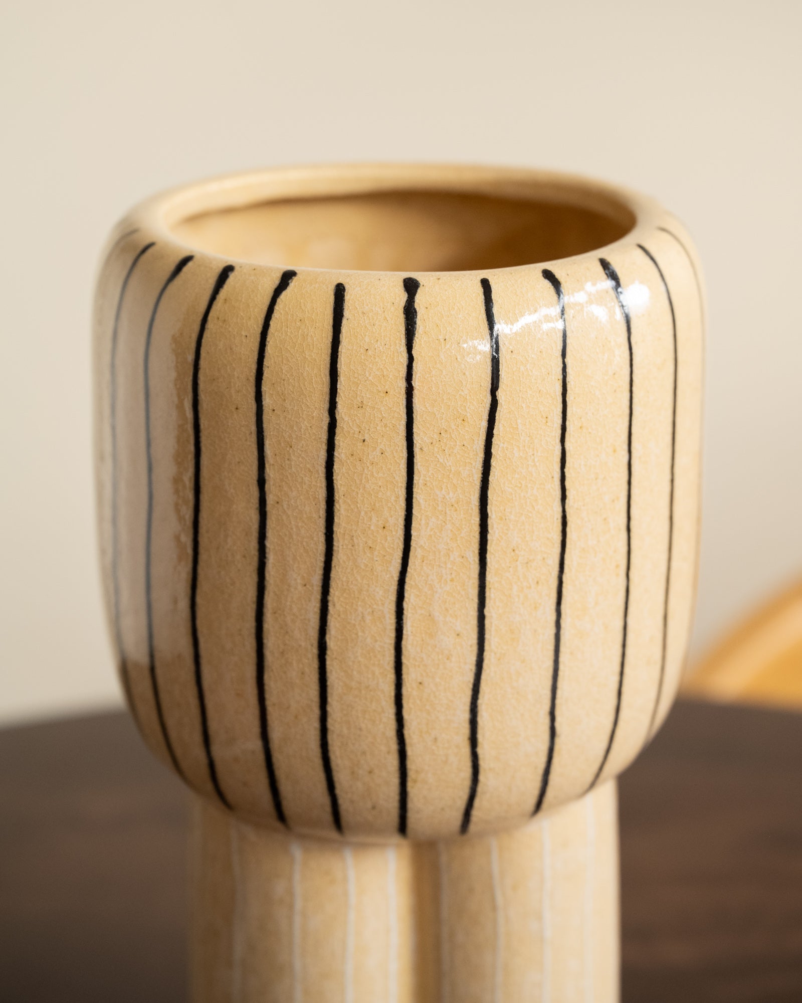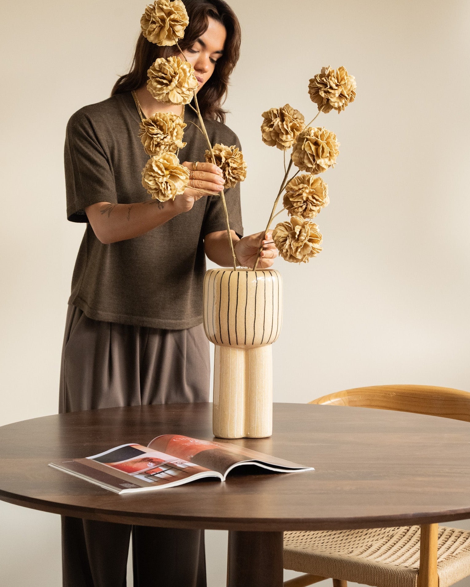 Verleihen Sie Ihrem Interieur mit der Deko-Vase Tera Lines einen stilvollen Touch. Die dezenten Linien und der warme Erdton verleihen jedem Raum eine moderne, natürliche Note. Perfekt mit Trockenblumen oder als auffälliges Einzelstück.