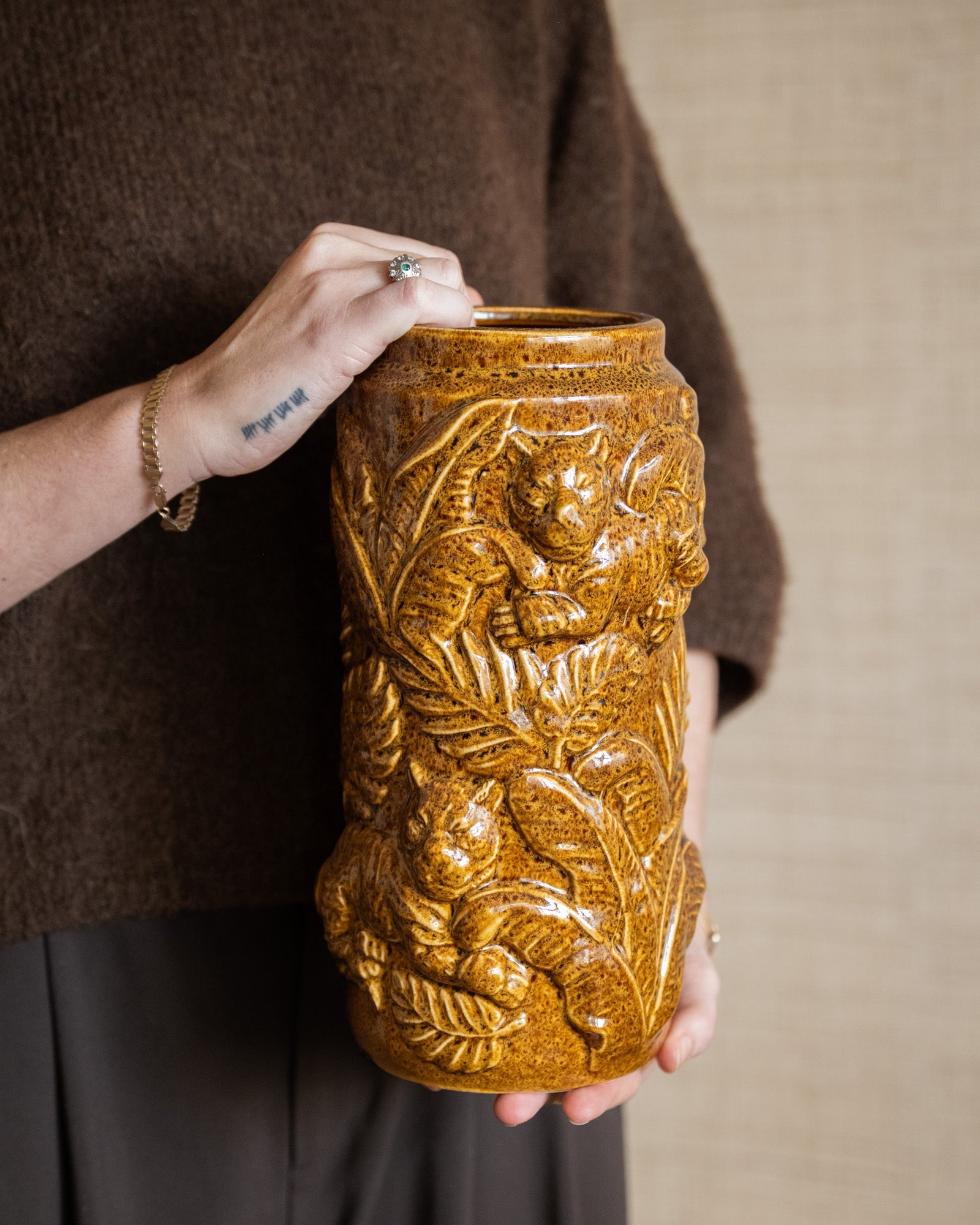 Die Deco Vase Tiger Ochre ist mit ihrer satten, warmen Glasur in Bernstein- und Ockertönen ein echter Blickfang. Das Relief mit botanischen Details verleiht der Vase einen verspielten und zugleich luxuriösen Charakter – perfekt als Blickfang auf Tisch, Sideboard oder Regal. Sie wirkt wunderschön mit Trockenblumen, einigen einzelnen Stielen oder auch einfach so.