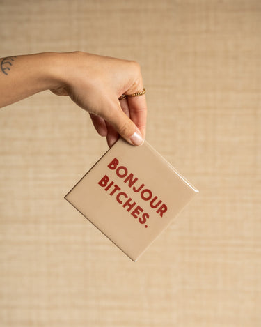 Sag jeden Morgen „Neuer Tag, wer ist da?“ mit dieser Keramikfliese. „Bonjour Bitches“ bringt sofort Schwung in deine Küche, dein Wohnzimmer oder dein Büro. Das perfekte Geschenk zum Einzug, Geburtstag oder für Freunde mit viel Persönlichkeit.