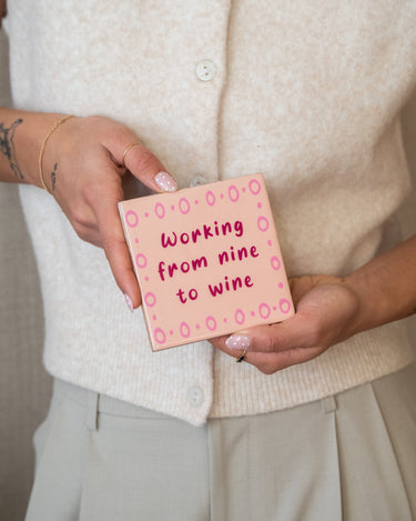 Die Fliesenfliese „Von neun bis zum Wein“ ist eine Hommage an Ihren Arbeitstag und zugleich eine Verneigung vor dem wohlverdienten Glas Wein. Das verspielte Zitat und der zarte Rosaton machen diese Keramikfliese zu einem fröhlichen Blickfang für Ihr Zuhause.