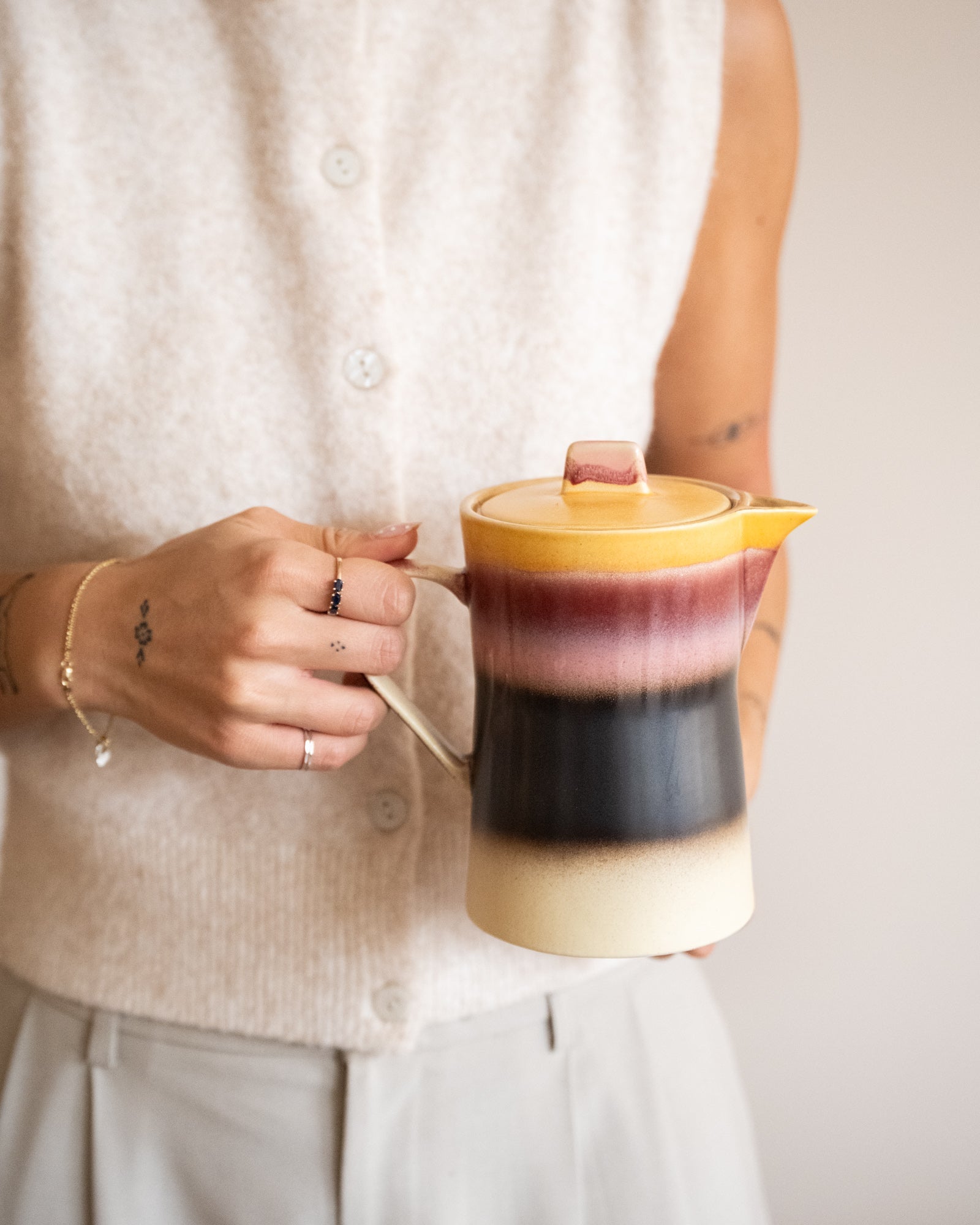 Lassen Sie Ihre Teemomente mit der Teekanne Sunset von HKLIVING erstrahlen! Die wunderschönen Erdtöne und die einzigartige Glasur erinnern an einen schwülen Sonnenuntergang an einer zerklüfteten Küste. Inspiriert von den legendären 70ern, aber mit einem modernen Twist – perfekt für Liebhaber natürlicher Schlichtheit und stilvoller Gemütlichkeit.