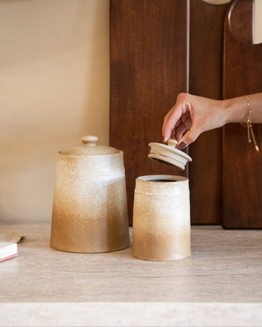 Bewahren Sie Ihre Lieblingskaffeebohnen, Tee oder Pasta stilvoll in diesem wunderschönen Porzellangefäß auf. Die warmen, natürlichen Farbtöne und die dezente Textur verleihen Ihrer Küche einen rustikalen und zugleich eleganten Touch. Der passende Deckel hält Ihre Zutaten länger frisch. Perfekt, um es einzeln zu präsentieren oder mehrere Größen für einen harmonischen Look zu kombinieren! Dank seines ruhigen Designs fügt es sich wunderbar in ein Japandi-Interieur ein.
