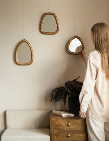 Organisch geformte Spiegel aus Holz. Ideal zur Dekoration von Flur, Badezimmer oder Schlafzimmer. Sie lassen sich auch hervorragend kombinieren und in verschiedenen Höhen aufhängen. Der natürliche Look harmoniert perfekt mit der ruhigen Atmosphäre eines Japandi-Interieurs.