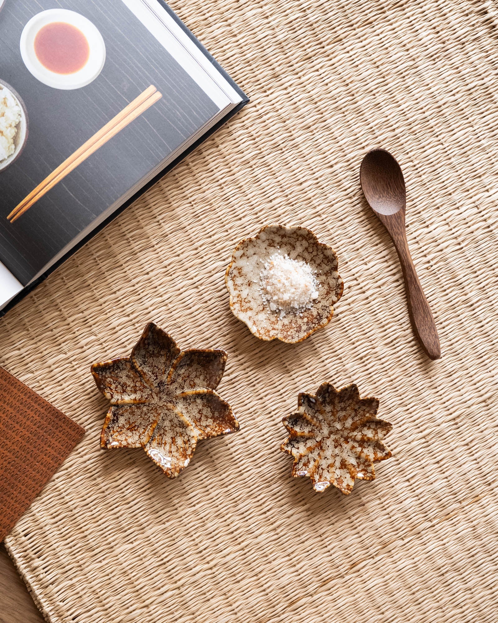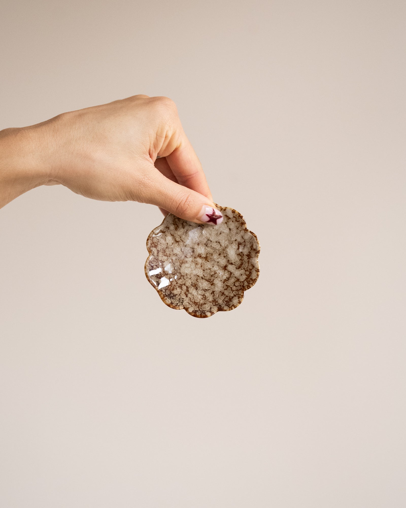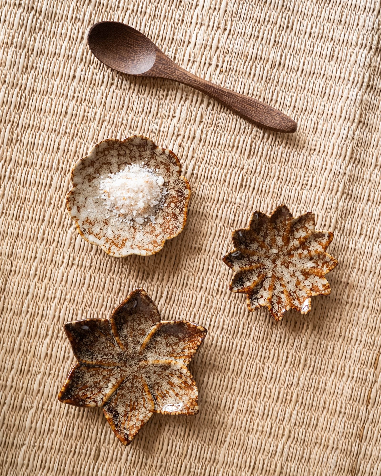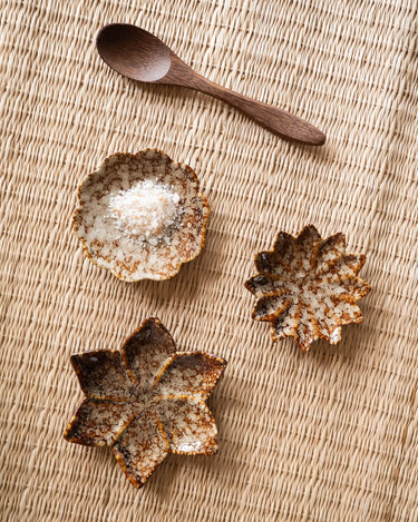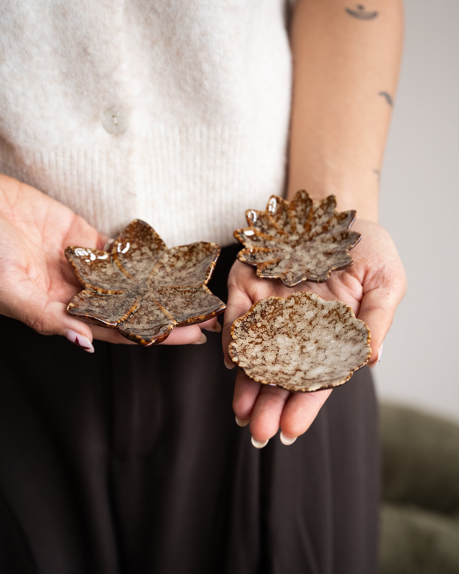 Das 3-teilige Set „Kleiner Teller Blume“ besteht aus drei Porzellanschalen in eleganter Blütenform. Die warmen Brauntöne und die glänzende Oberfläche verleihen jedem Teller einen einzigartigen, handgefertigten Look.