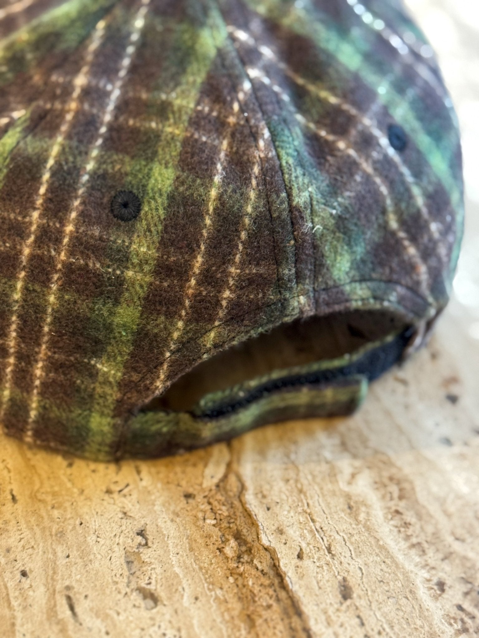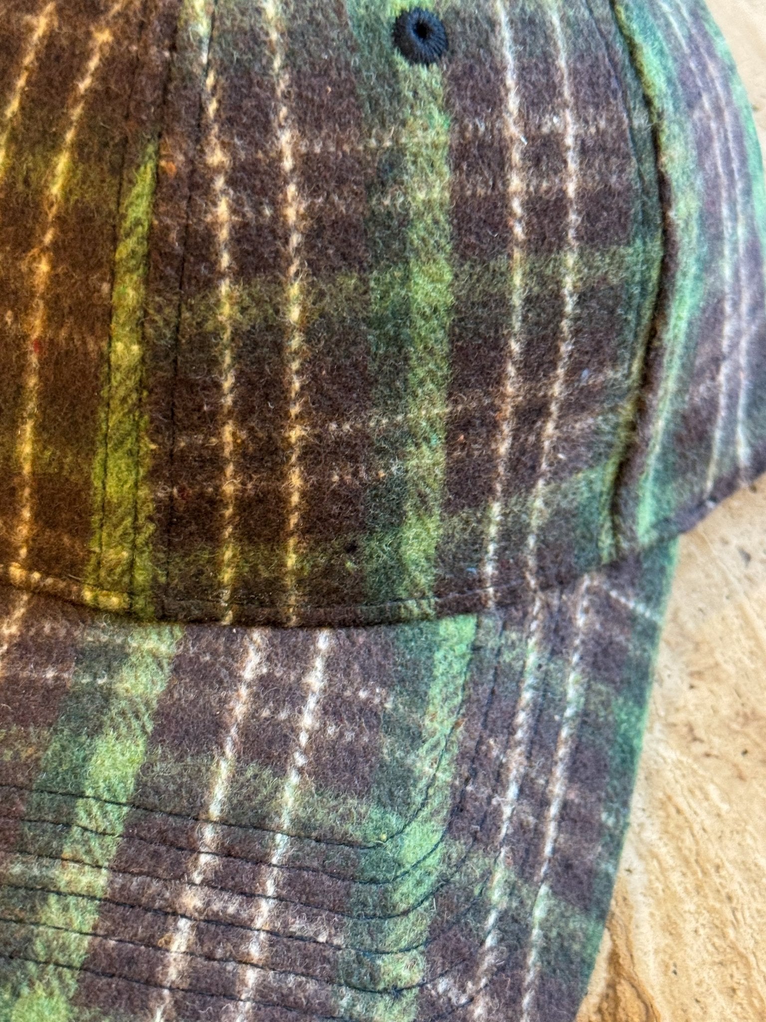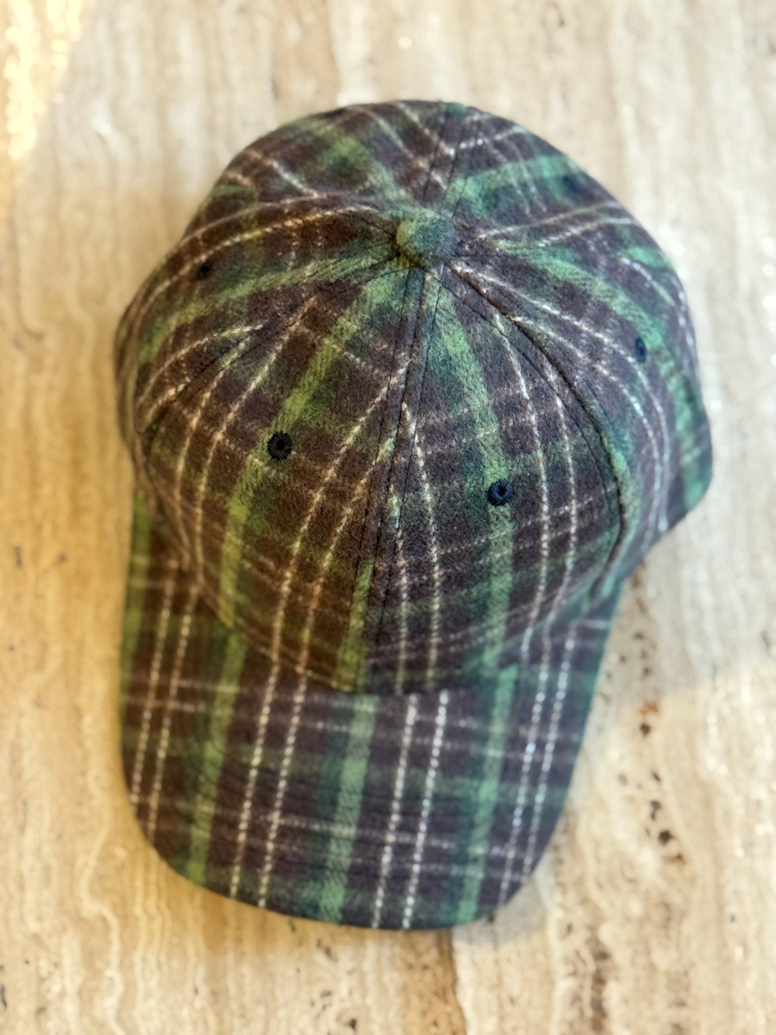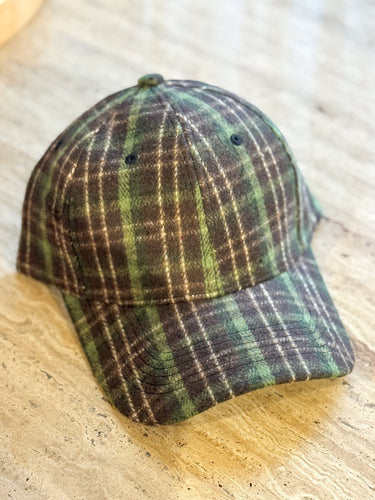 Eine weiche, karierte Baseballkappe mit einem warmen Rautenmuster in Braun- und Grüntönen.