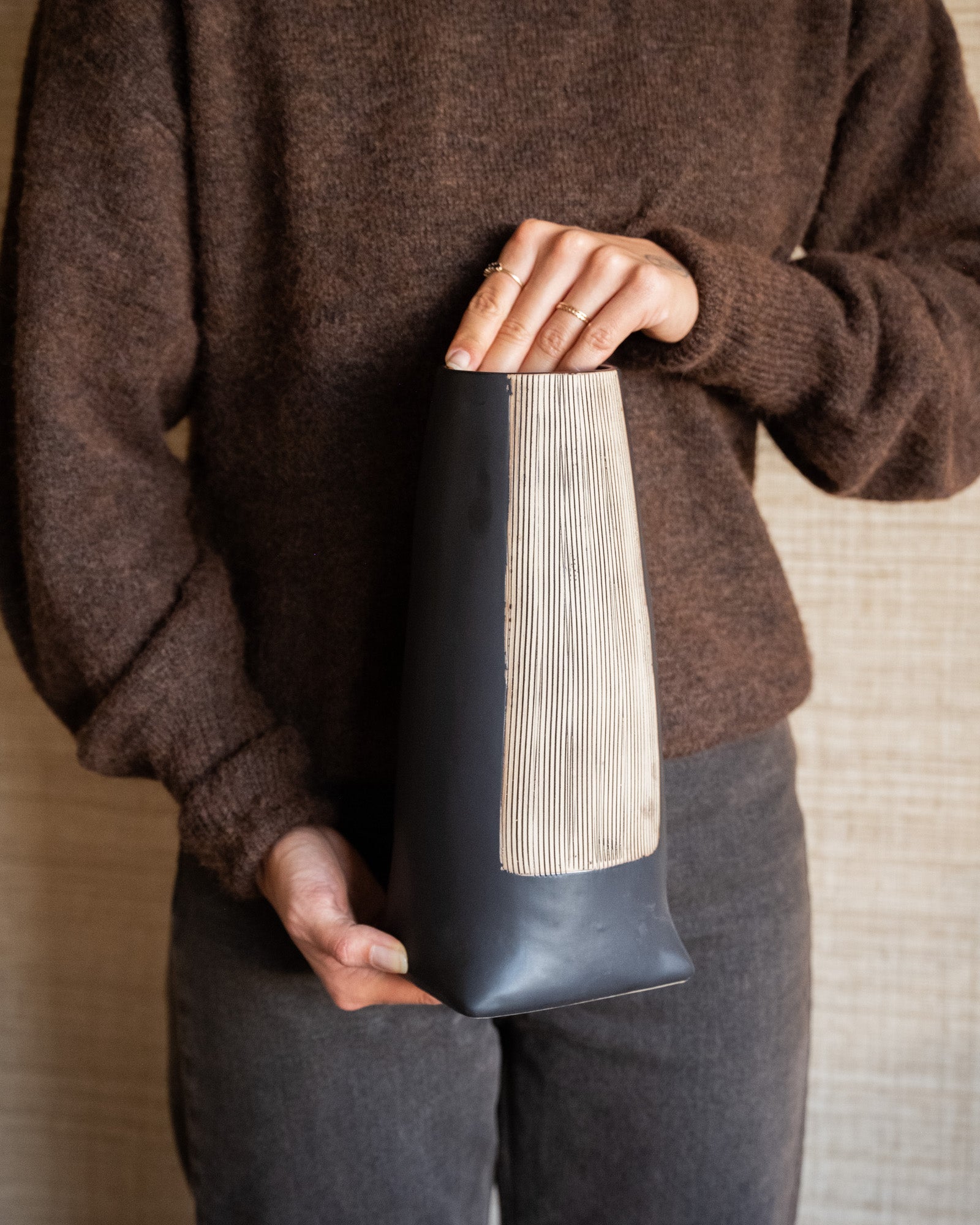 Die Deco Vase Maria Black verleiht Ihrem Interieur eine moderne, künstlerische Note. Die Kombination aus mattschwarzer Keramik und einem dezenten linearen Muster sorgt für einen stilvollen und einzigartigen Look. Ein echter Blickfang auf jedem Schrank, Beistelltisch oder jeder Kommode!
