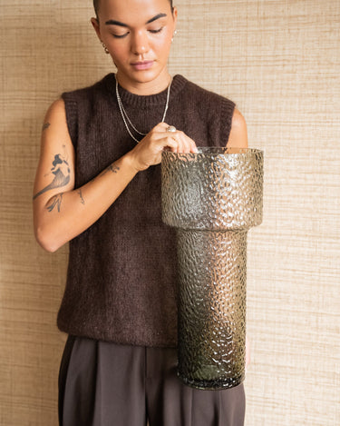 Diese stilvolle Vase aus grünem Glas fällt durch ihre besondere Form und strukturierte Oberfläche auf. Der hohe Hals und die breite Oberkante verleihen Beyta ein modernes, skulpturales Aussehen, das perfekt in ein minimalistisches oder zeitgenössisches Interieur passt. Tragen Sie es solo als Statement-Stück oder kombinieren Sie es mit ein paar verspielten Blumen für einen raffinierten Akzent.