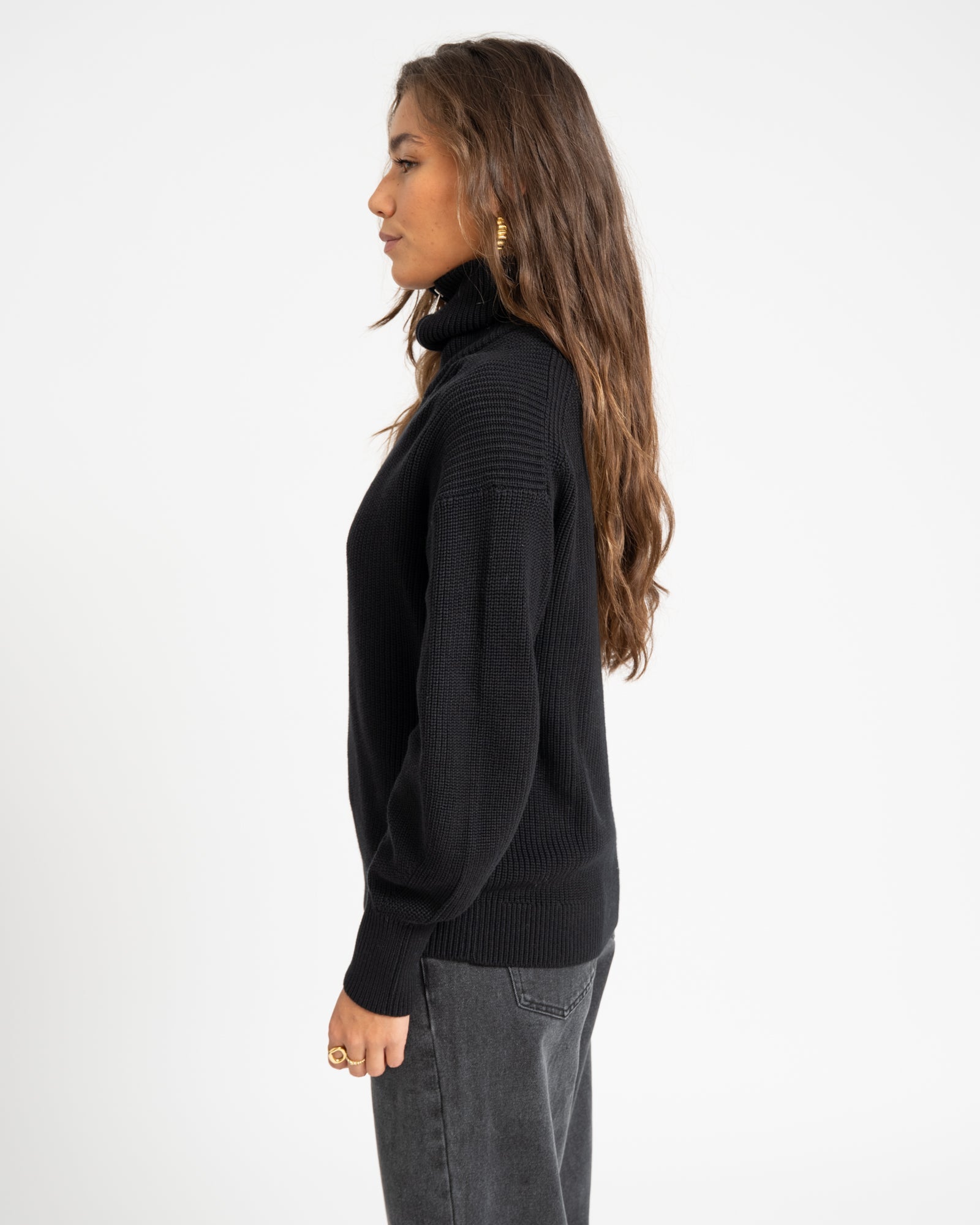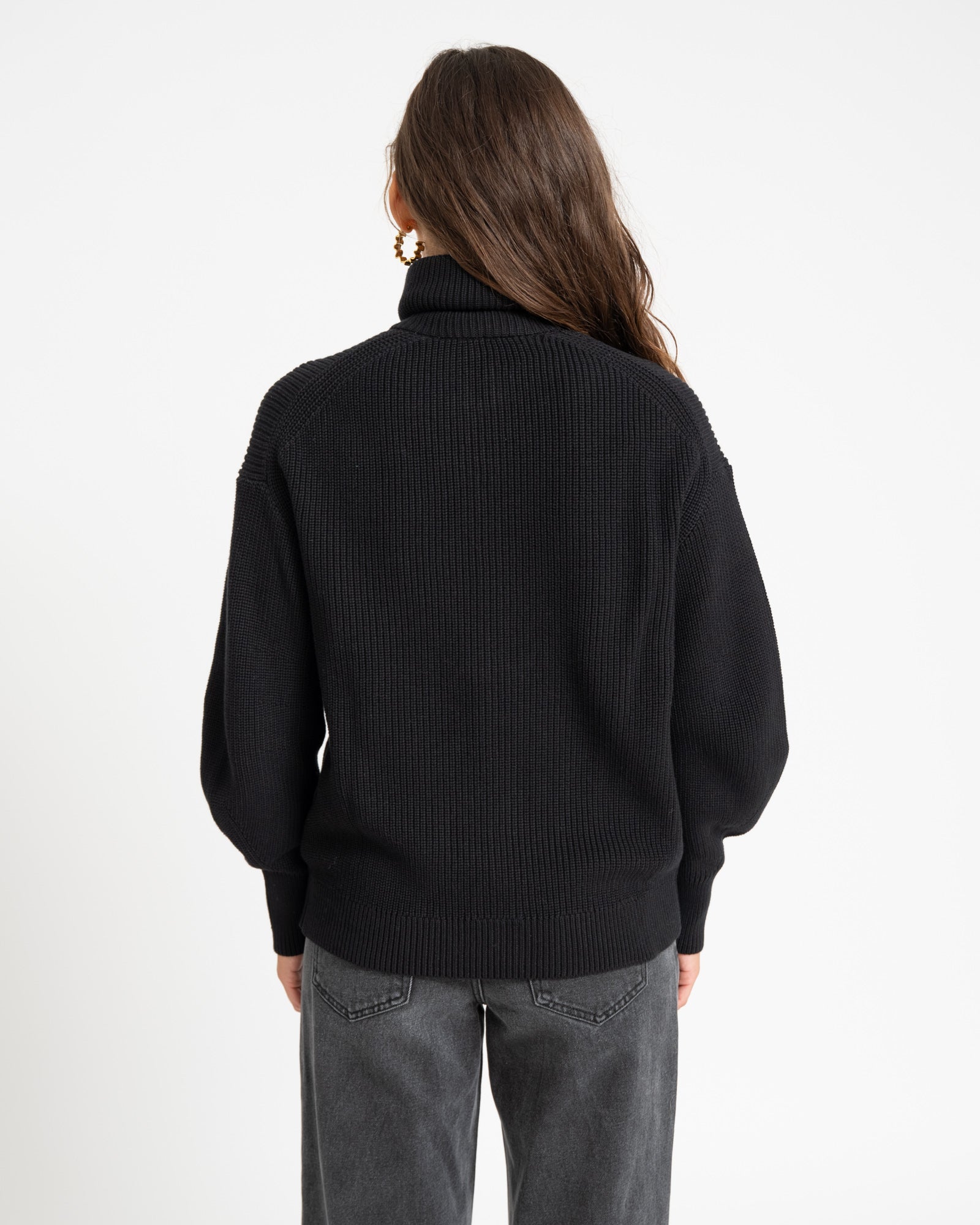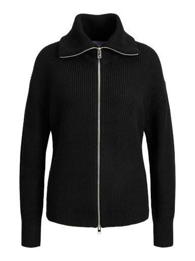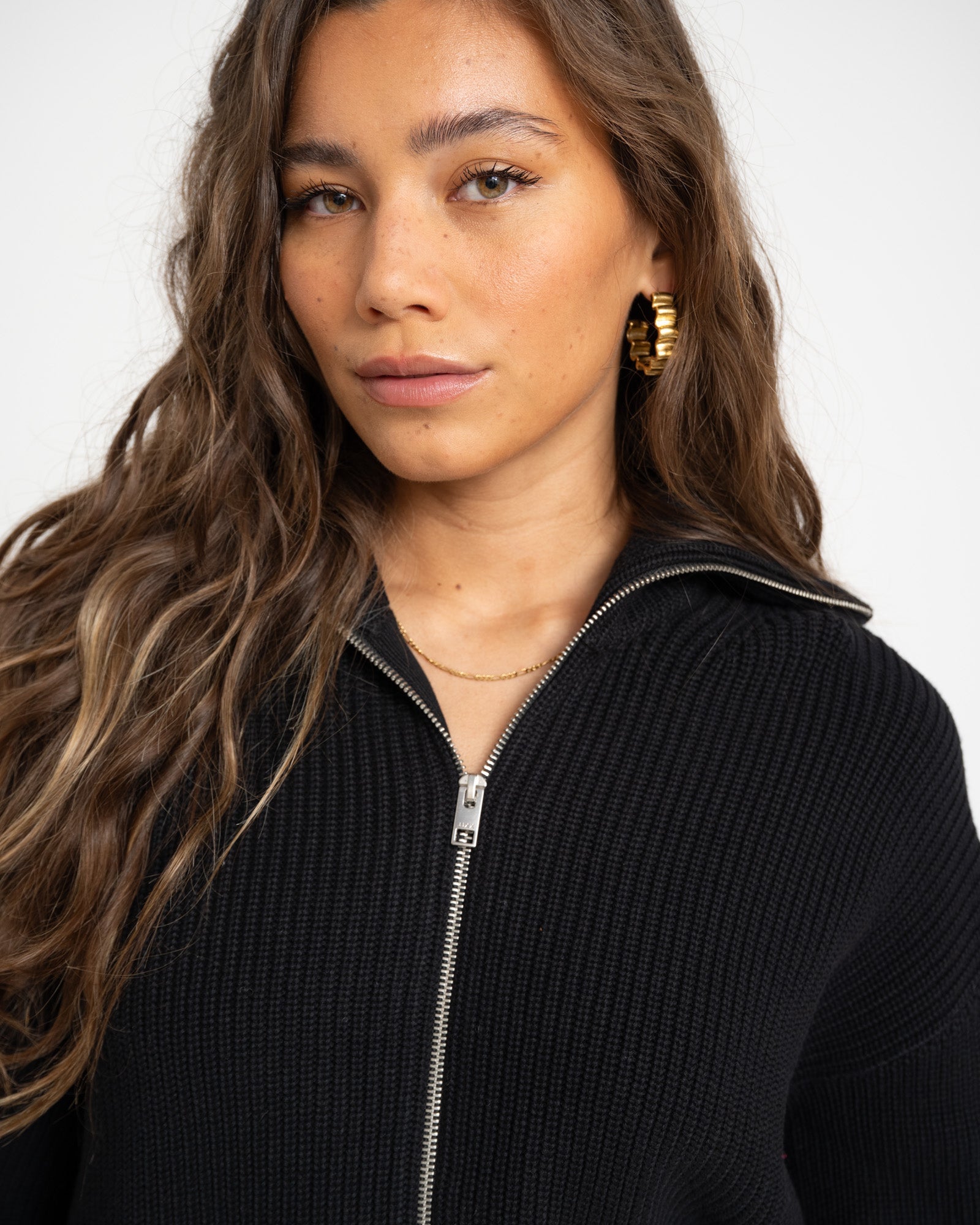 Der Strick, den Sie jeden Tag gerne tragen werden. Diese schwarze Strickjacke mit Reißverschluss hat eine lockere Passform und einen coolen hohen Halsausschnitt.
