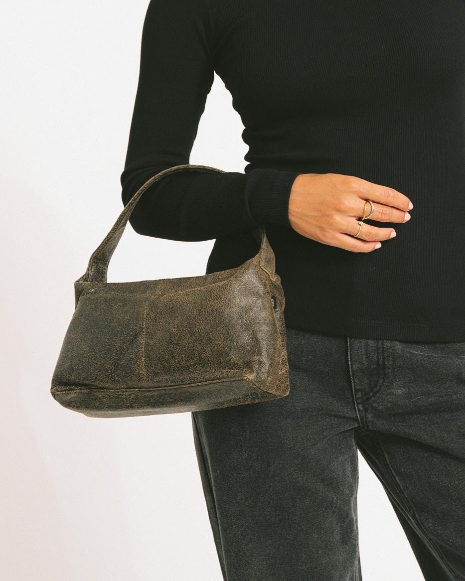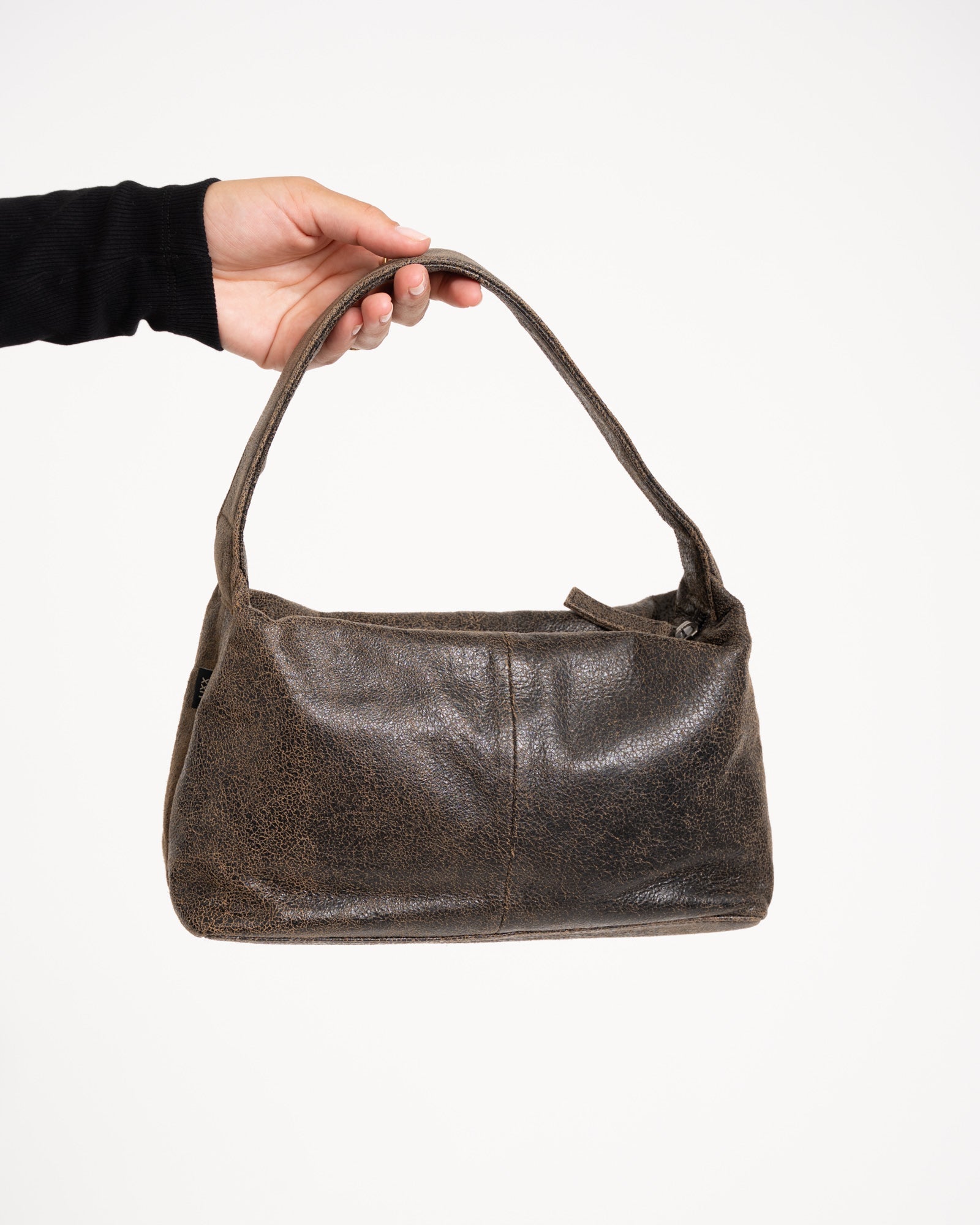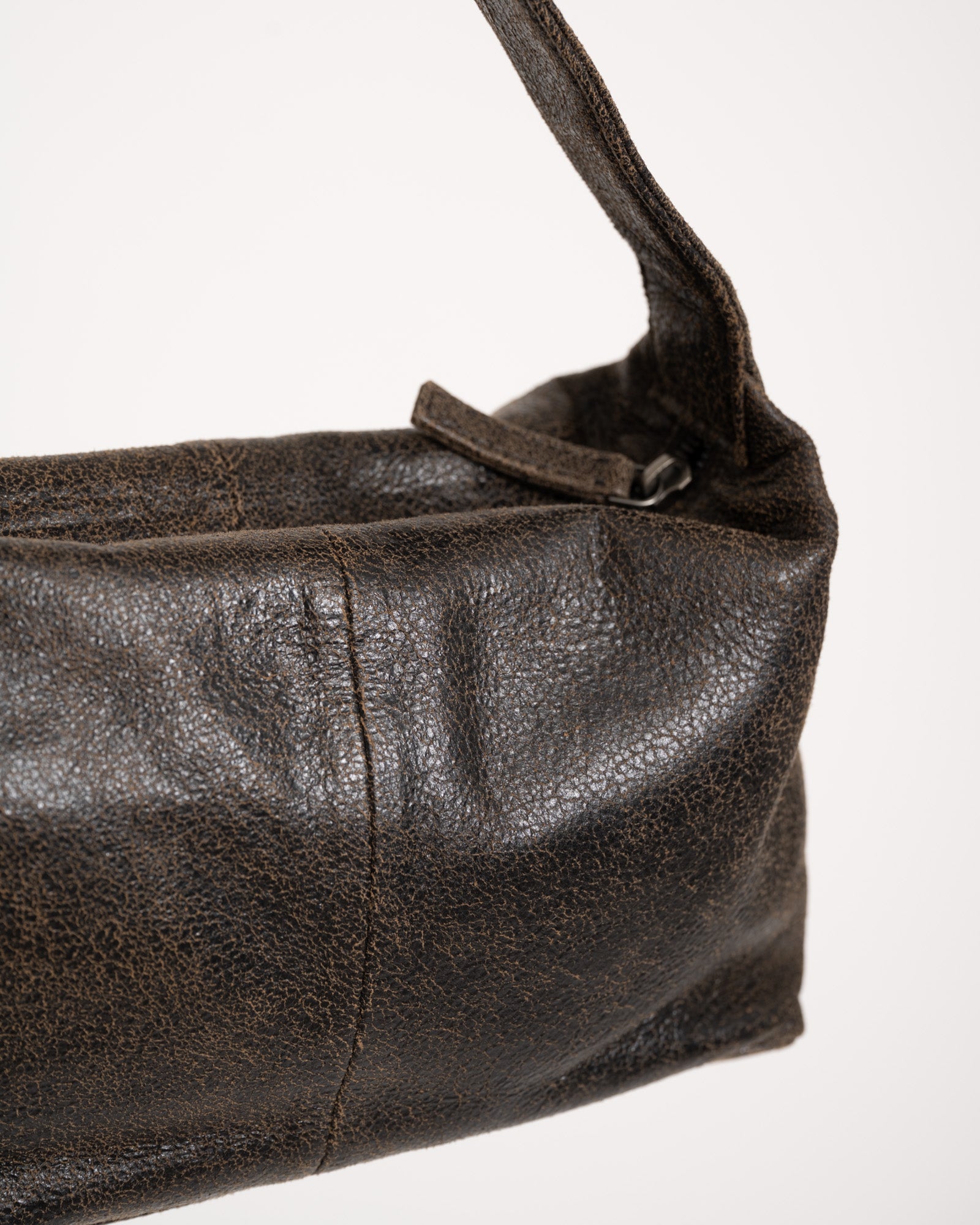Diese mittelgroße Tasche ist aus glänzendem strukturiertem Leder gefertigt und mit einem stilvollen geflochtenen Dutt versehen. Kompakt und dennoch geräumig genug für alle wichtigen Dinge des täglichen Bedarfs.