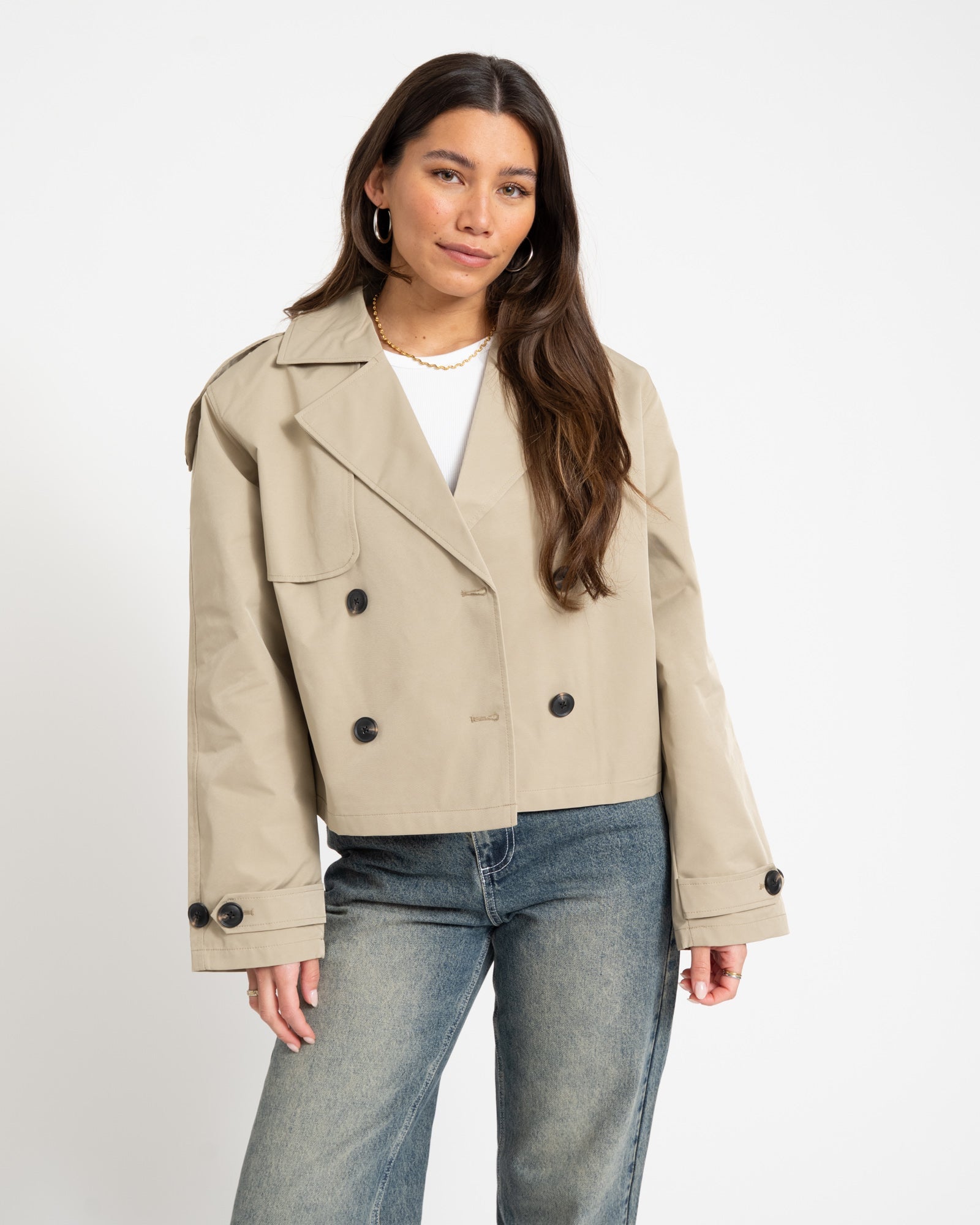 | Details | Knopfverschluss, Beschnitten, Wendbarer Kragen, Manschetten mit Knopf, Seitentaschen |