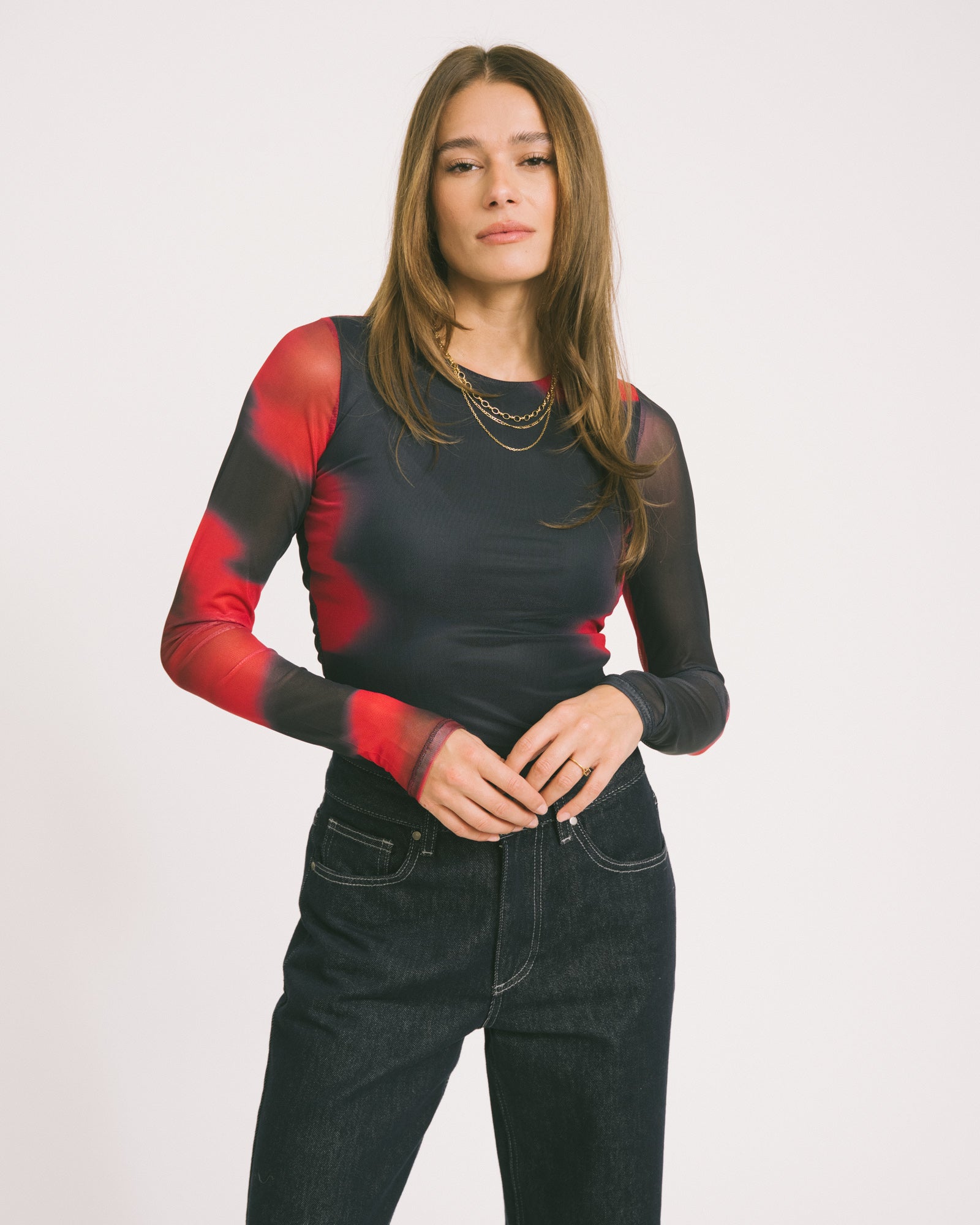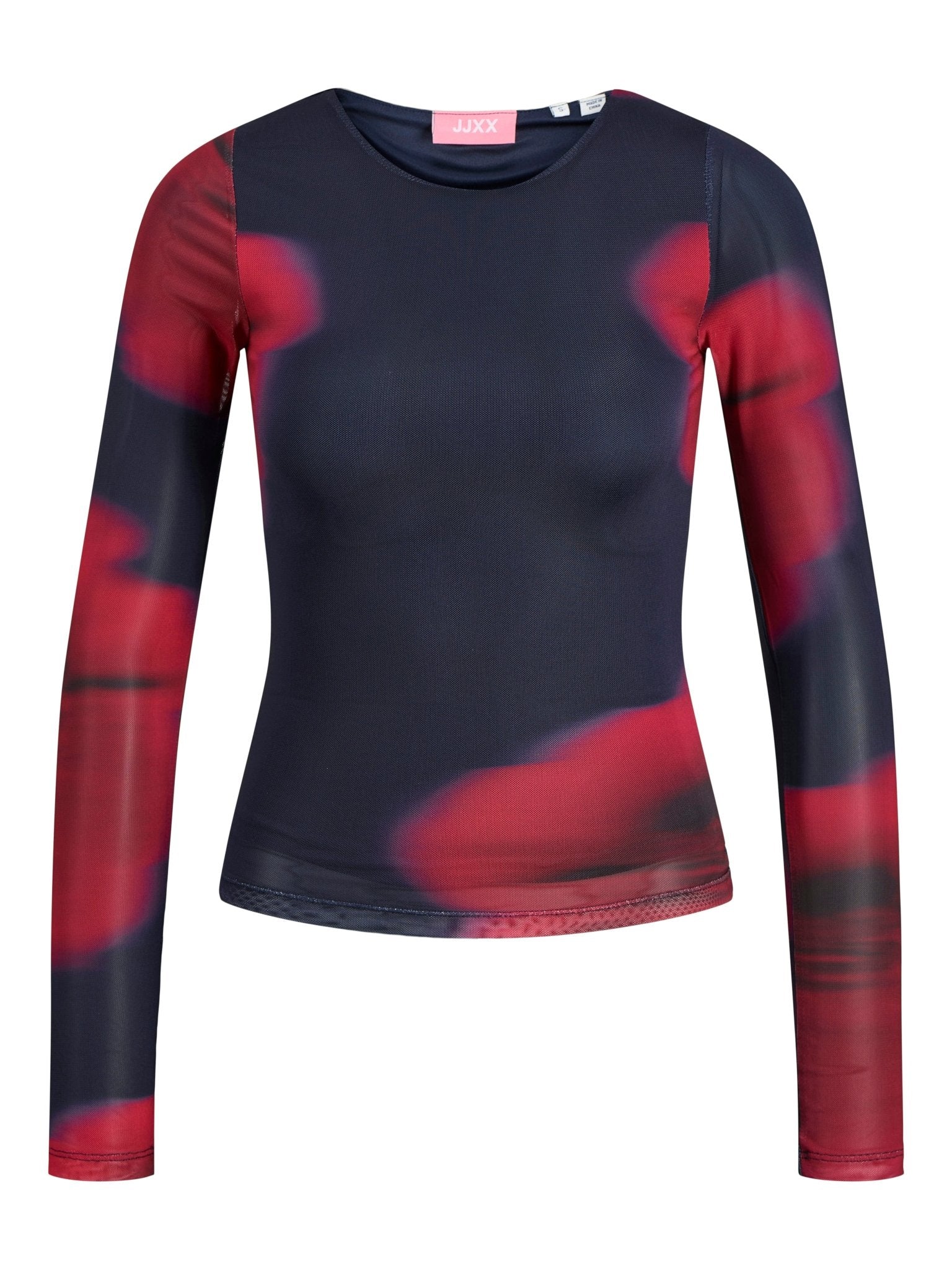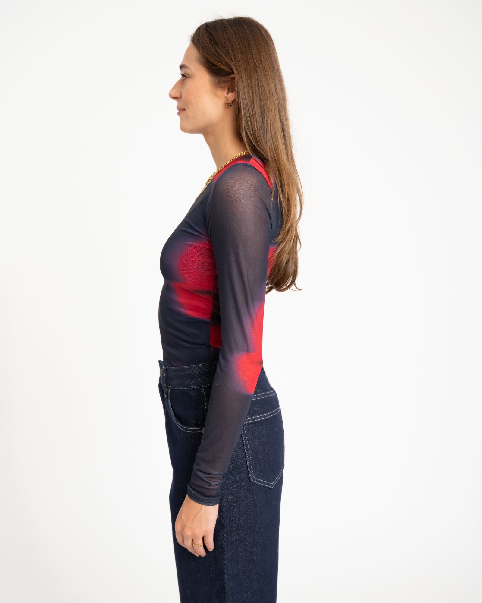 Dieses Langarmshirt besteht aus transparentem Mesh in tiefem Marineblau mit einem dezenten Blumendruck in Rottönen. Dank des taillierten Schnitts und des leichten Stretchanteils fühlt sich das Top angenehm und feminin an.