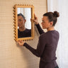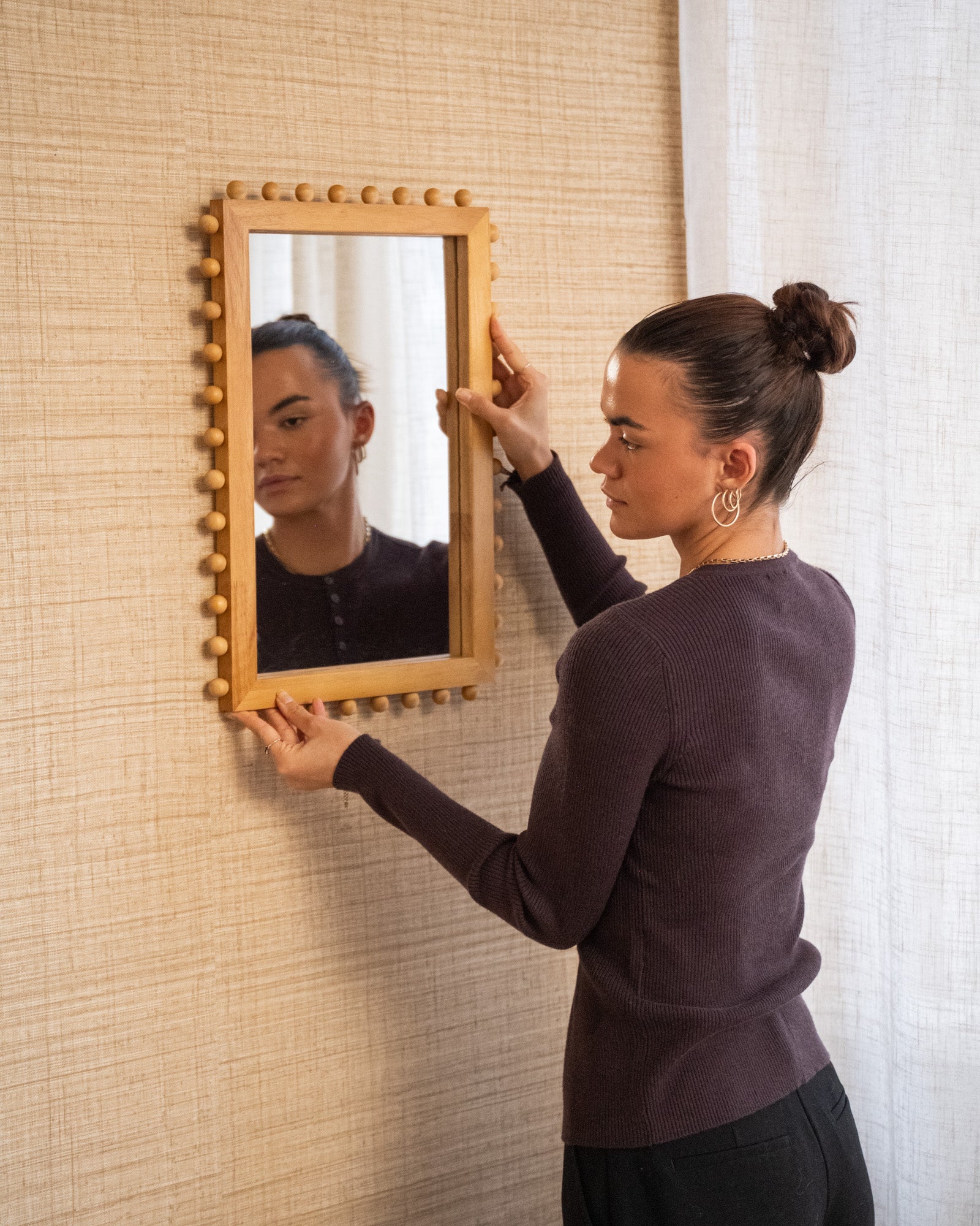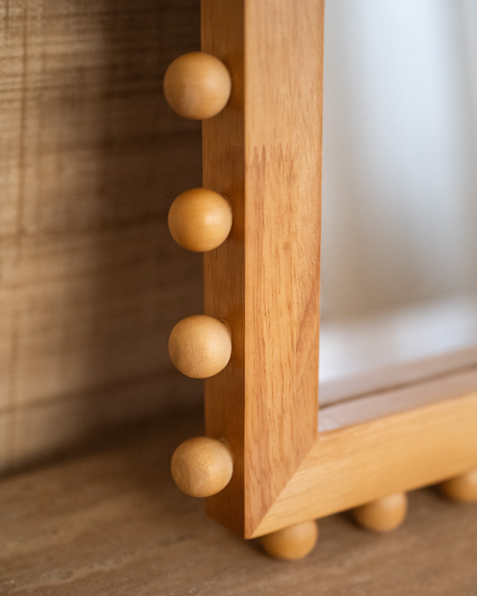 Mirror Beads Wood ist ein stilvoller Wandspiegel mit einem Holzrahmen, der mit verspielten, runden Holzelementen verziert ist. Das natürliche Holz sorgt für eine warme Atmosphäre und fügt sich perfekt in moderne, skandinavische oder japanische Einrichtungen ein. Ein dekorativer Blickfang, der jedem Raum Licht und Charakter verleiht.