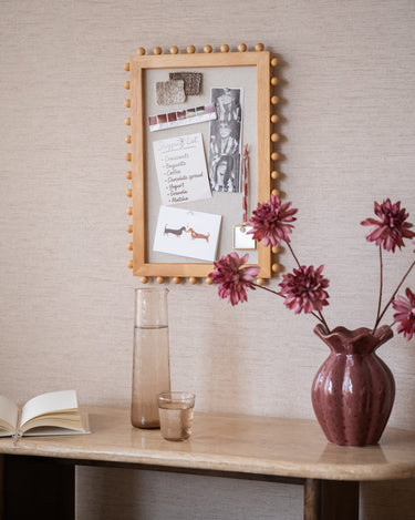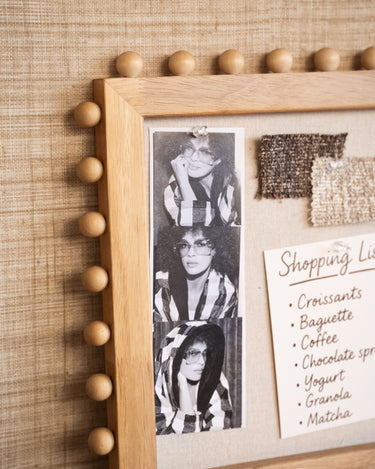 Pinboard Beads Wood ist eine dekorative Pinnwand, die Funktionalität und Design mühelos vereint. Die verspielten Perlen am Holzrahmen verleihen ihr eine weiche und natürliche Optik, während die beige Leinenoberfläche ideal für Fotos, Notizen, Inspirationskarten und To-do-Listen geeignet ist. Ob im Flur, Büro oder über dem Schreibtisch: Eine stilvolle Pinnwand, die Ihren täglichen Erinnerungen einen prominenten Platz bietet.