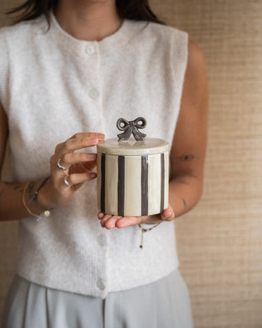 Das handgefertigte Vorratsglas „Bow“ ist ein dekoratives Vorratsglas mit zeitlosem Streifenmuster und einem verspielten Schleifendeckel. Die sanften, neutralen Farbtöne und die handgefertigte Optik machen es zur perfekten Ergänzung für ein warmes, stilvolles Interieur. Es eignet sich hervorragend zur Aufbewahrung in Küche und Bad oder als dekoratives Element auf Regal oder Kommode.