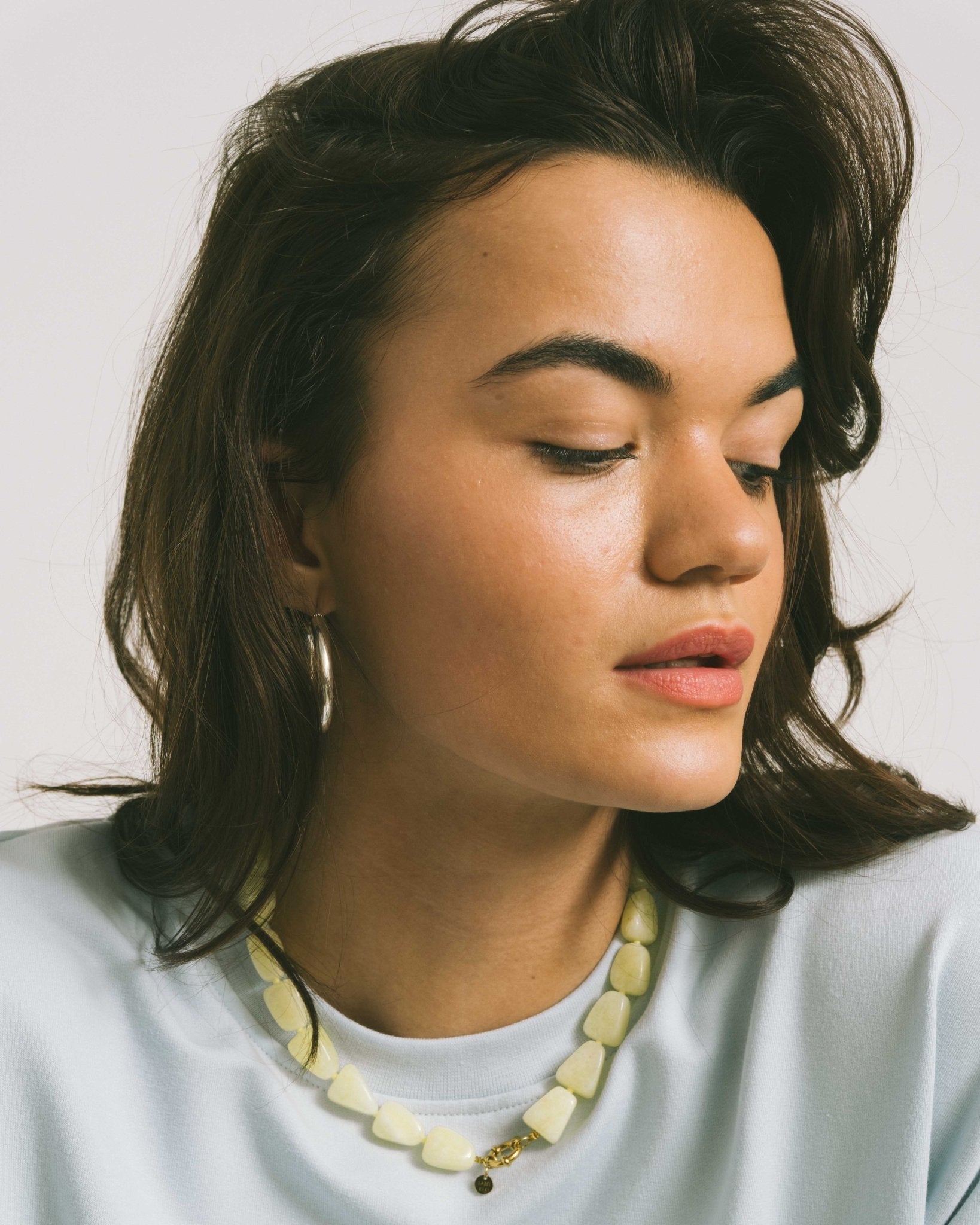 Diese Halskette mit ihren zarten, hellen Steinen wirkt ruhig und zugleich ausdrucksstark. Ein einzigartiges Schmuckstück, das mühelos ins Auge fällt und Ihrem Look natürliche Eleganz verleiht.