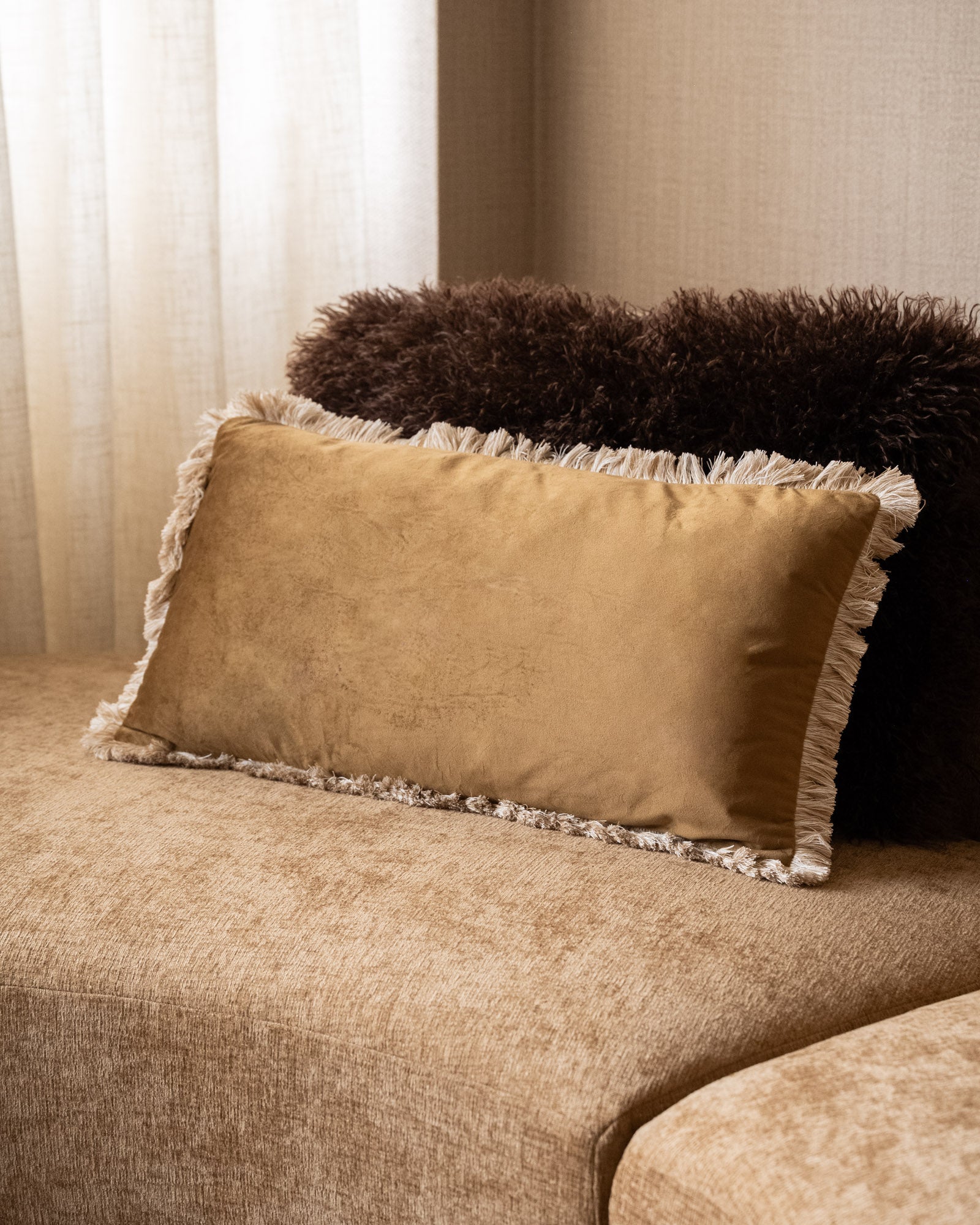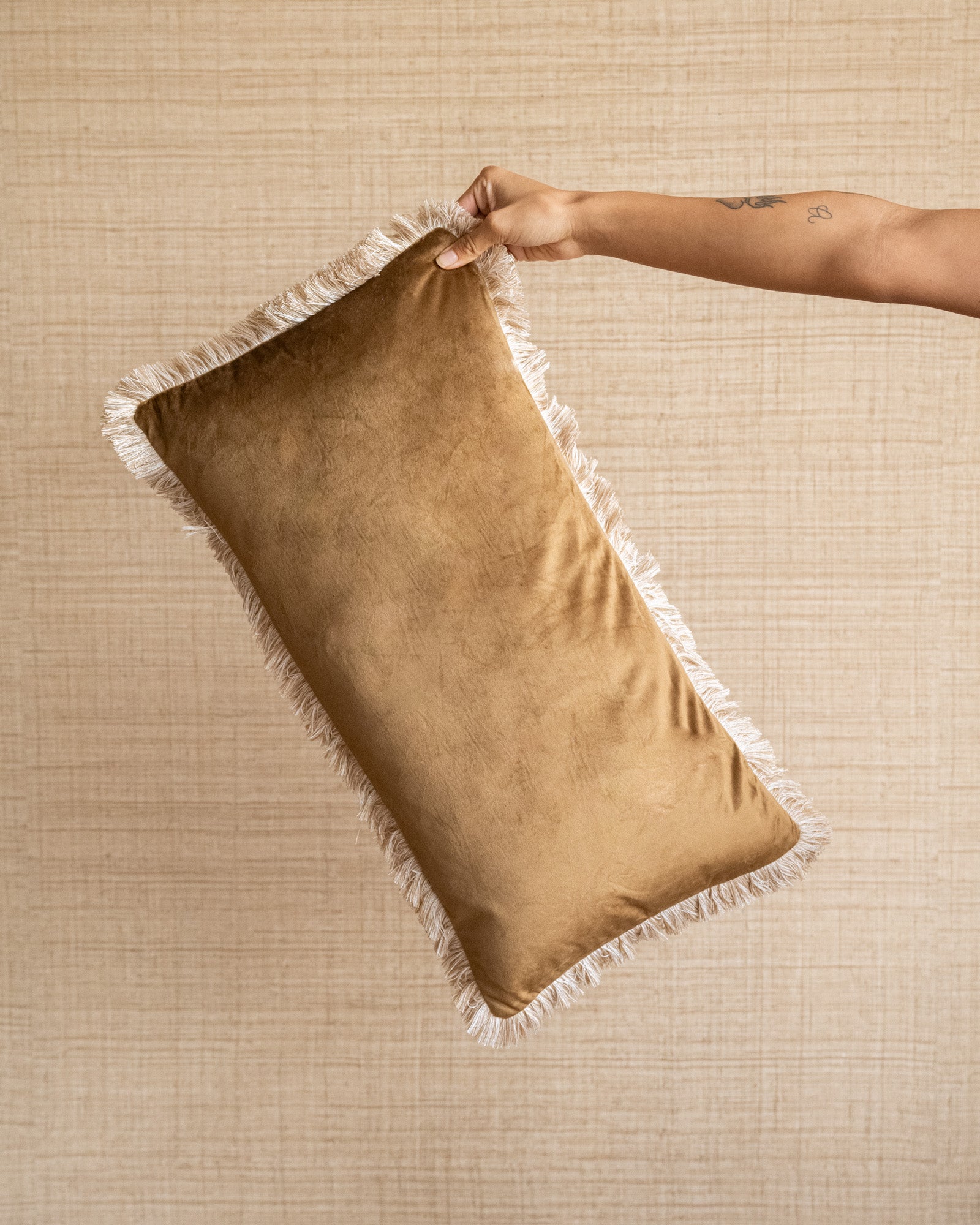 Voeg een vleugje zachtheid en elegantie toe aan je interieur met dit prachtige kussen van veloursachtige stof, afgewerkt met fijne franjes.