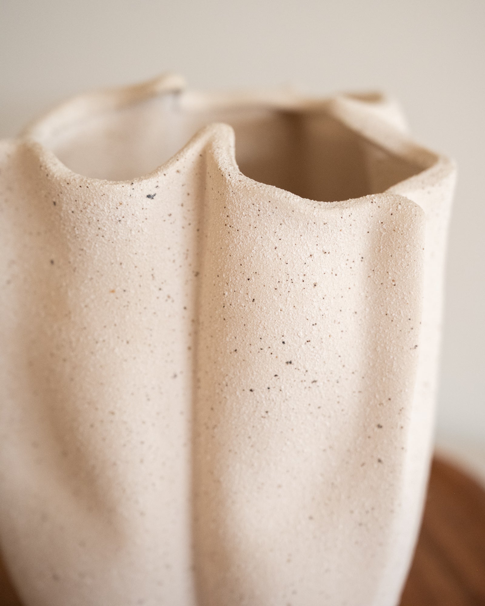 Dieser wunderschöne Topf ist aus feinem Steingut gefertigt und hat eine organische Form. Er eignet sich perfekt zur Aufbewahrung von Küchenutensilien oder als Vase für einen kleinen Blumenstrauß. Dank seines ruhigen Designs fügt es sich wunderbar in ein Japandi-Interieur ein.