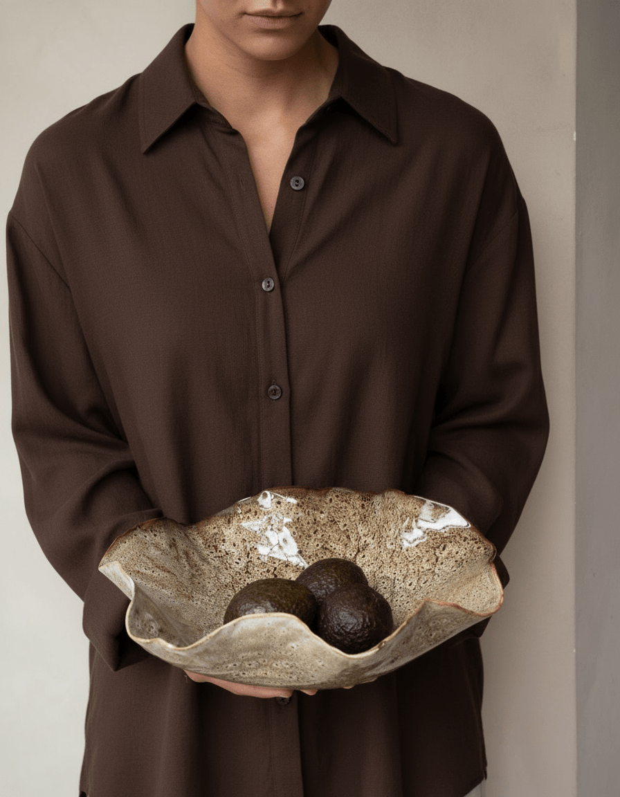 Organisch, einzigartig und voller Charakter. Die Banda Schale ist ein echter Hingucker für Ihren Tisch oder Ihr Sideboard. Hergestellt aus Keramik mit glänzender, lavaartiger Oberfläche und einem gewellten Rand, der an natürliche Formen erinnert. Perfekt zum Dekorieren von Obst und Gemüse oder einfach als Dekorationsobjekt.